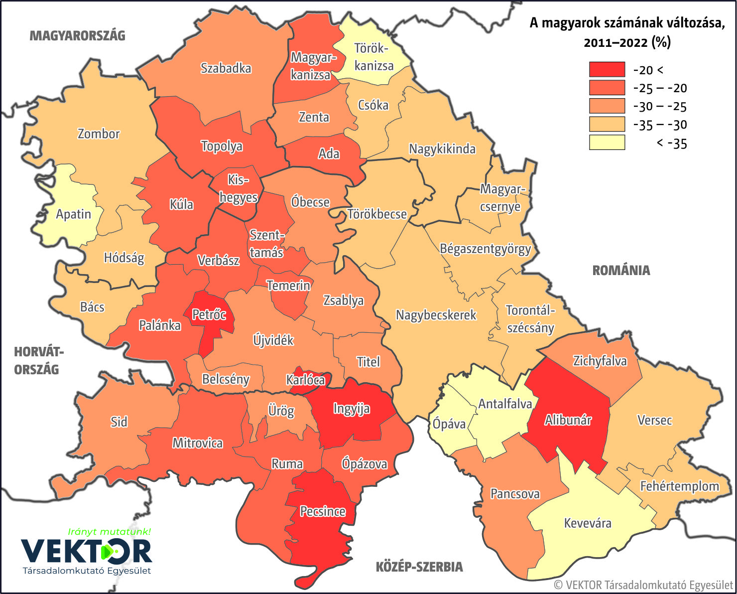 Ennek eredményét tükrözi a 2022-es népszámlálás is. 2011-hez képest a magyar nemzetiségű lakosság száma 69 ezer fővel (27%-kal) csökkent, ami jelentősen meghaladja a többi külhoni magyar közösség létszámváltozásának mértékét – leszámítva a horvátországi magyarokét, akiknek körében ugyanekkora mértékű csökkenést regisztráltak. Ugyanakkor a többi vajdasági kisebbséghez képest e csökkenés mértéke nem kiugró, hiszen mindegyik hagyományos kisebbség legalább 20%-kal fogyott. A magyar anyanyelvűek száma azonban még ennél is nagyobb mértékben, 30%-kal csökkent.