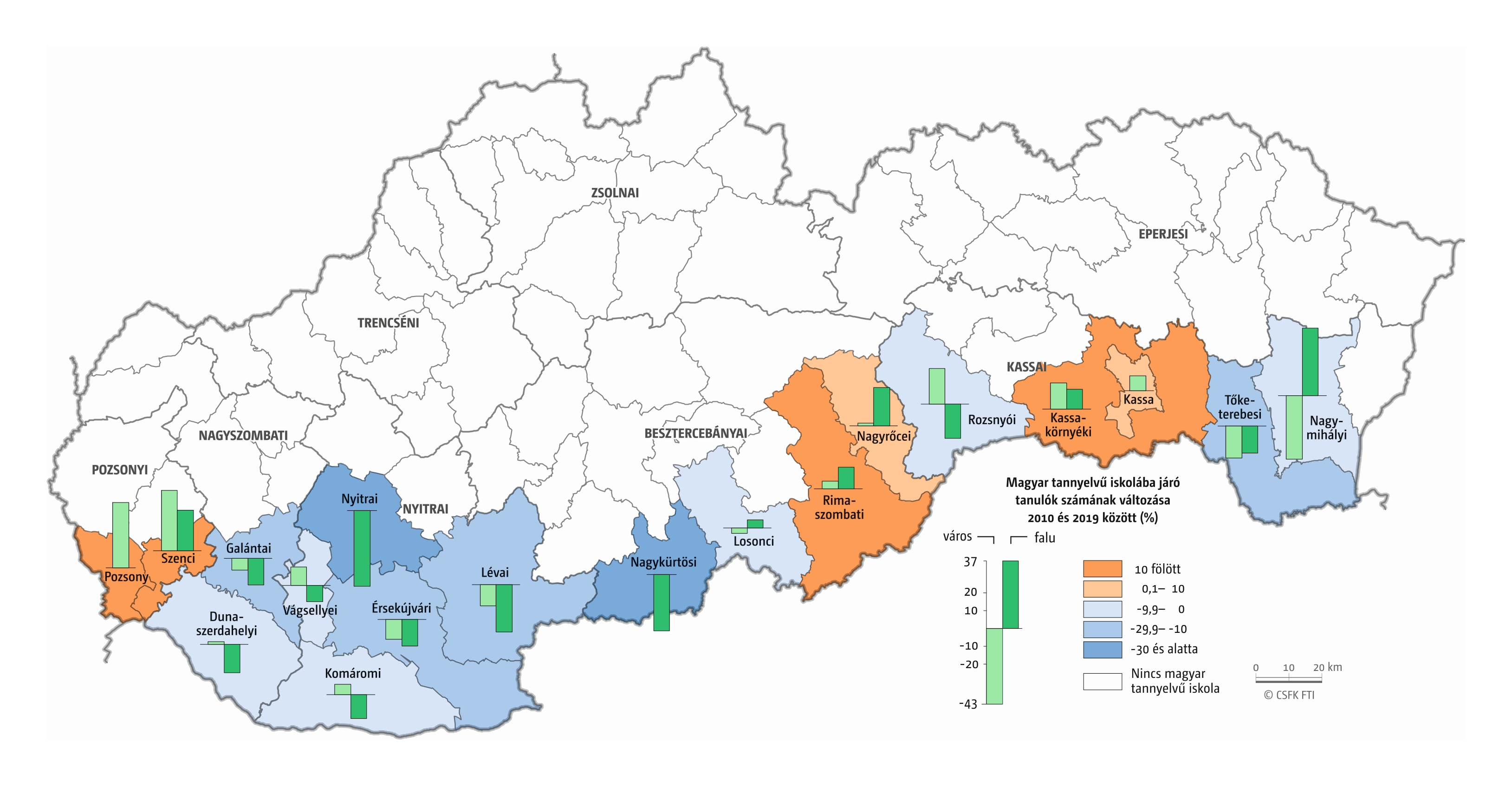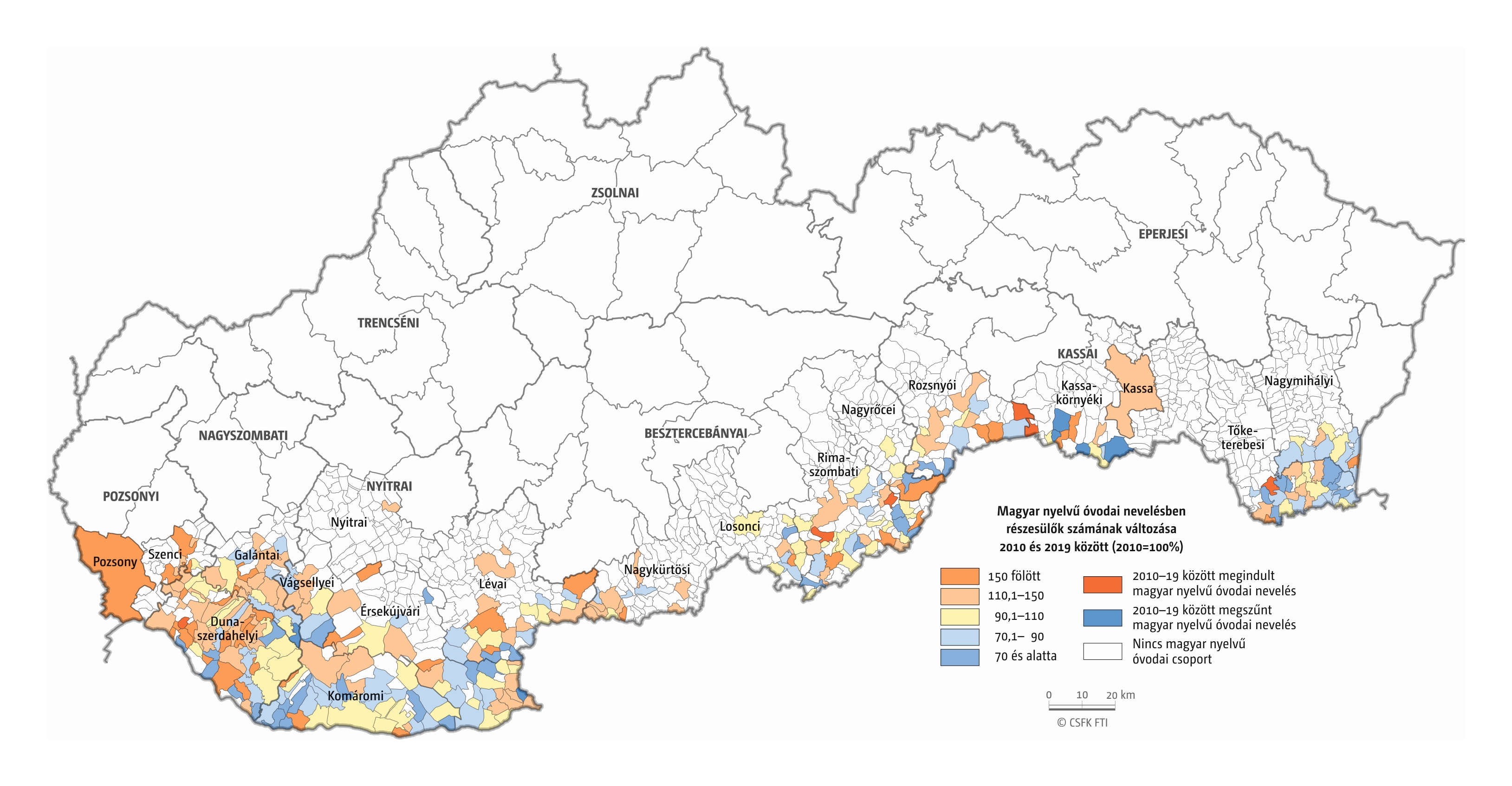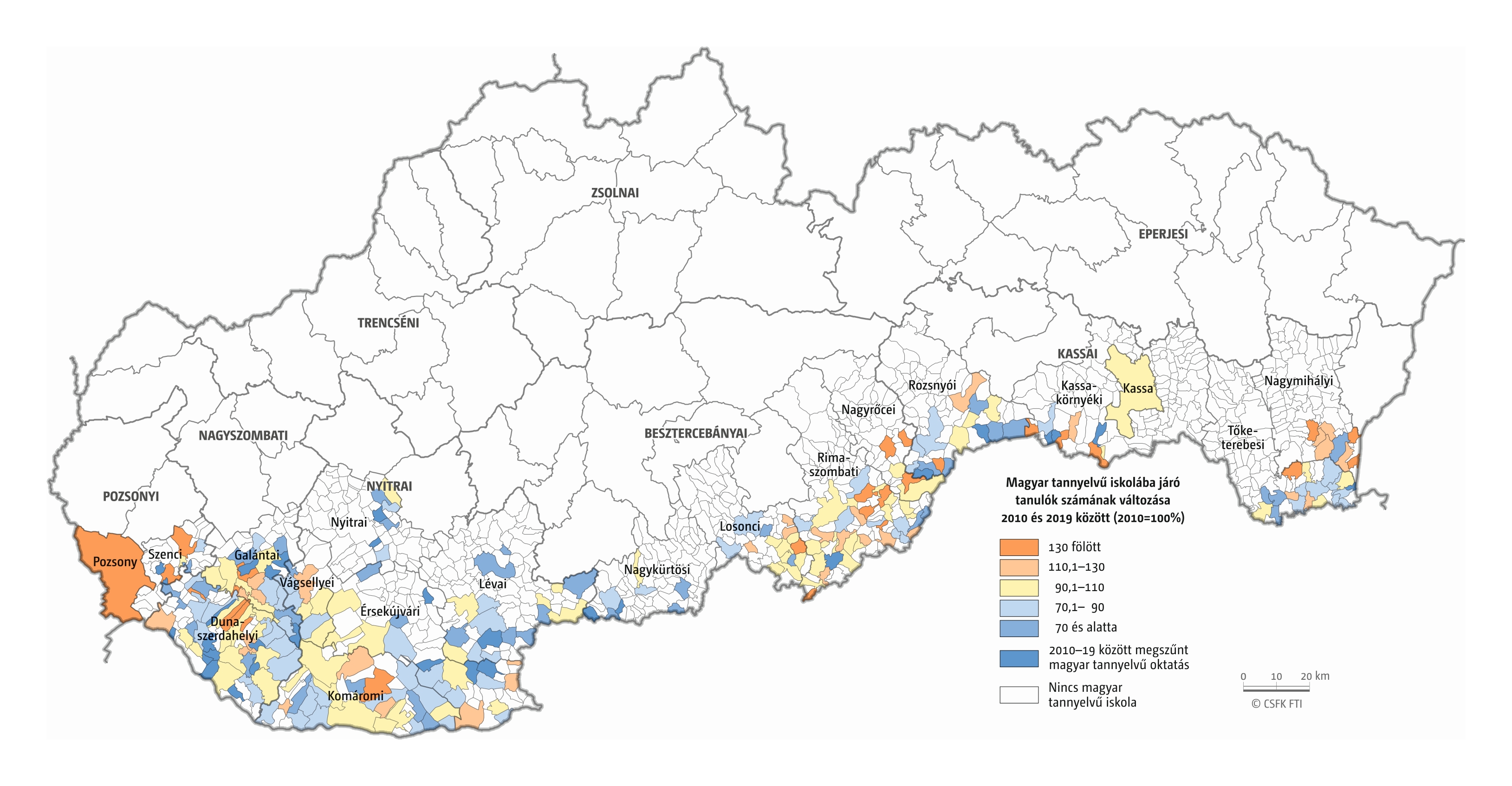 A települési szintű adatok értelmezésénél fontos figyelembe venni, hogy minél feljebb megyünk az oktatási szinteken, annál koncentráltabban jelennek meg a magyar diákok. Míg óvoda a legtöbb magyarlakta településen működik, addig a kistelepülések gyakran már nem tudnak eltartani egy általános iskolát, a középiskolák pedig többnyire városokban találhatók. Kivételek természetesen bőven találhatók: a Nyitrai járásban például 2011-ben 9 ezer magyarra egyetlen magyar óvoda, a koloni jutott, míg iskolából ekkor még hét is volt. De ugyanilyen meglepő, hogy a 2011-ben több mint kétezer magyar anyanyelvűnek otthont adó Tornában sincs magyar nyelvű óvoda, de magyar általános iskola igen.