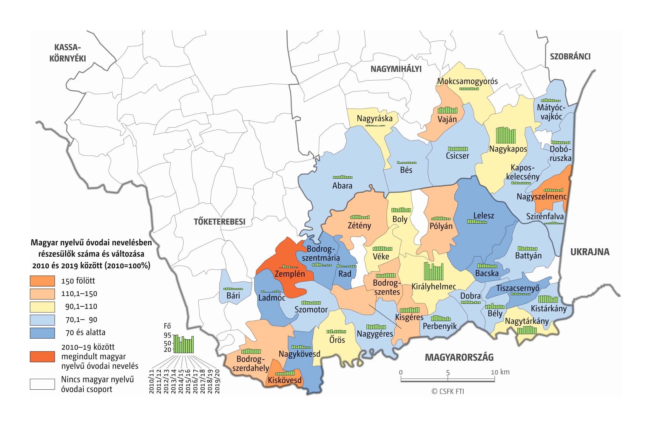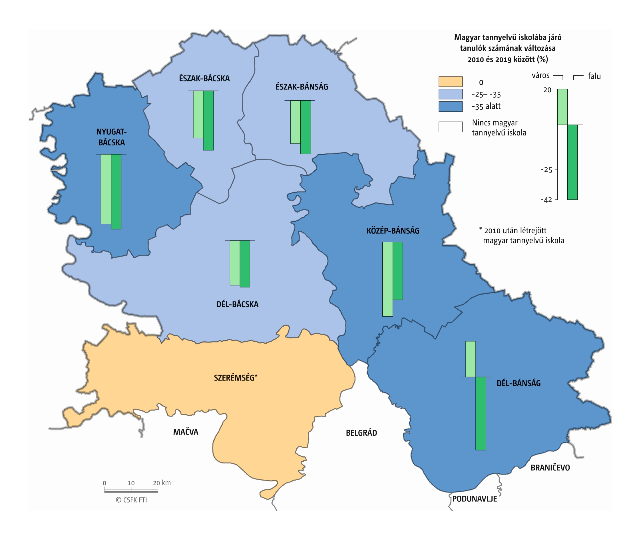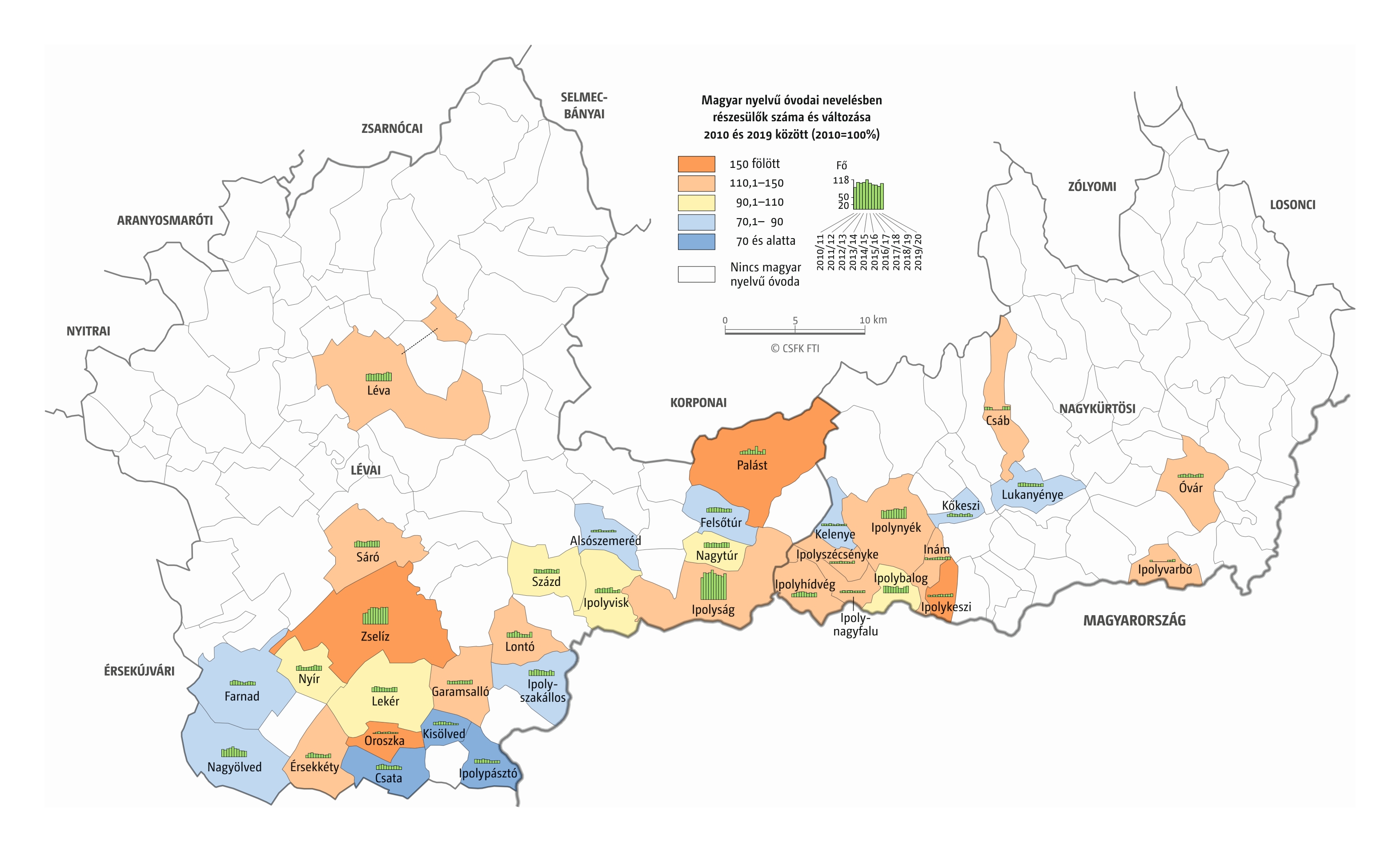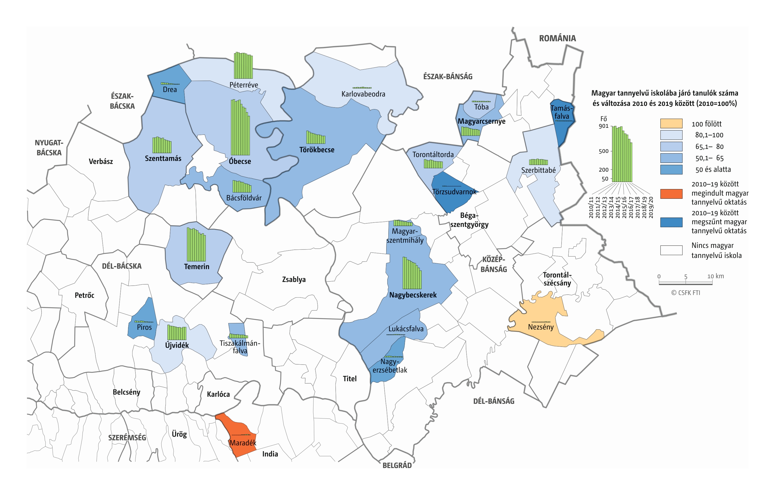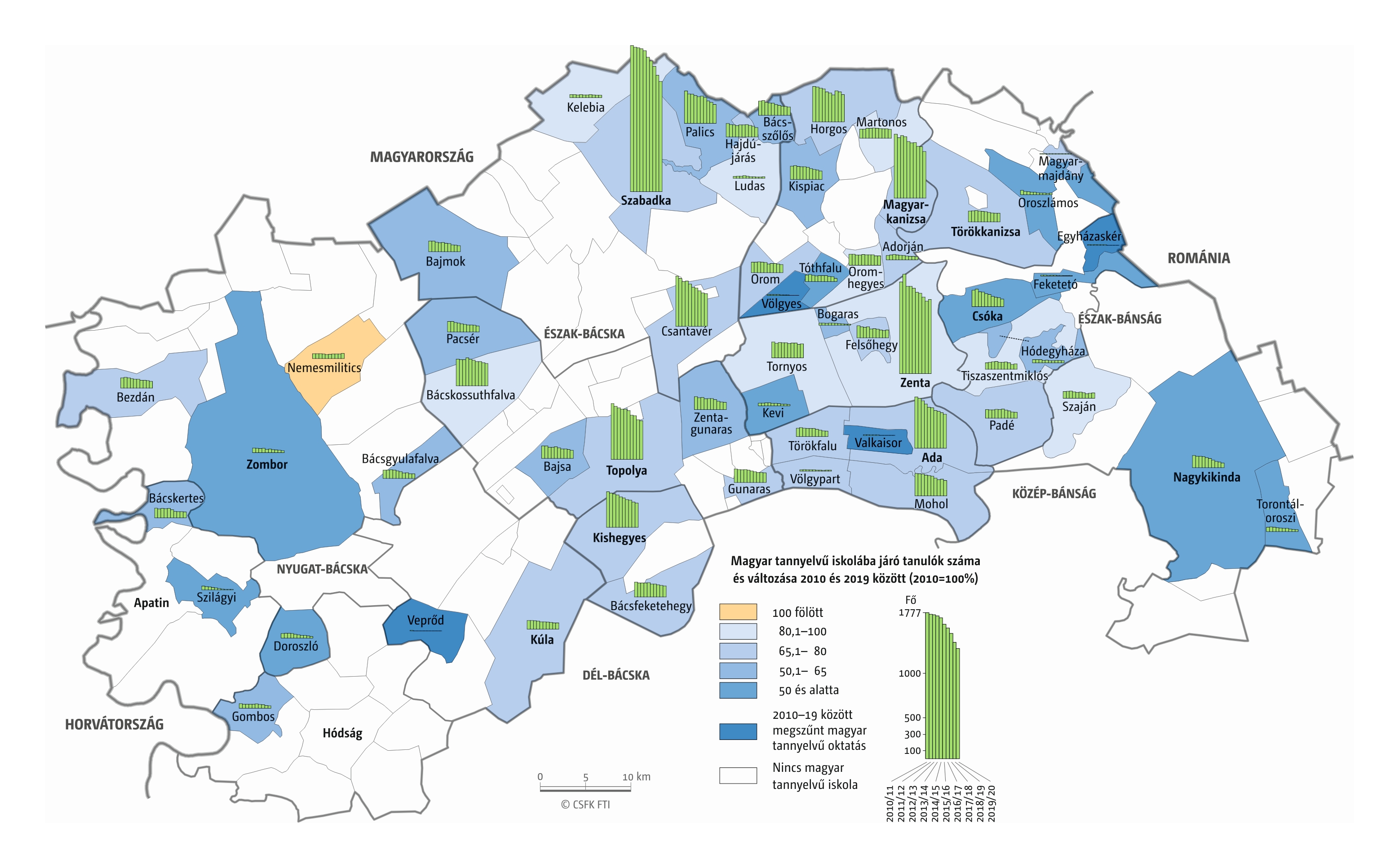 Fontos megjegyeznünk, hogy ha az első vagy az utolsó év kiugró értéket mutat a települési szinten bemutatott változások esetében, vagy ha nagyon alacsony a gyereklétszám (és emiatt már egy-két gyerek megjelenése/eltűnése alapvetően befolyásolja a százalékos változást mutató adatokat), az jelentősen torzíthatja a folyamatok értelmezését, vizualizációját. Ennek kiküszöbölésére a legtöbb esetben kiválóan alkalmasak a járási/megyei szintre aggregált adatok, amelyek általában több iskola adatait összesítik, illetve együtt jelenítik meg funkcionálisan összetartozó térségek (pl. város és vonzáskörzete) adatait. Kivételt jelentenek ez alól azok a szórványterületek, ahol egy járásban/megyében/körzetben mindössze egy-két intézmény adata jelenik meg (pl. a Szerémségben az egyetlen magyar iskola Maradékon található, ahol 2015 és 2019 között a tanulók száma 5 és 10 fő között mozgott). Ugyanígy a trendek érzékeltetését szolgálják azok a részletesebb, egy-egy kistérségre fókuszáló települési szintű térképek, ahol oszlopdiagramokon ábrázoltuk a vizsgált időszak minden évének tanulói létszámát. Ez utóbbi minden vizsgált országra mind az óvodai, mind az általános iskolai szintre elkészült, leszámítva a kárpátaljai óvodákat, ahol a kevés rendelkezésre álló adat miatt ilyen térképek nem készültek.