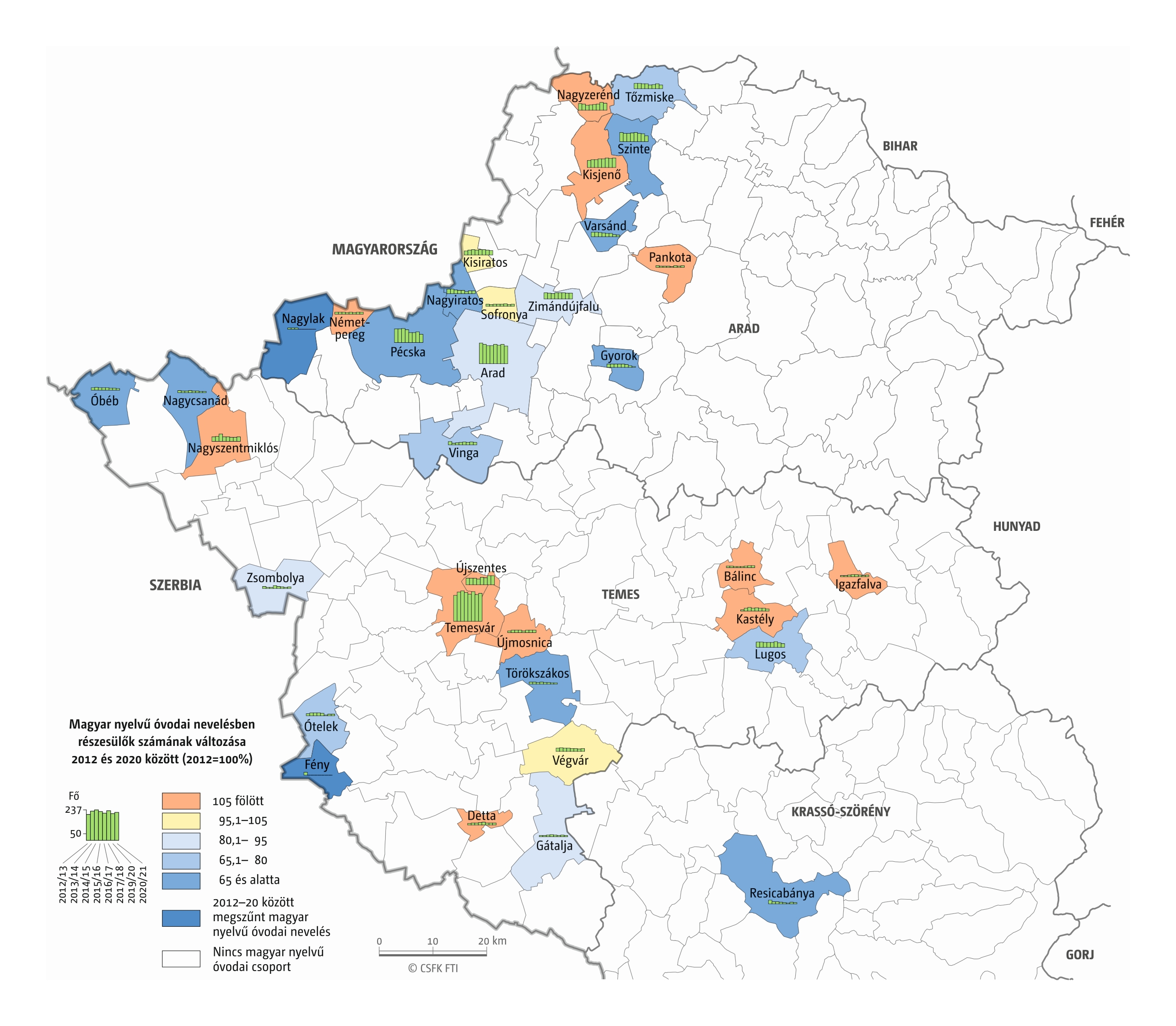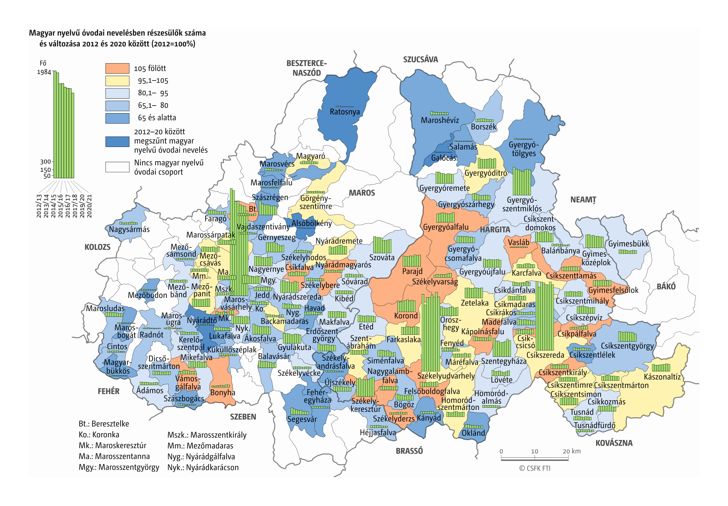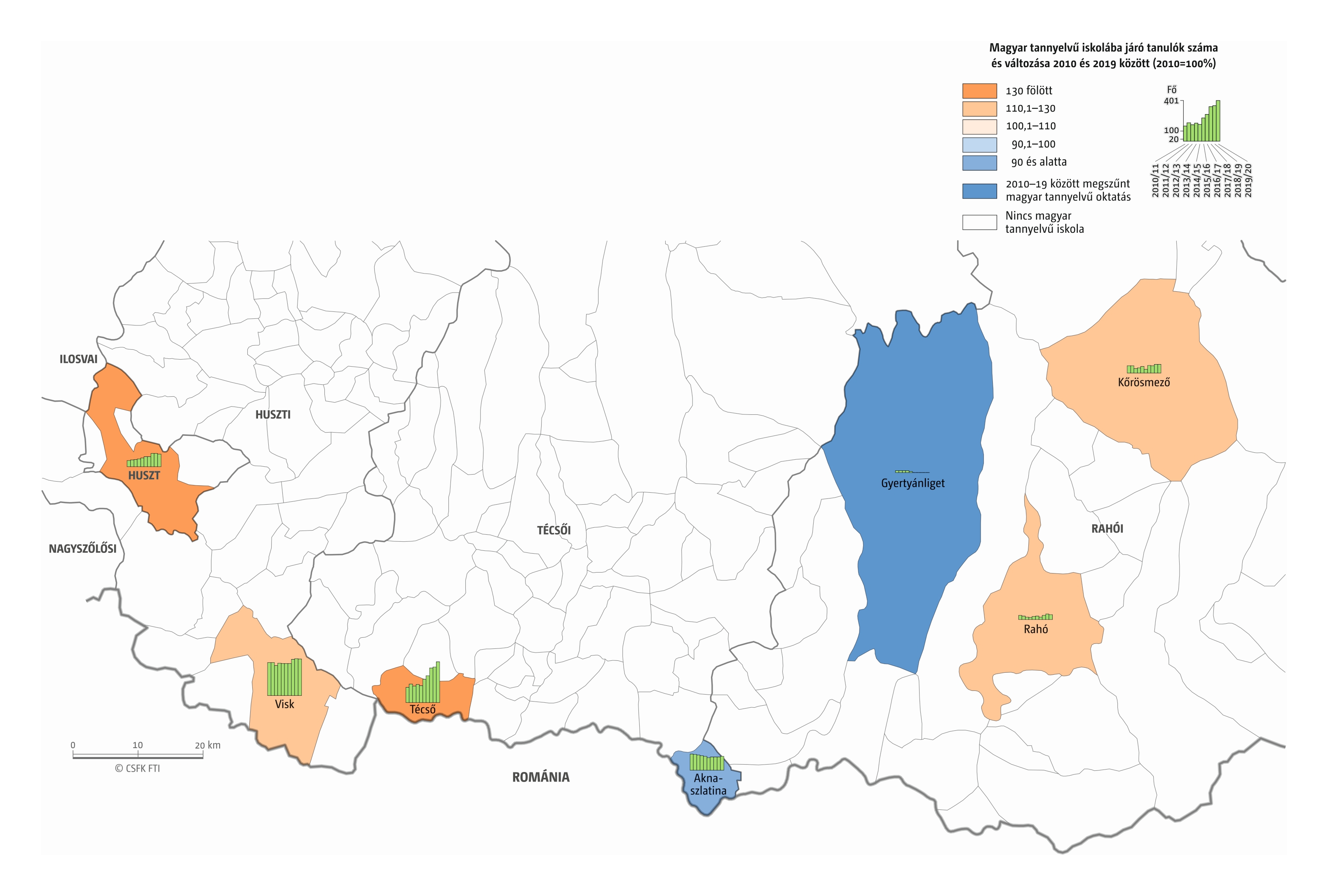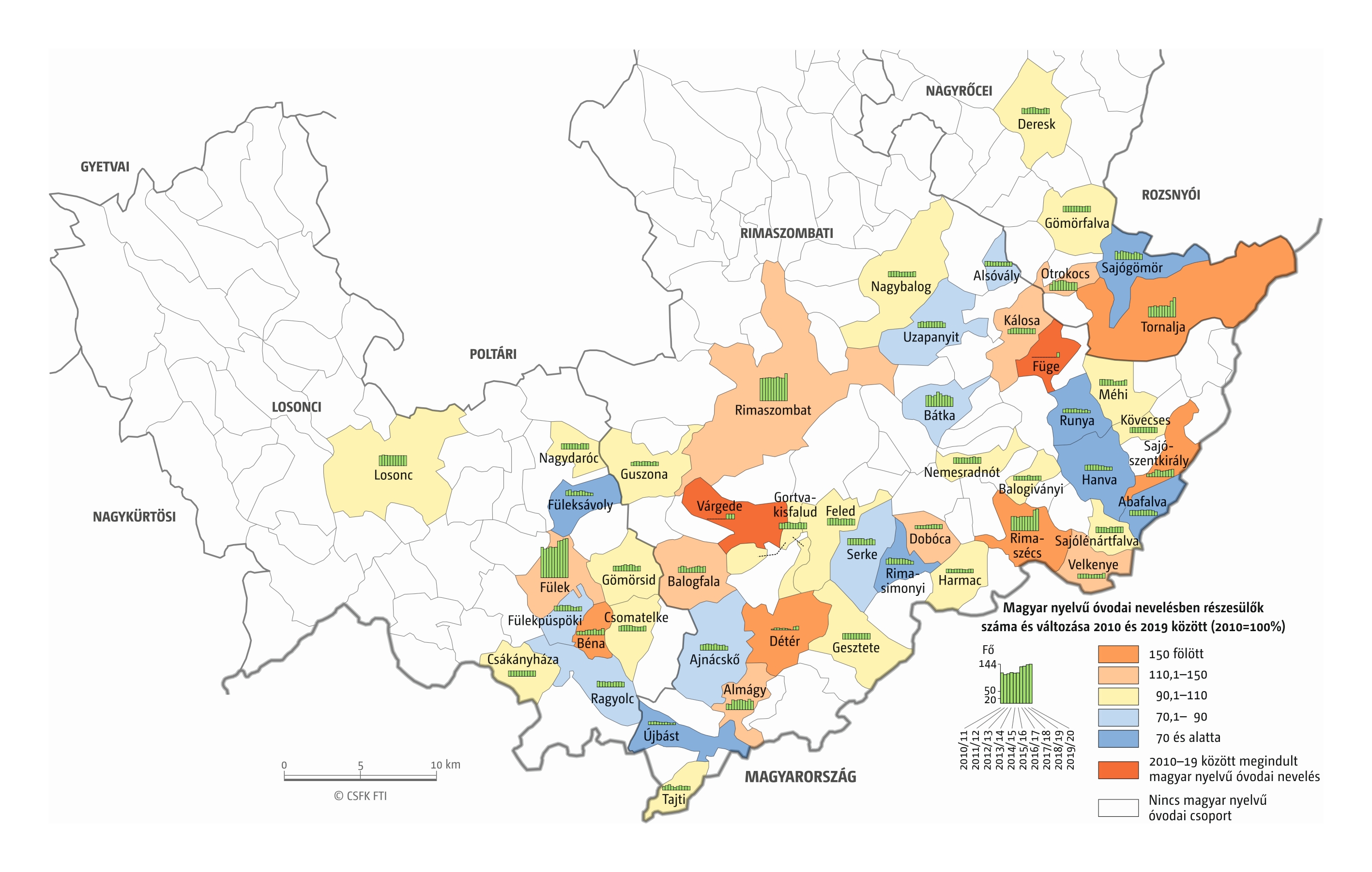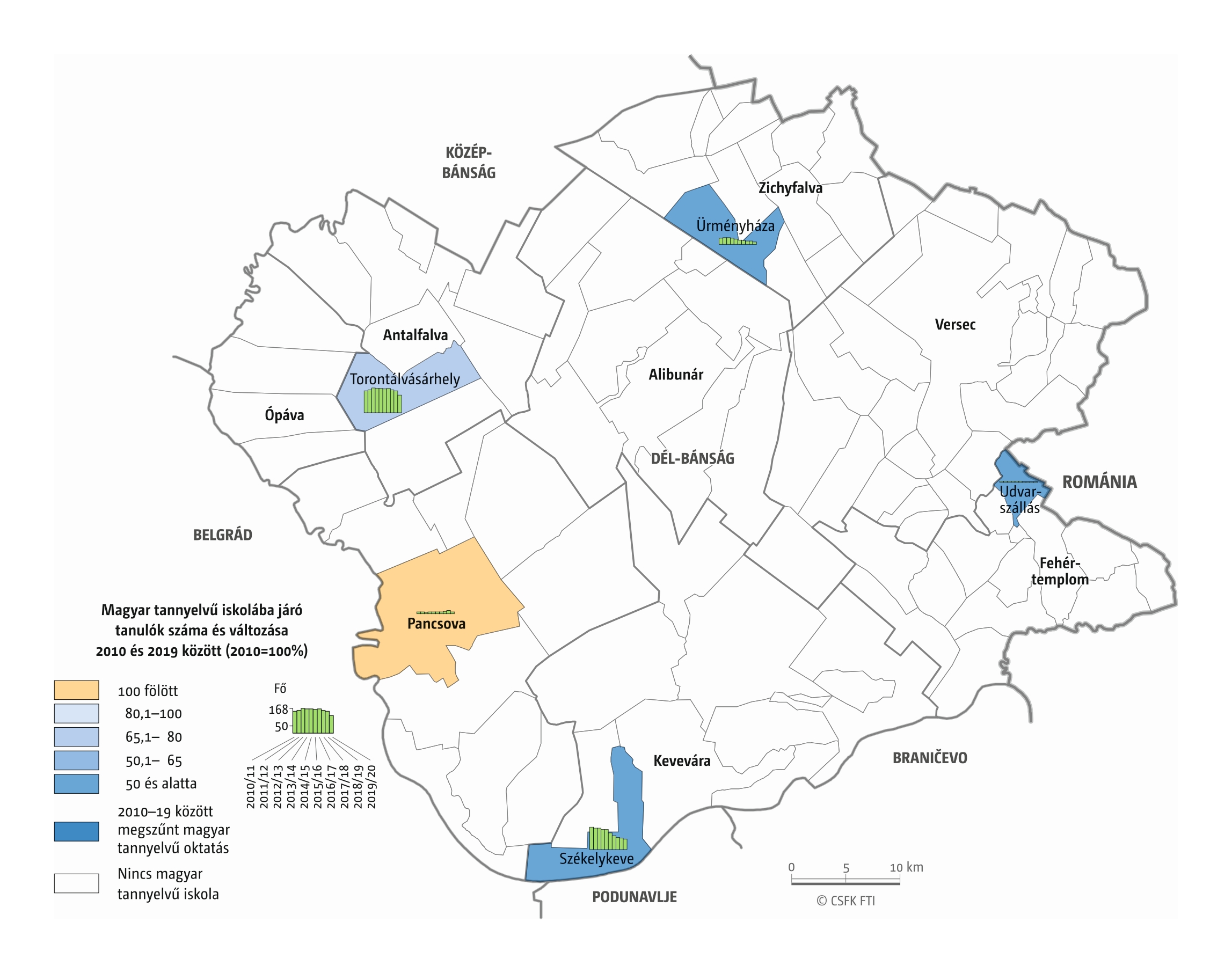 Fontos megjegyeznünk, hogy ha az első vagy az utolsó év kiugró értéket mutat a települési szinten bemutatott változások esetében, vagy ha nagyon alacsony a gyereklétszám (és emiatt már egy-két gyerek megjelenése/eltűnése alapvetően befolyásolja a százalékos változást mutató adatokat), az jelentősen torzíthatja a folyamatok értelmezését, vizualizációját. Ennek kiküszöbölésére a legtöbb esetben kiválóan alkalmasak a járási/megyei szintre aggregált adatok, amelyek általában több iskola adatait összesítik, illetve együtt jelenítik meg funkcionálisan összetartozó térségek (pl. város és vonzáskörzete) adatait. Kivételt jelentenek ez alól azok a szórványterületek, ahol egy járásban/megyében/körzetben mindössze egy-két intézmény adata jelenik meg (pl. a Szerémségben az egyetlen magyar iskola Maradékon található, ahol 2015 és 2019 között a tanulók száma 5 és 10 fő között mozgott). Ugyanígy a trendek érzékeltetését szolgálják azok a részletesebb, egy-egy kistérségre fókuszáló települési szintű térképek, ahol oszlopdiagramokon ábrázoltuk a vizsgált időszak minden évének tanulói létszámát. Ez utóbbi minden vizsgált országra mind az óvodai, mind az általános iskolai szintre elkészült, leszámítva a kárpátaljai óvodákat, ahol a kevés rendelkezésre álló adat miatt ilyen térképek nem készültek.