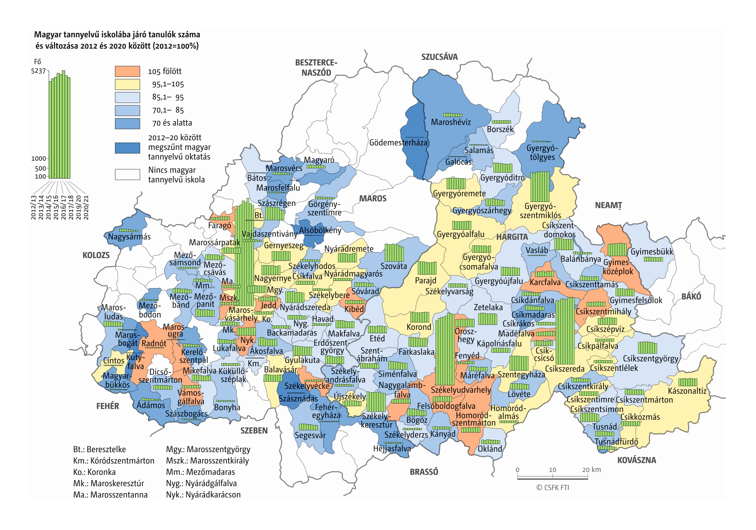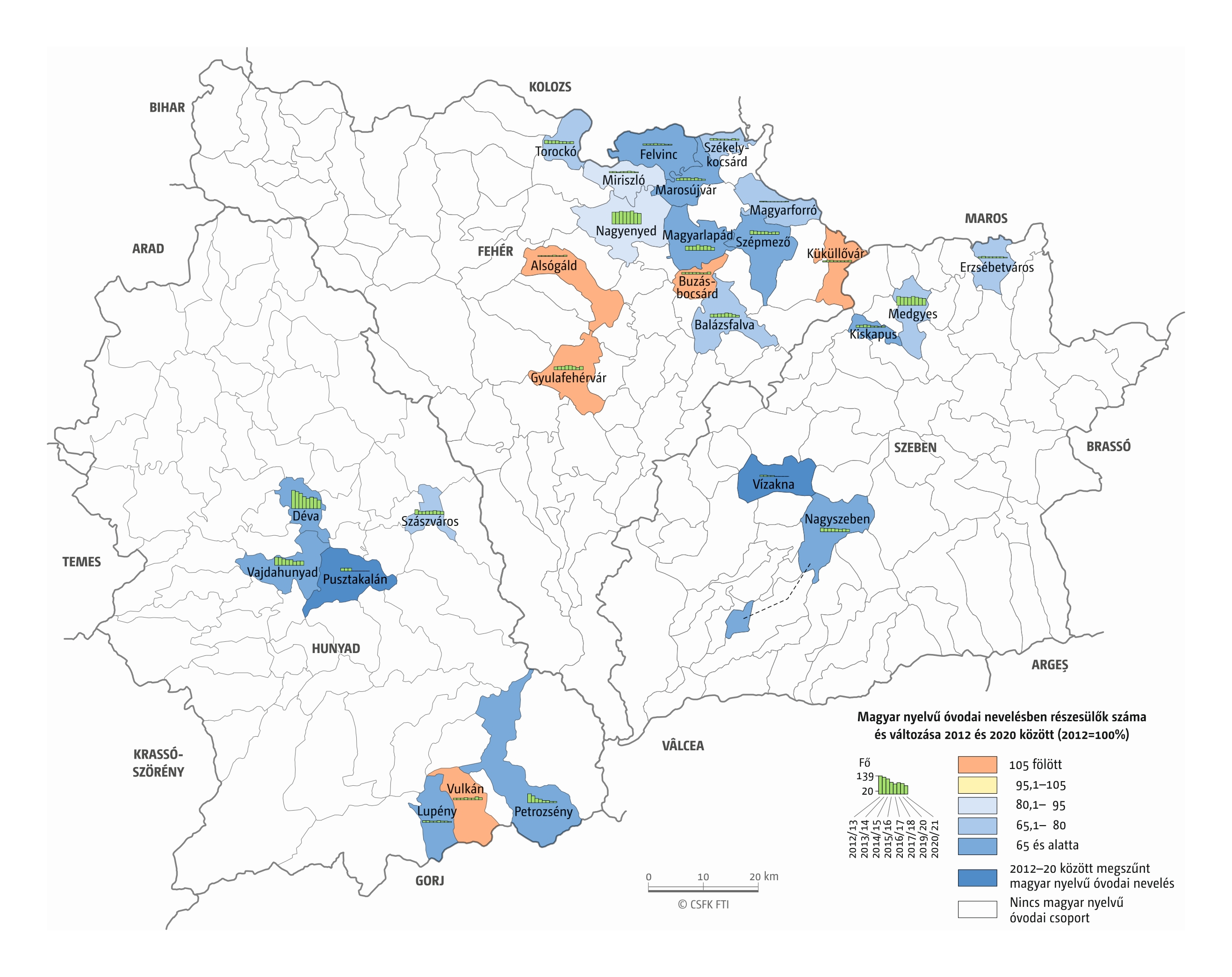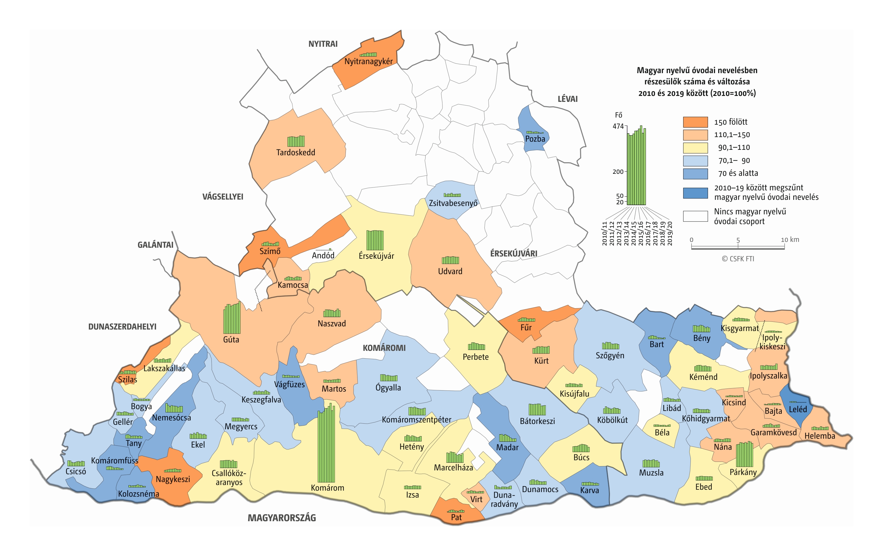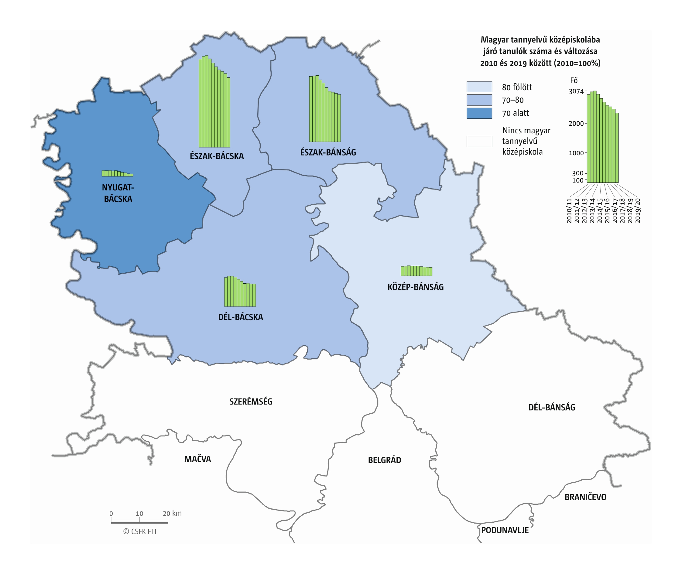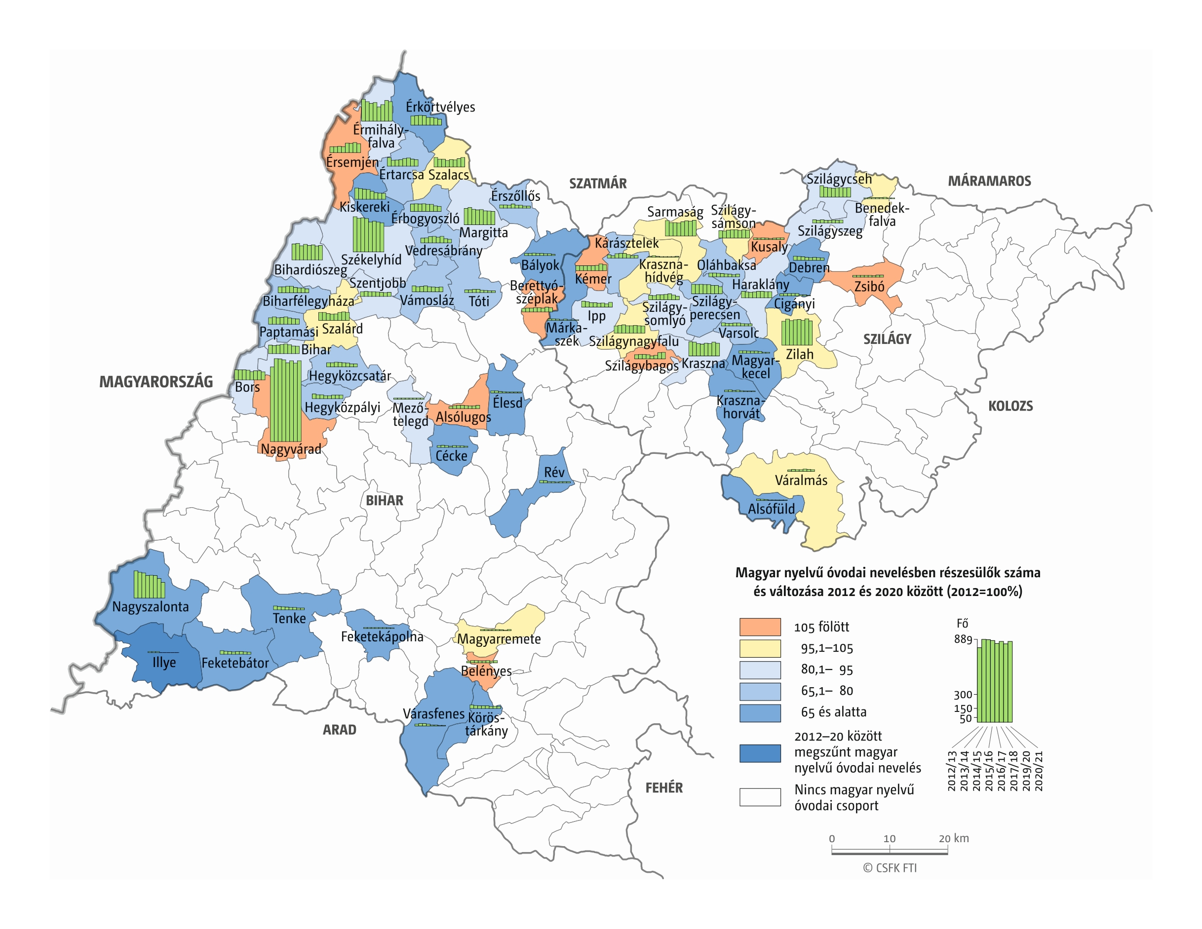 Fontos megjegyeznünk, hogy ha az első vagy az utolsó év kiugró értéket mutat a települési szinten bemutatott változások esetében, vagy ha nagyon alacsony a gyereklétszám (és emiatt már egy-két gyerek megjelenése/eltűnése alapvetően befolyásolja a százalékos változást mutató adatokat), az jelentősen torzíthatja a folyamatok értelmezését, vizualizációját. Ennek kiküszöbölésére a legtöbb esetben kiválóan alkalmasak a járási/megyei szintre aggregált adatok, amelyek általában több iskola adatait összesítik, illetve együtt jelenítik meg funkcionálisan összetartozó térségek (pl. város és vonzáskörzete) adatait. Kivételt jelentenek ez alól azok a szórványterületek, ahol egy járásban/megyében/körzetben mindössze egy-két intézmény adata jelenik meg (pl. a Szerémségben az egyetlen magyar iskola Maradékon található, ahol 2015 és 2019 között a tanulók száma 5 és 10 fő között mozgott). Ugyanígy a trendek érzékeltetését szolgálják azok a részletesebb, egy-egy kistérségre fókuszáló települési szintű térképek, ahol oszlopdiagramokon ábrázoltuk a vizsgált időszak minden évének tanulói létszámát. Ez utóbbi minden vizsgált országra mind az óvodai, mind az általános iskolai szintre elkészült, leszámítva a kárpátaljai óvodákat, ahol a kevés rendelkezésre álló adat miatt ilyen térképek nem készültek.