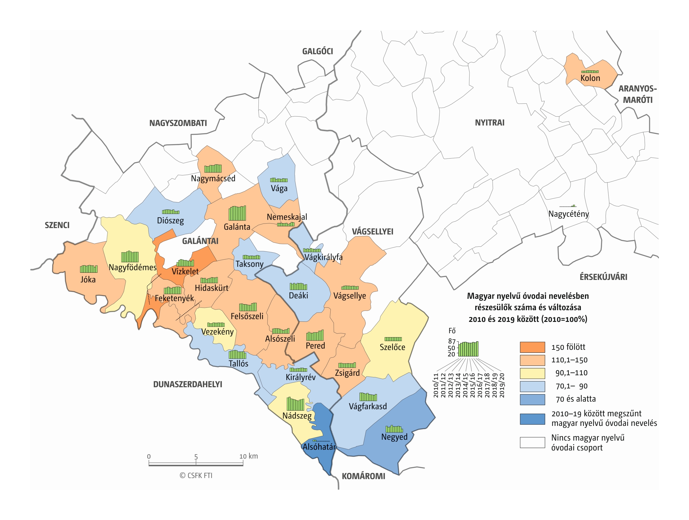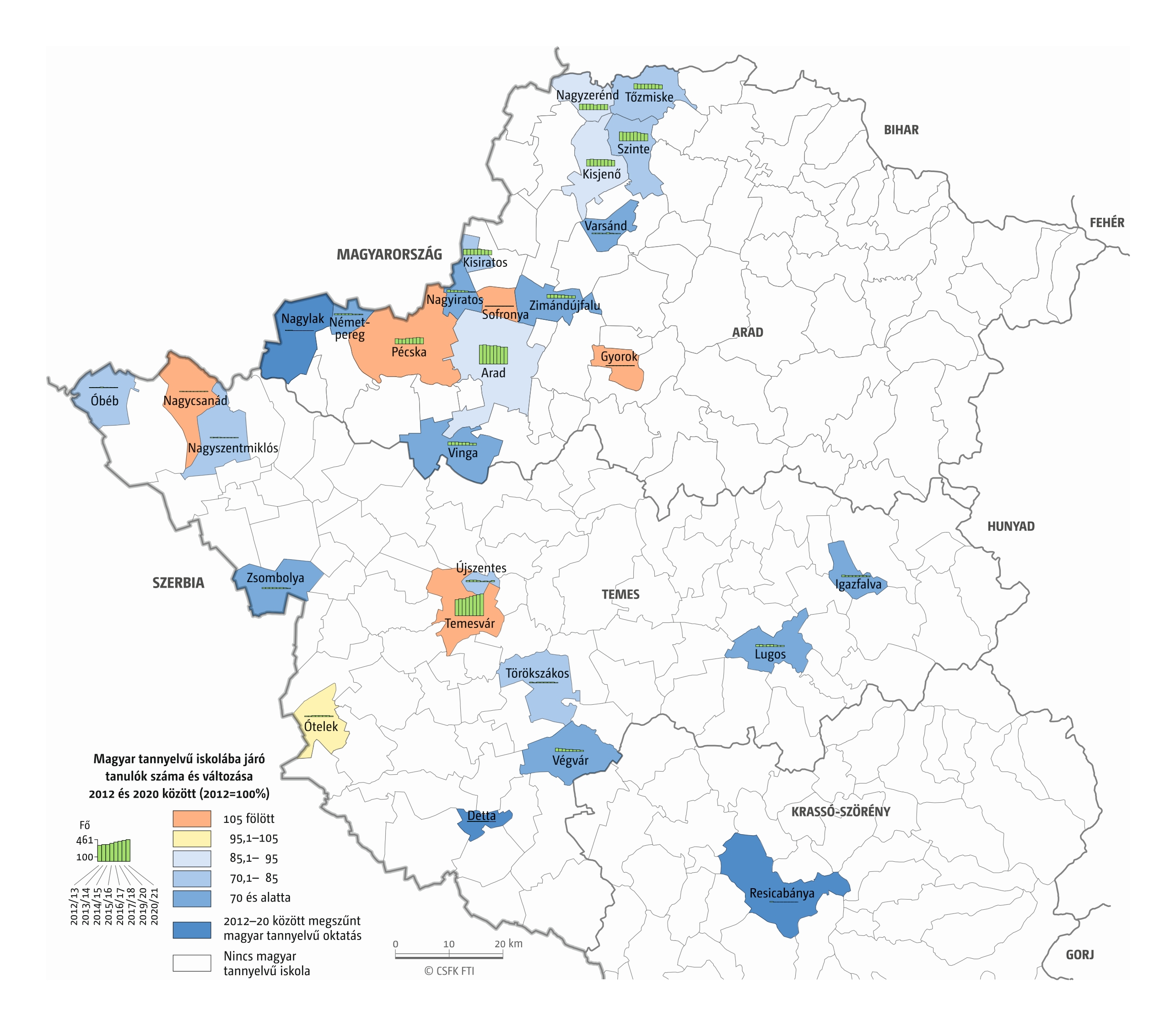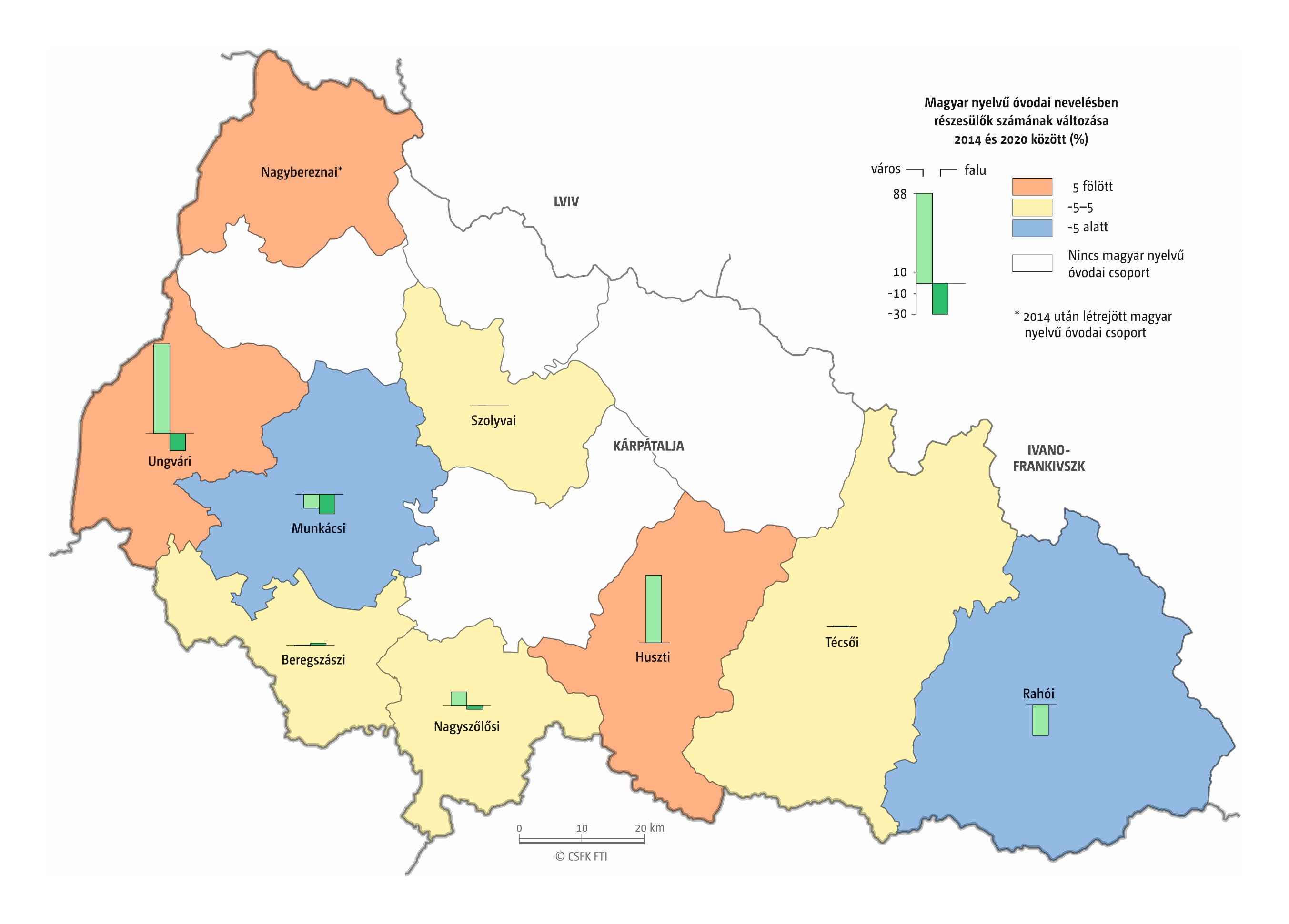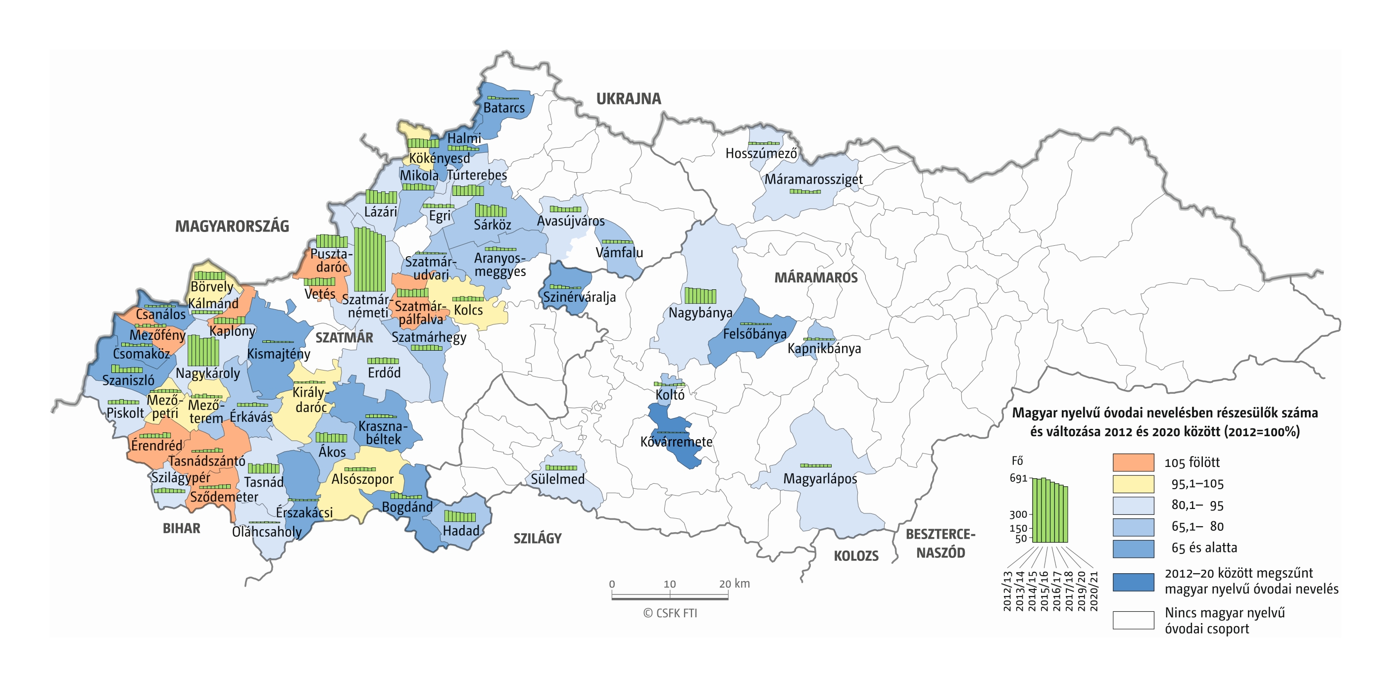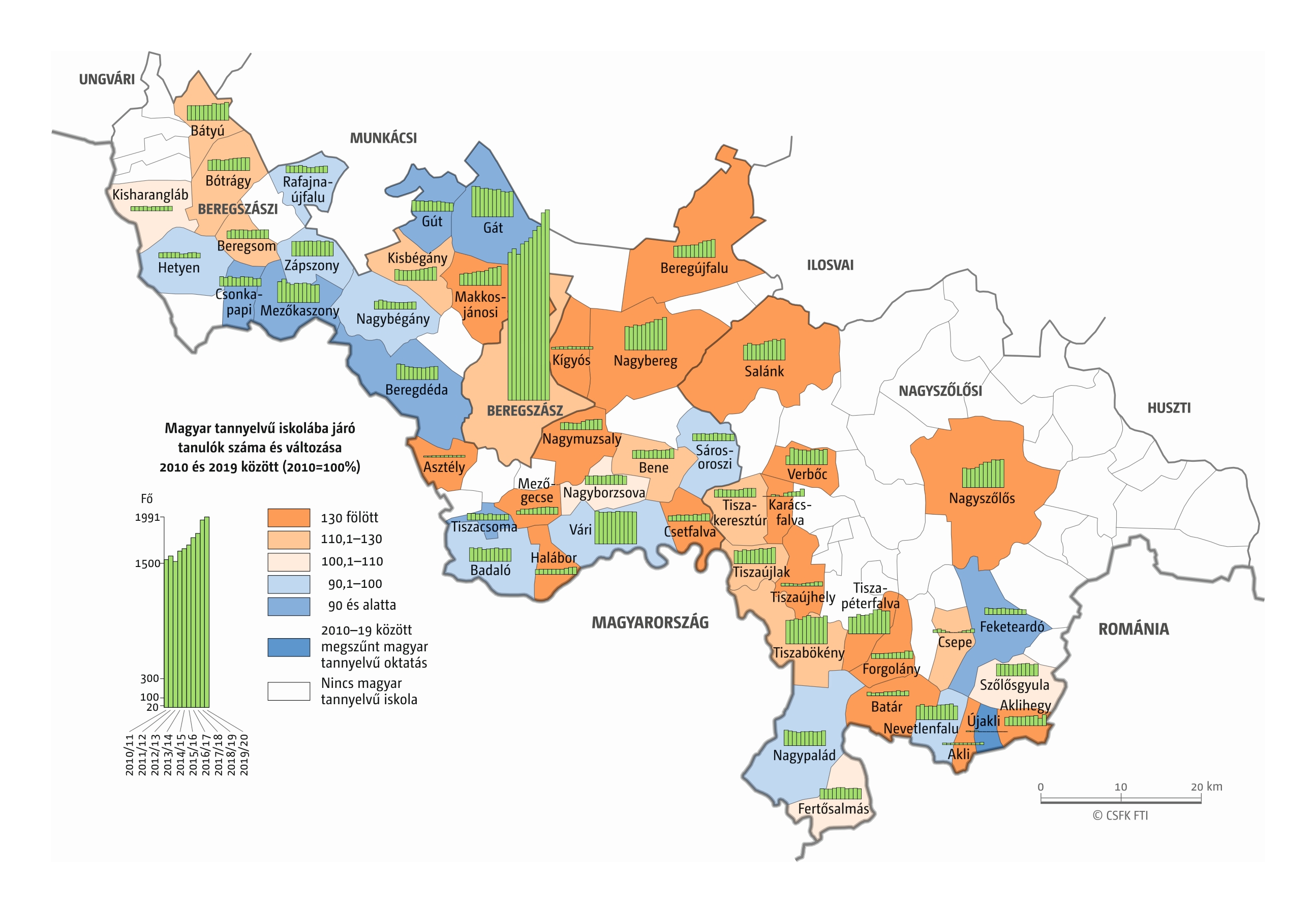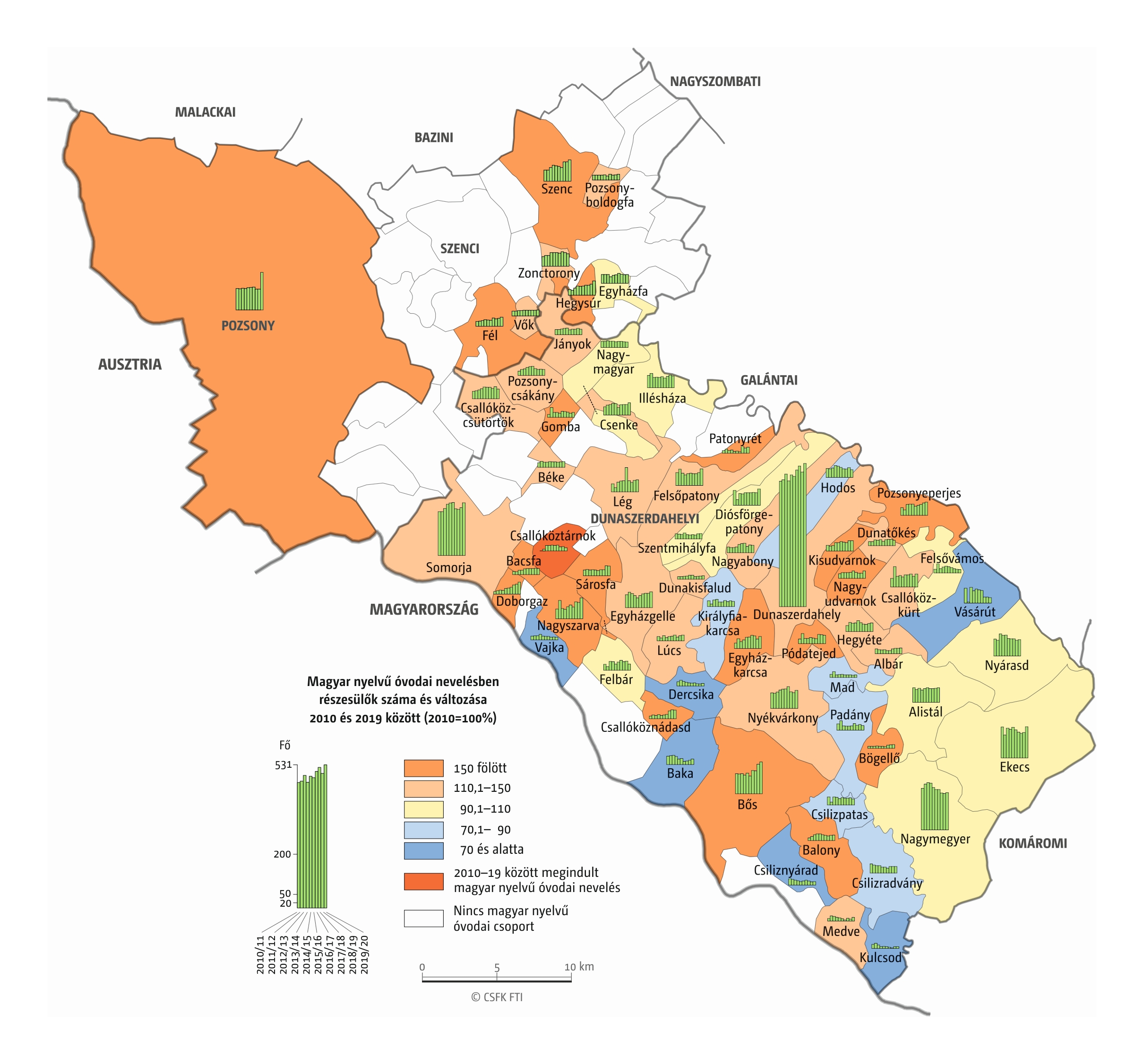Fontos megjegyeznünk, hogy ha az első vagy az utolsó év kiugró értéket mutat a települési szinten bemutatott változások esetében, vagy ha nagyon alacsony a gyereklétszám (és emiatt már egy-két gyerek megjelenése/eltűnése alapvetően befolyásolja a százalékos változást mutató adatokat), az jelentősen torzíthatja a folyamatok értelmezését, vizualizációját. Ennek kiküszöbölésére a legtöbb esetben kiválóan alkalmasak a járási/megyei szintre aggregált adatok, amelyek általában több iskola adatait összesítik, illetve együtt jelenítik meg funkcionálisan összetartozó térségek (pl. város és vonzáskörzete) adatait. Kivételt jelentenek ez alól azok a szórványterületek, ahol egy járásban/megyében/körzetben mindössze egy-két intézmény adata jelenik meg (pl. a Szerémségben az egyetlen magyar iskola Maradékon található, ahol 2015 és 2019 között a tanulók száma 5 és 10 fő között mozgott). Ugyanígy a trendek érzékeltetését szolgálják azok a részletesebb, egy-egy kistérségre fókuszáló települési szintű térképek, ahol oszlopdiagramokon ábrázoltuk a vizsgált időszak minden évének tanulói létszámát. Ez utóbbi minden vizsgált országra mind az óvodai, mind az általános iskolai szintre elkészült, leszámítva a kárpátaljai óvodákat, ahol a kevés rendelkezésre álló adat miatt ilyen térképek nem készültek.