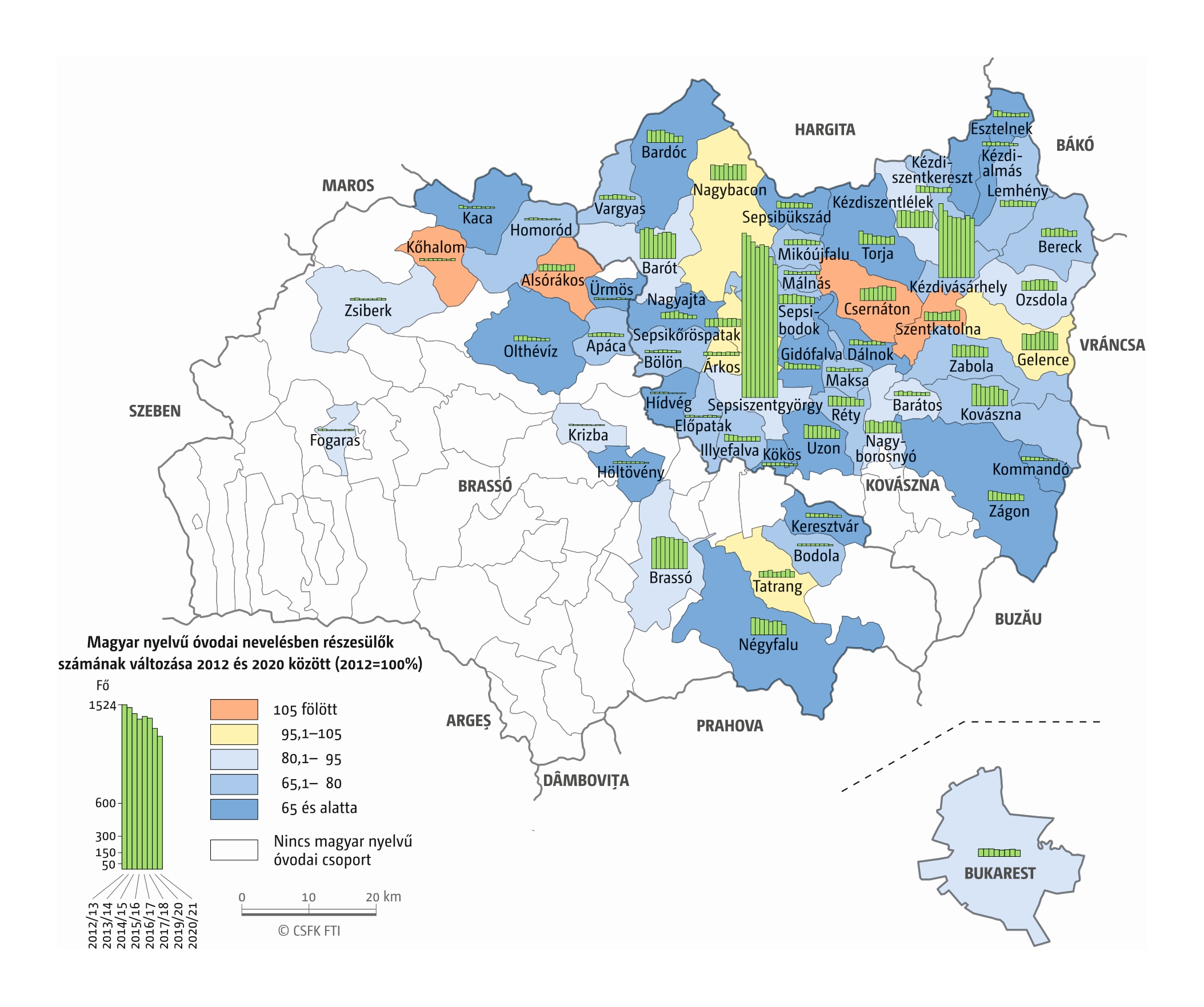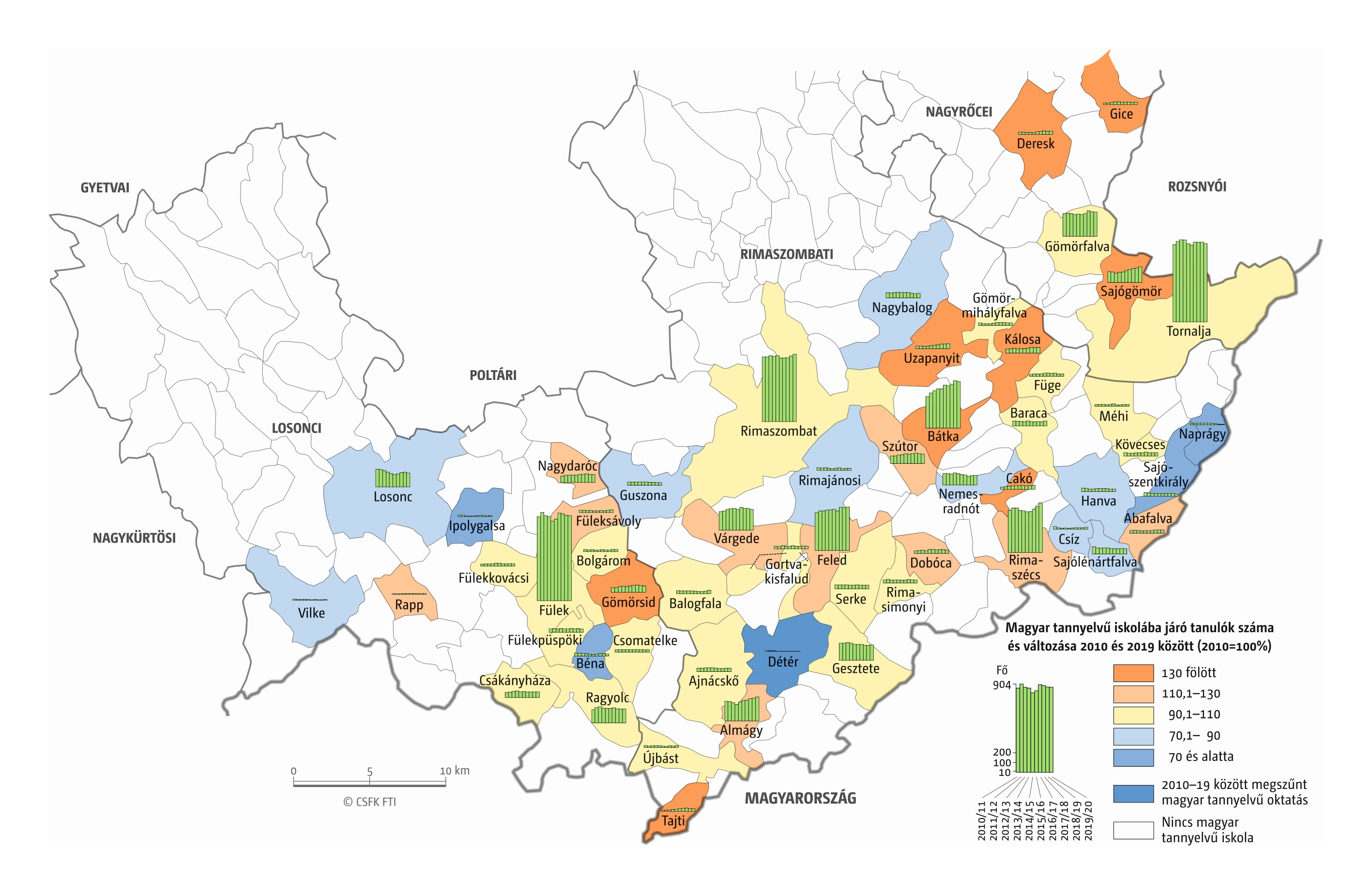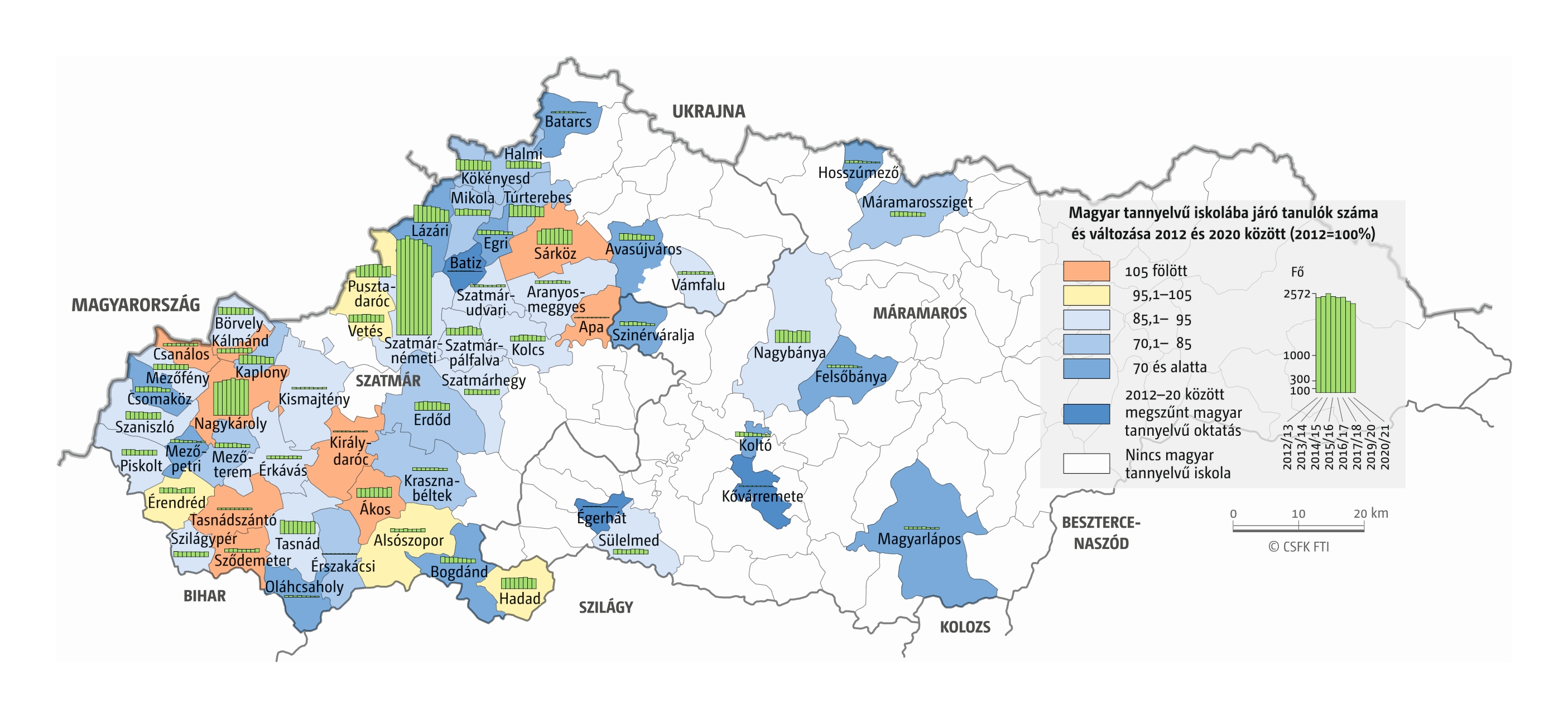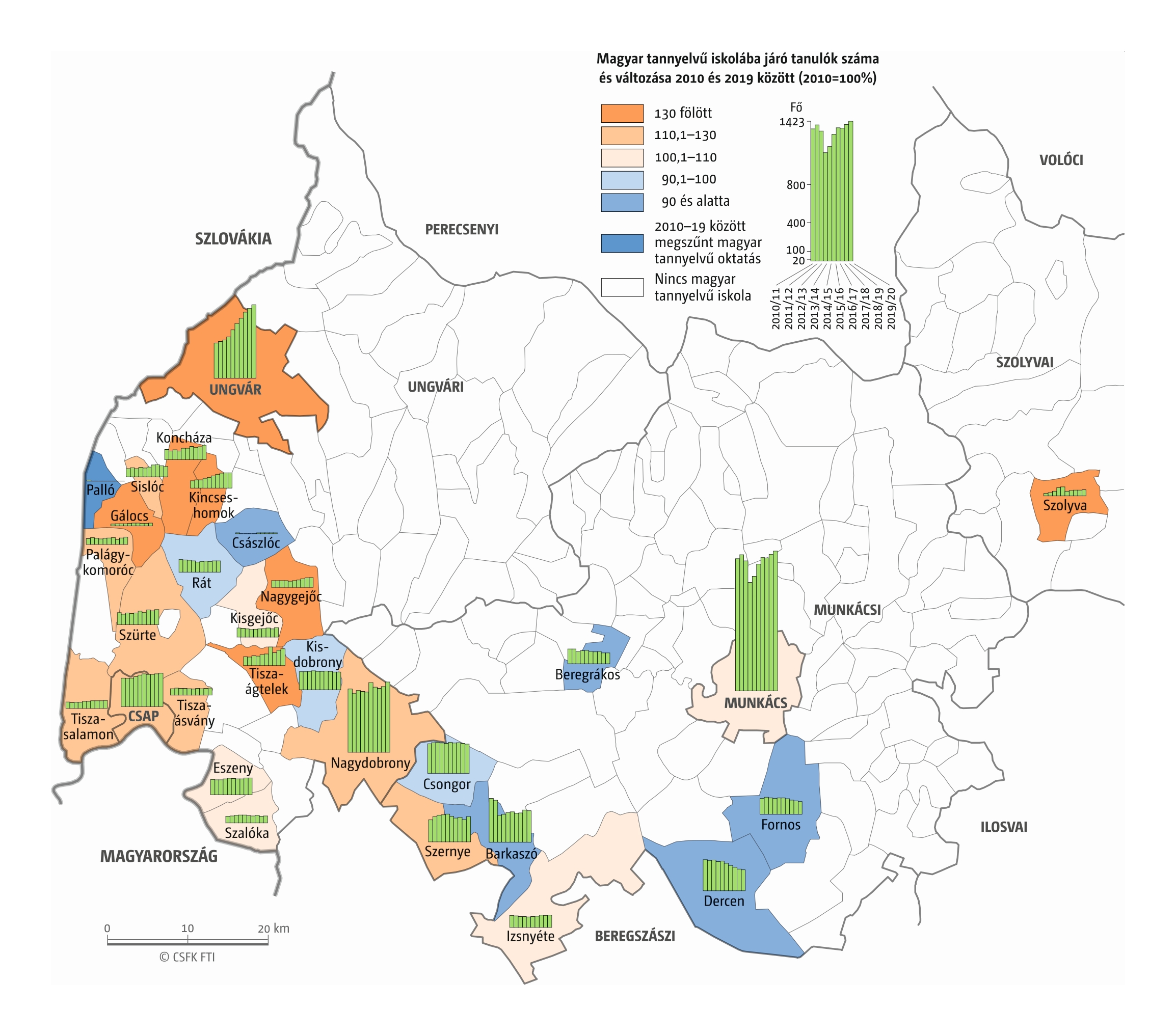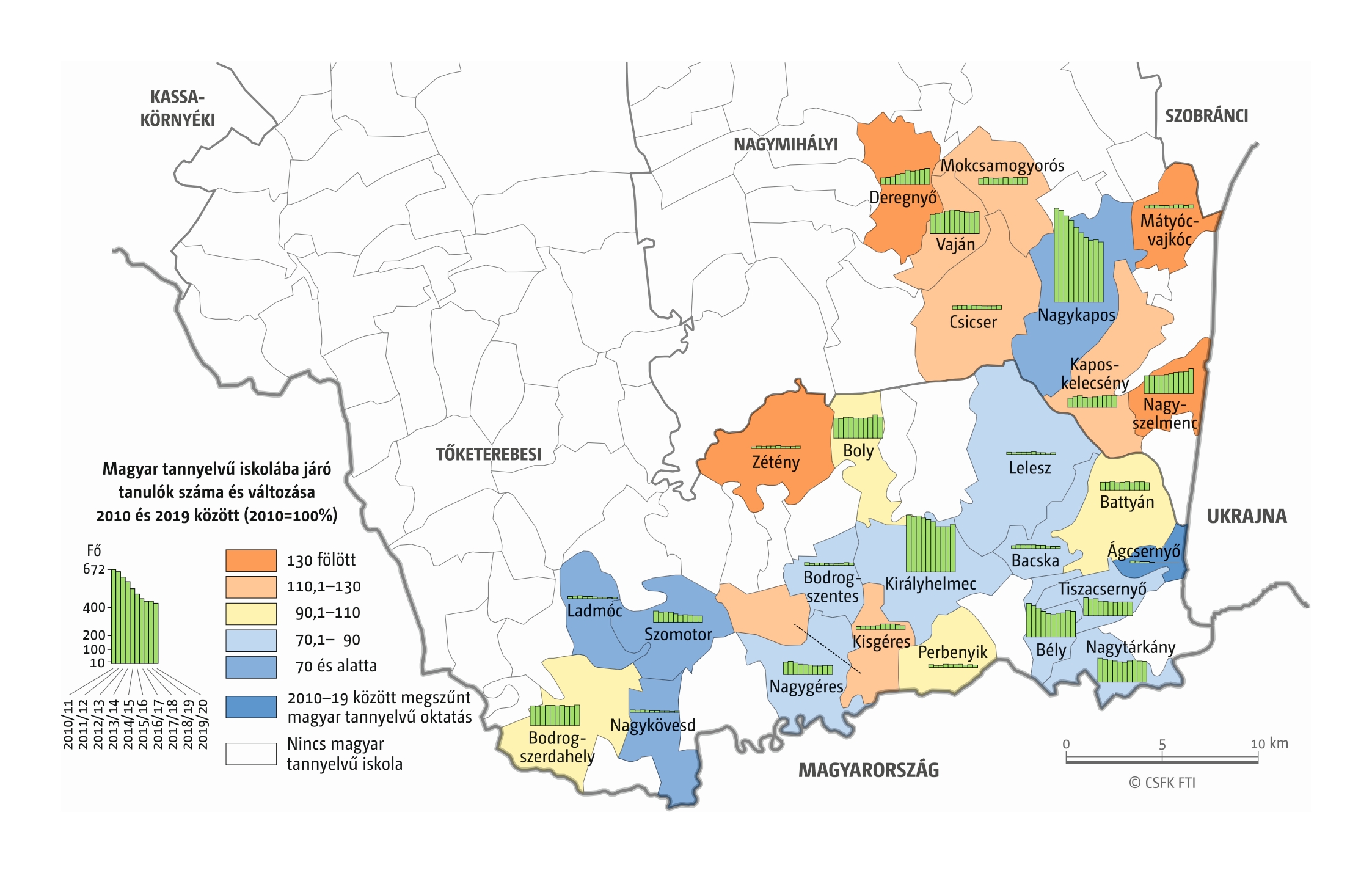 Fontos megjegyeznünk, hogy ha az első vagy az utolsó év kiugró értéket mutat a települési szinten bemutatott változások esetében, vagy ha nagyon alacsony a gyereklétszám (és emiatt már egy-két gyerek megjelenése/eltűnése alapvetően befolyásolja a százalékos változást mutató adatokat), az jelentősen torzíthatja a folyamatok értelmezését, vizualizációját. Ennek kiküszöbölésére a legtöbb esetben kiválóan alkalmasak a járási/megyei szintre aggregált adatok, amelyek általában több iskola adatait összesítik, illetve együtt jelenítik meg funkcionálisan összetartozó térségek (pl. város és vonzáskörzete) adatait. Kivételt jelentenek ez alól azok a szórványterületek, ahol egy járásban/megyében/körzetben mindössze egy-két intézmény adata jelenik meg (pl. a Szerémségben az egyetlen magyar iskola Maradékon található, ahol 2015 és 2019 között a tanulók száma 5 és 10 fő között mozgott). Ugyanígy a trendek érzékeltetését szolgálják azok a részletesebb, egy-egy kistérségre fókuszáló települési szintű térképek, ahol oszlopdiagramokon ábrázoltuk a vizsgált időszak minden évének tanulói létszámát. Ez utóbbi minden vizsgált országra mind az óvodai, mind az általános iskolai szintre elkészült, leszámítva a kárpátaljai óvodákat, ahol a kevés rendelkezésre álló adat miatt ilyen térképek nem készültek.