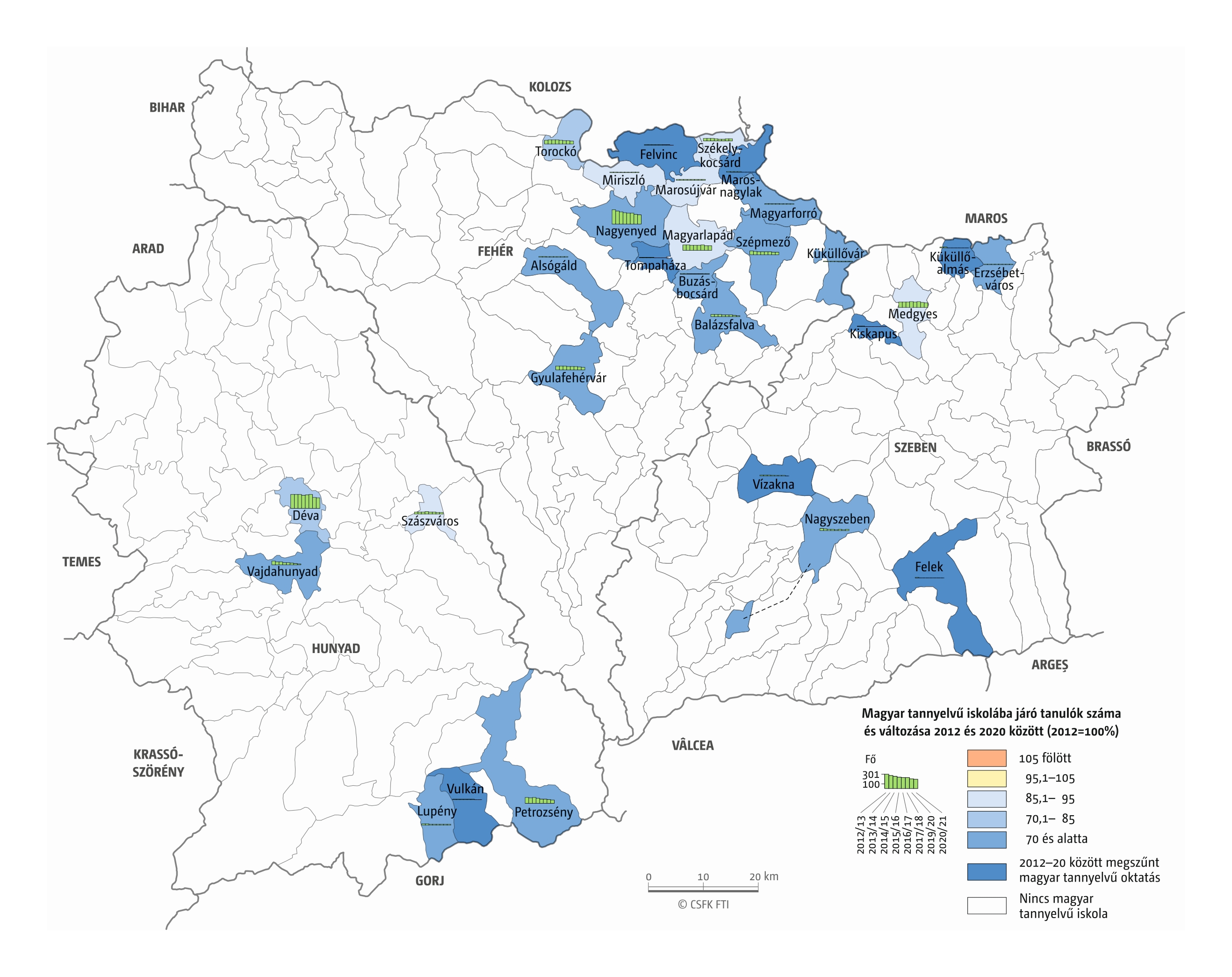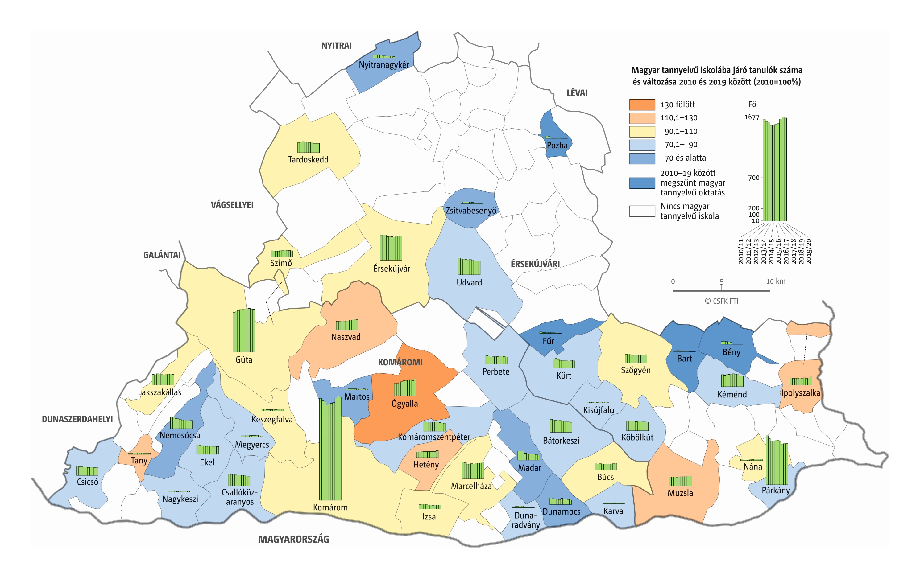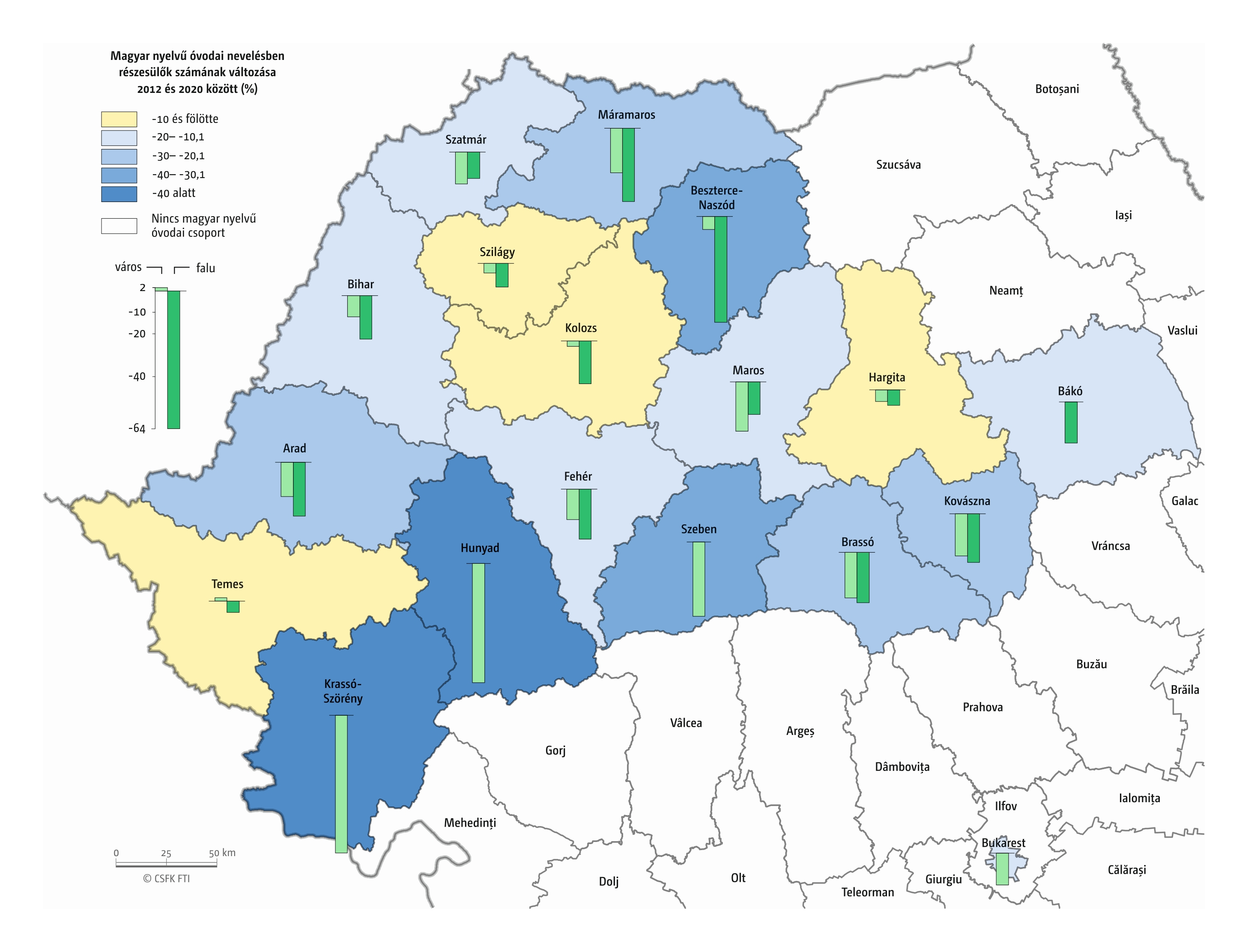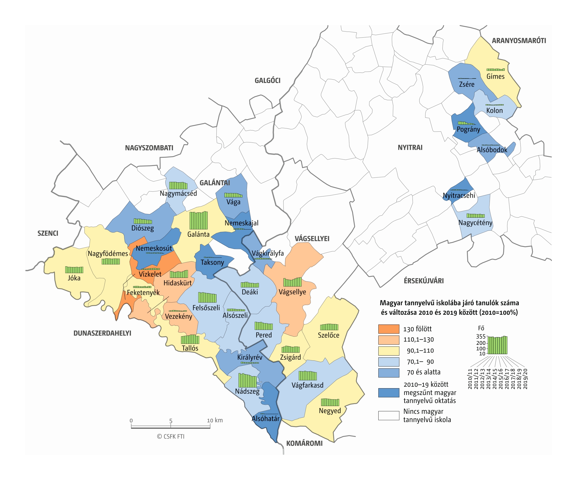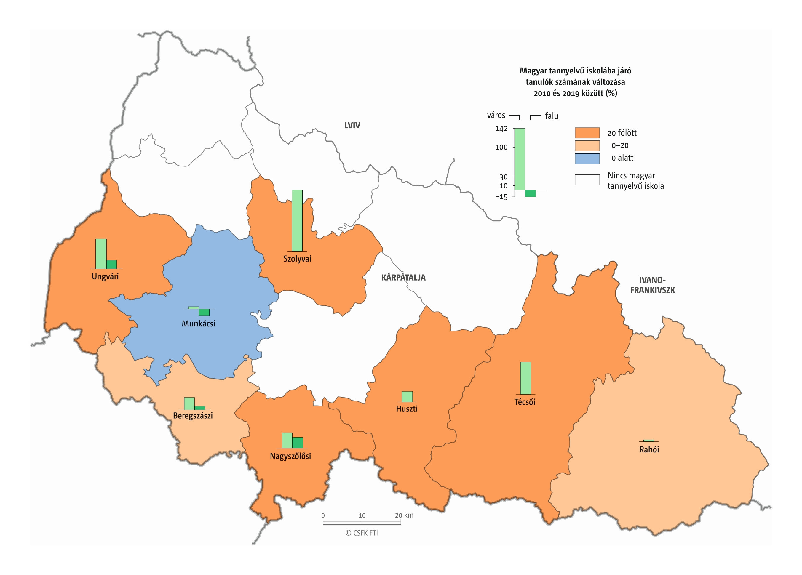 Fontos megjegyeznünk, hogy ha az első vagy az utolsó év kiugró értéket mutat a települési szinten bemutatott változások esetében, vagy ha nagyon alacsony a gyereklétszám (és emiatt már egy-két gyerek megjelenése/eltűnése alapvetően befolyásolja a százalékos változást mutató adatokat), az jelentősen torzíthatja a folyamatok értelmezését, vizualizációját. Ennek kiküszöbölésére a legtöbb esetben kiválóan alkalmasak a járási/megyei szintre aggregált adatok, amelyek általában több iskola adatait összesítik, illetve együtt jelenítik meg funkcionálisan összetartozó térségek (pl. város és vonzáskörzete) adatait. Kivételt jelentenek ez alól azok a szórványterületek, ahol egy járásban/megyében/körzetben mindössze egy-két intézmény adata jelenik meg (pl. a Szerémségben az egyetlen magyar iskola Maradékon található, ahol 2015 és 2019 között a tanulók száma 5 és 10 fő között mozgott). Ugyanígy a trendek érzékeltetését szolgálják azok a részletesebb, egy-egy kistérségre fókuszáló települési szintű térképek, ahol oszlopdiagramokon ábrázoltuk a vizsgált időszak minden évének tanulói létszámát. Ez utóbbi minden vizsgált országra mind az óvodai, mind az általános iskolai szintre elkészült, leszámítva a kárpátaljai óvodákat, ahol a kevés rendelkezésre álló adat miatt ilyen térképek nem készültek.