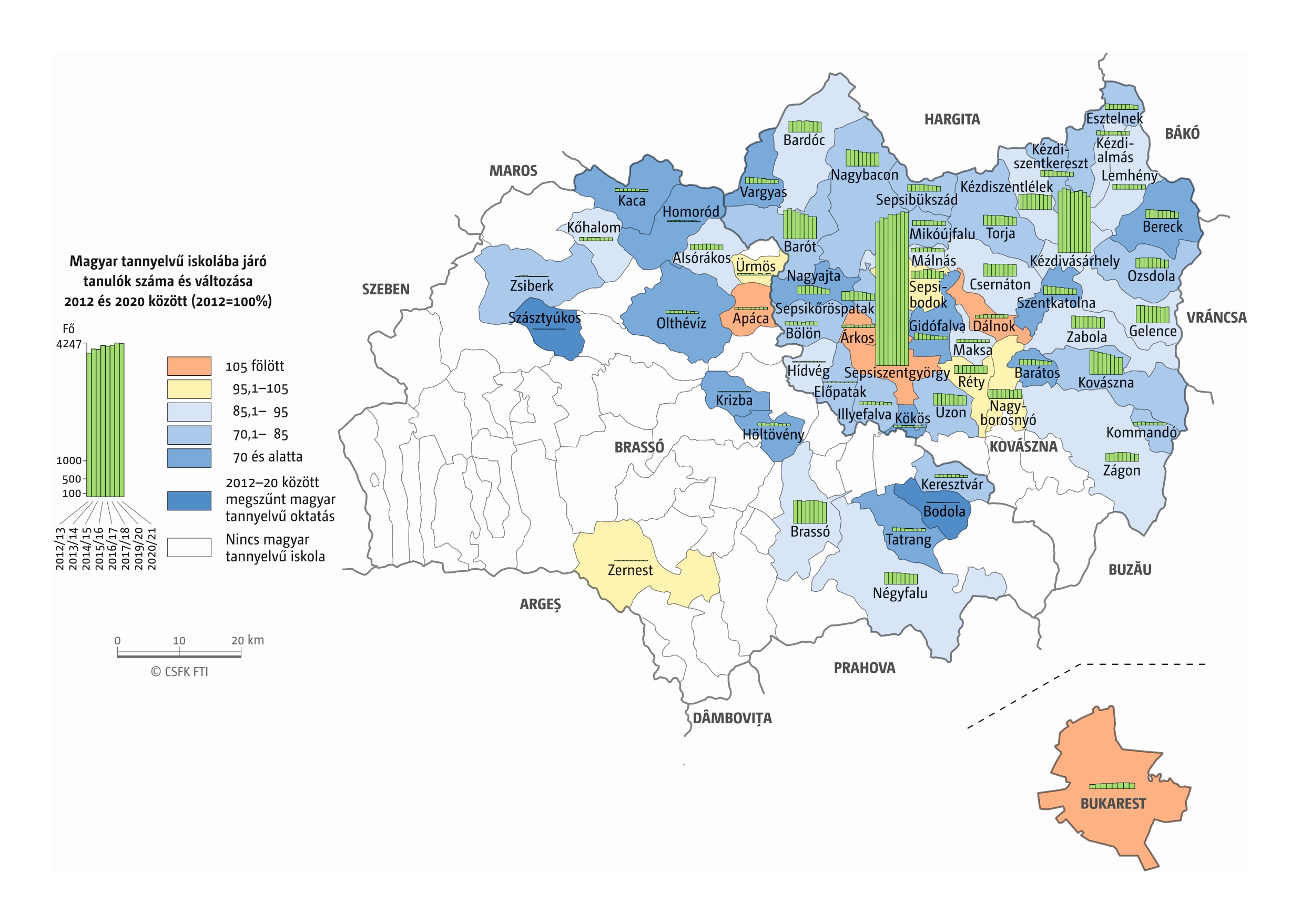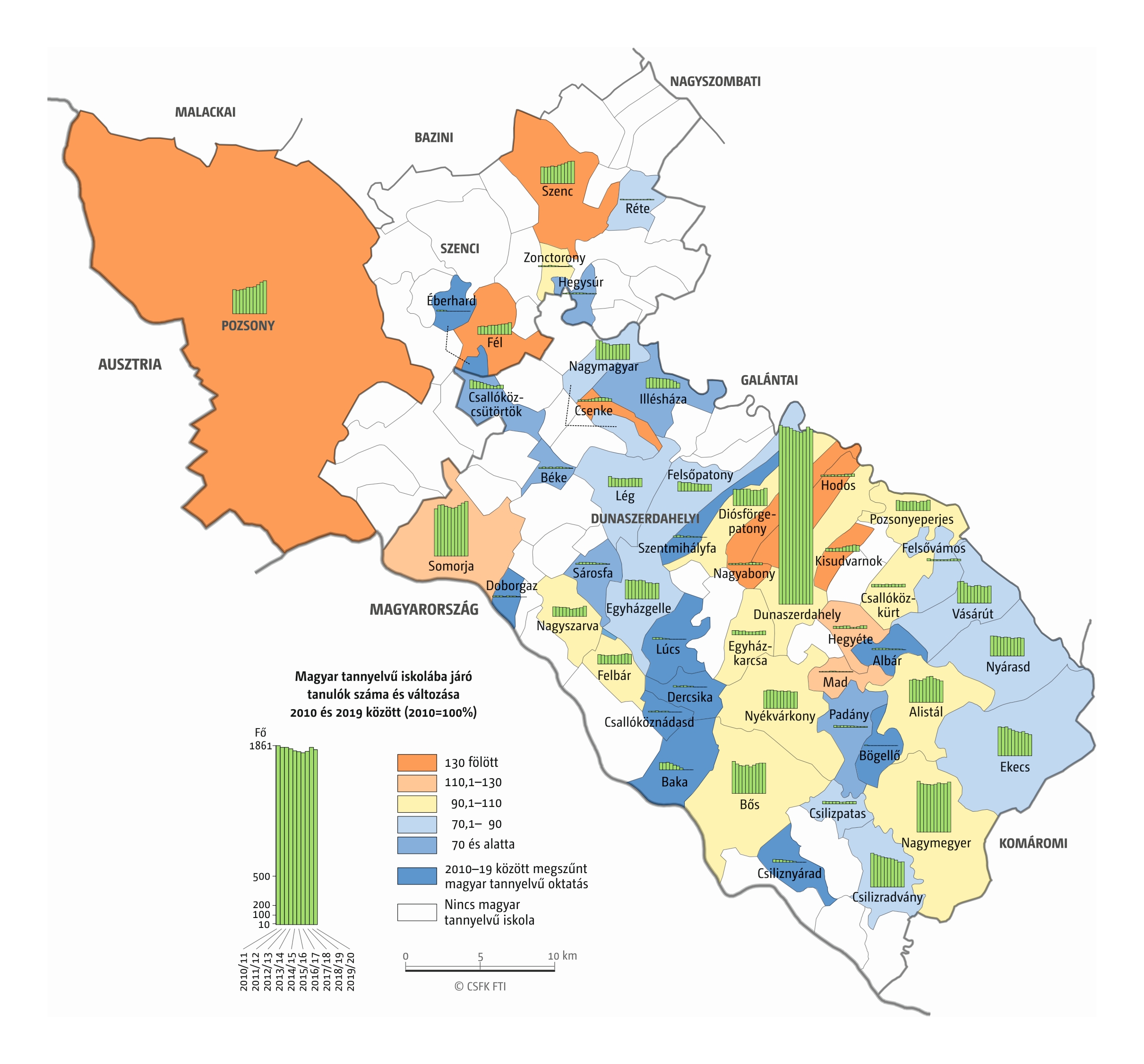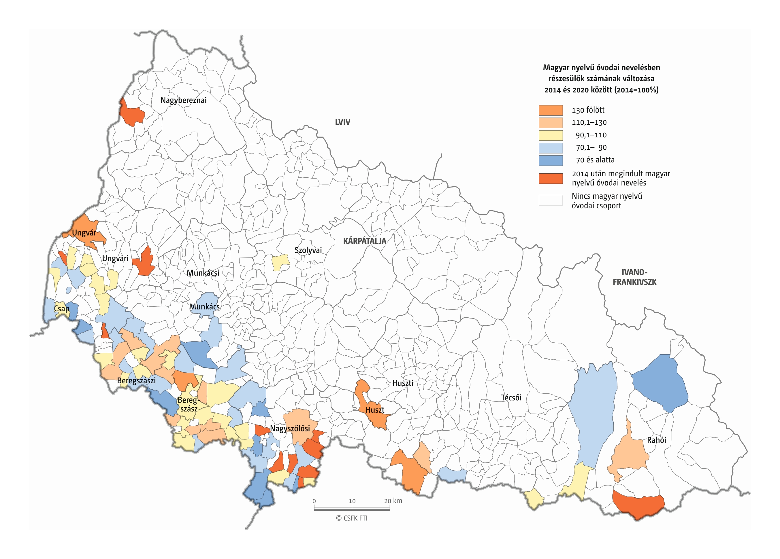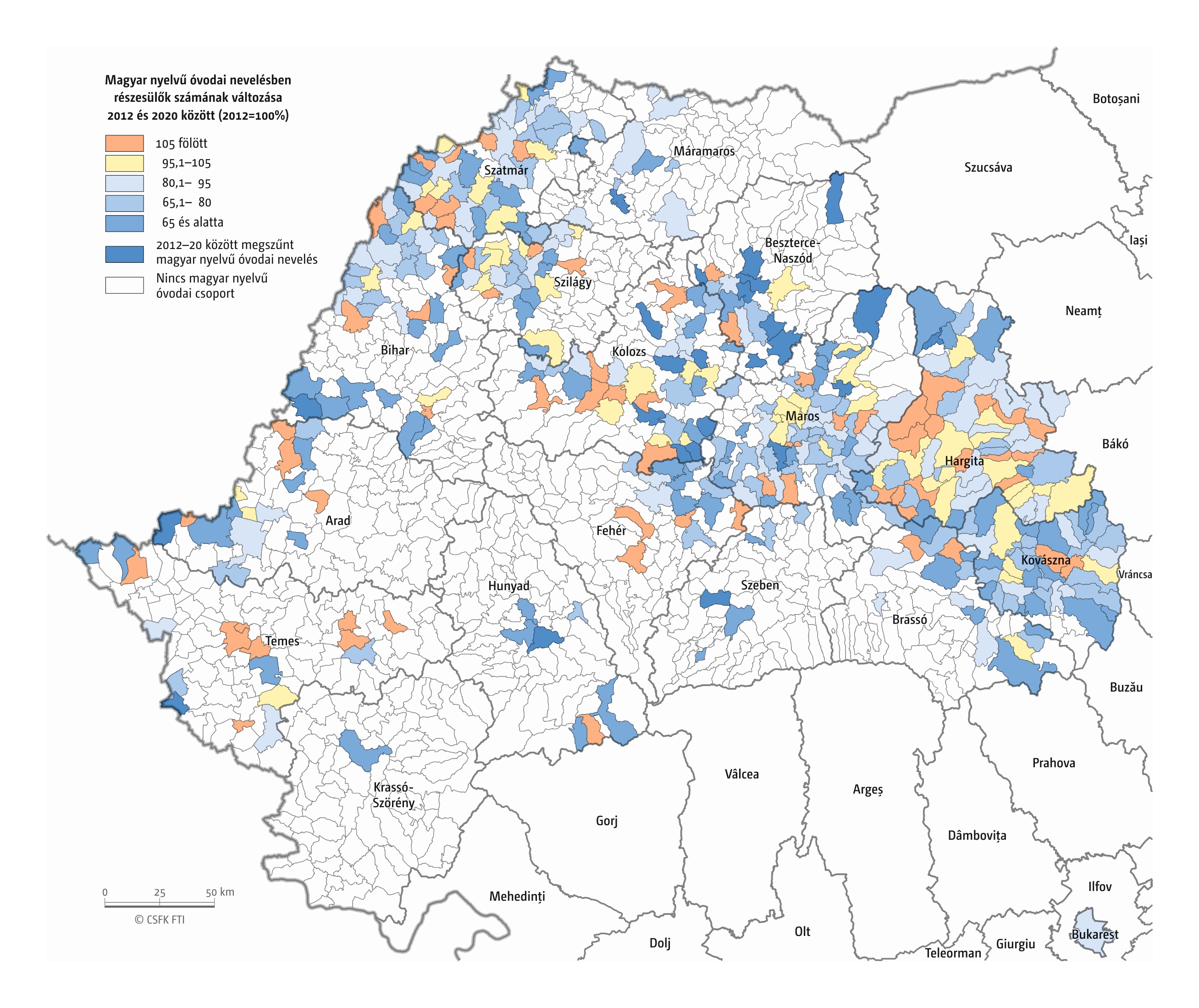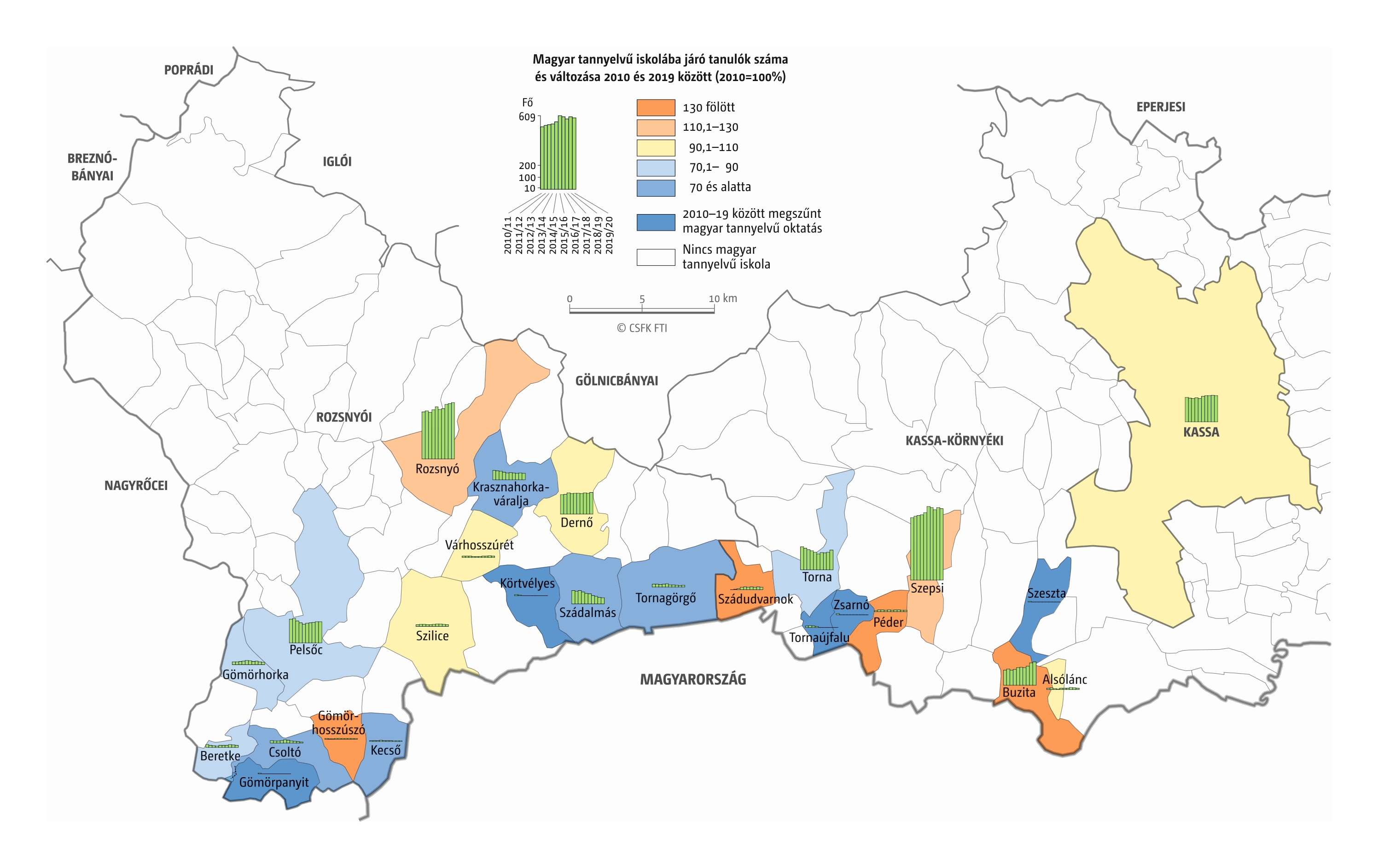 Fontos megjegyeznünk, hogy ha az első vagy az utolsó év kiugró értéket mutat a települési szinten bemutatott változások esetében, vagy ha nagyon alacsony a gyereklétszám (és emiatt már egy-két gyerek megjelenése/eltűnése alapvetően befolyásolja a százalékos változást mutató adatokat), az jelentősen torzíthatja a folyamatok értelmezését, vizualizációját. Ennek kiküszöbölésére a legtöbb esetben kiválóan alkalmasak a járási/megyei szintre aggregált adatok, amelyek általában több iskola adatait összesítik, illetve együtt jelenítik meg funkcionálisan összetartozó térségek (pl. város és vonzáskörzete) adatait. Kivételt jelentenek ez alól azok a szórványterületek, ahol egy járásban/megyében/körzetben mindössze egy-két intézmény adata jelenik meg (pl. a Szerémségben az egyetlen magyar iskola Maradékon található, ahol 2015 és 2019 között a tanulók száma 5 és 10 fő között mozgott). Ugyanígy a trendek érzékeltetését szolgálják azok a részletesebb, egy-egy kistérségre fókuszáló települési szintű térképek, ahol oszlopdiagramokon ábrázoltuk a vizsgált időszak minden évének tanulói létszámát. Ez utóbbi minden vizsgált országra mind az óvodai, mind az általános iskolai szintre elkészült, leszámítva a kárpátaljai óvodákat, ahol a kevés rendelkezésre álló adat miatt ilyen térképek nem készültek.