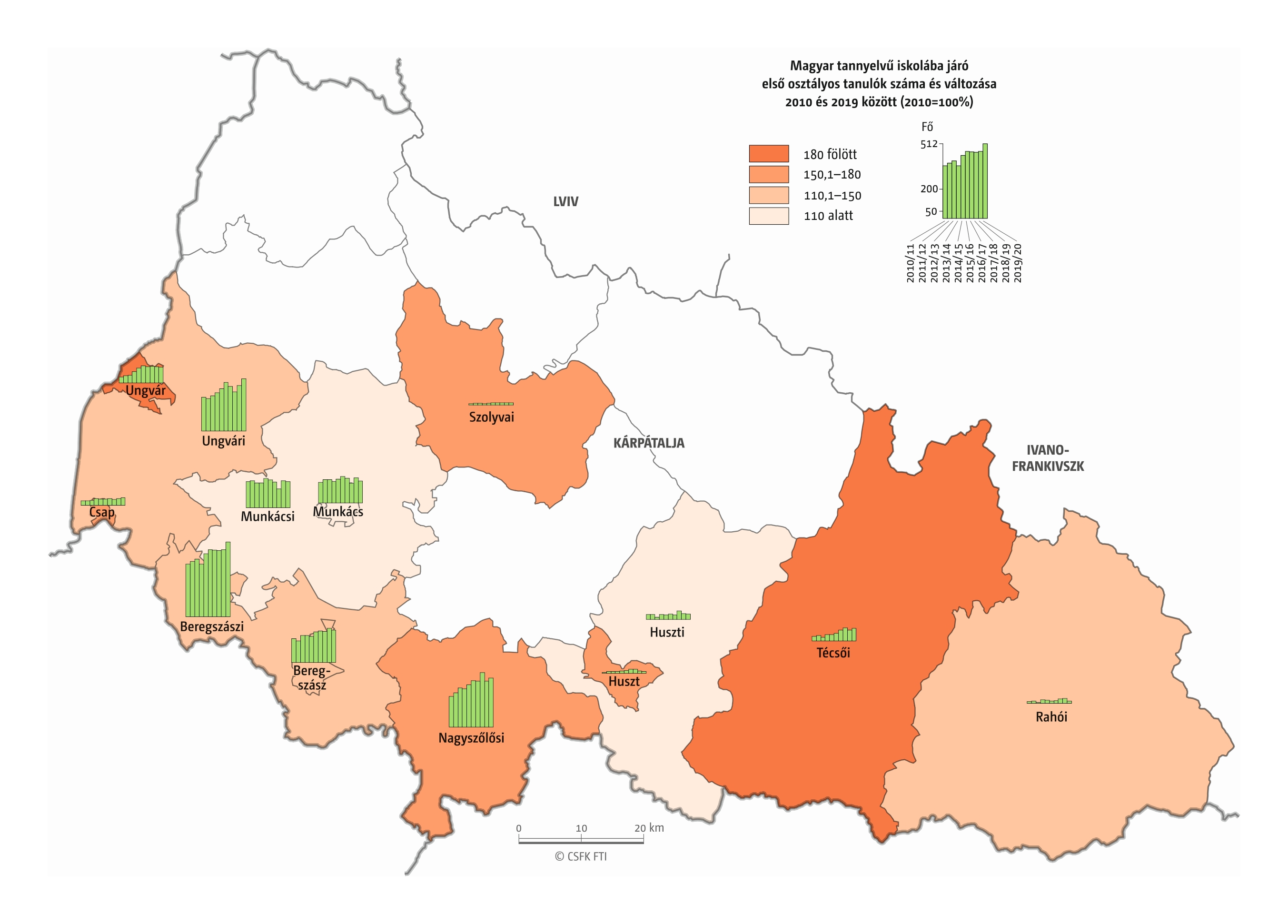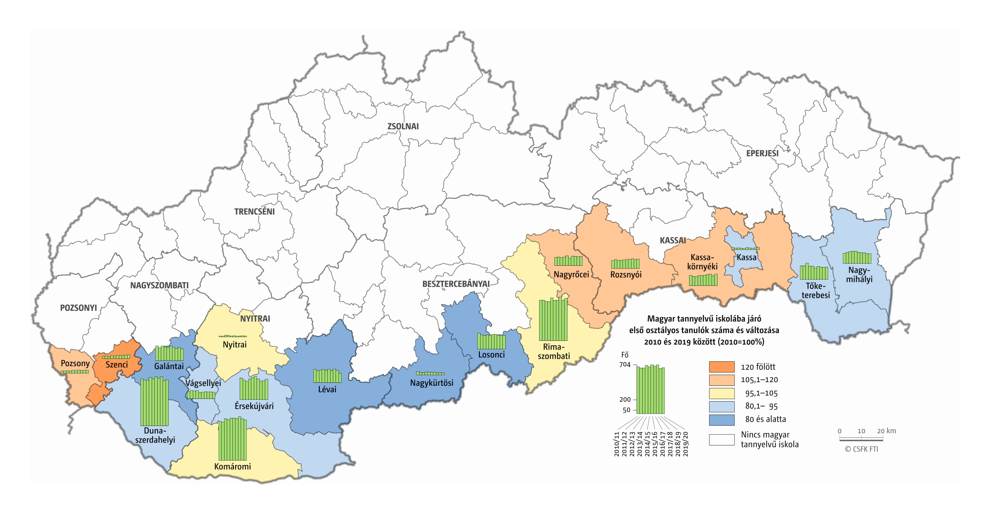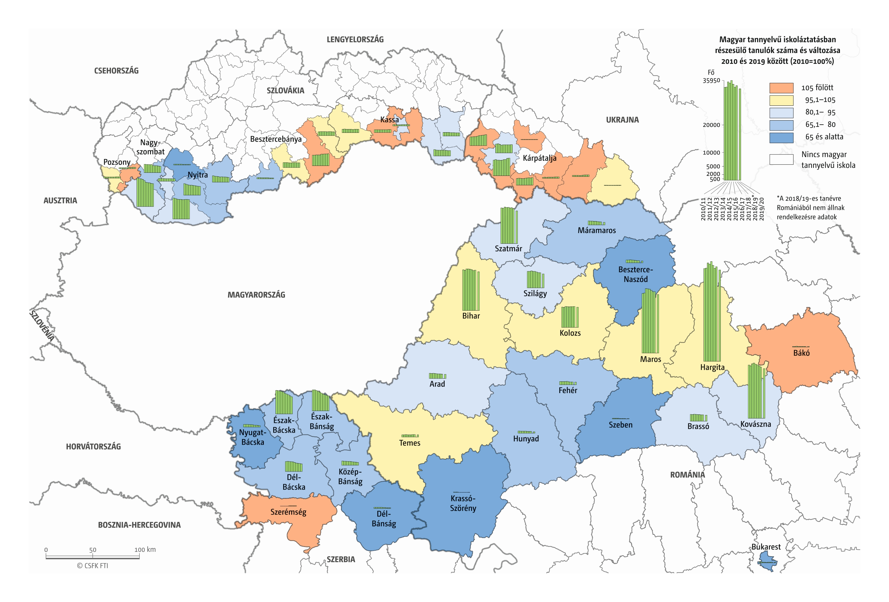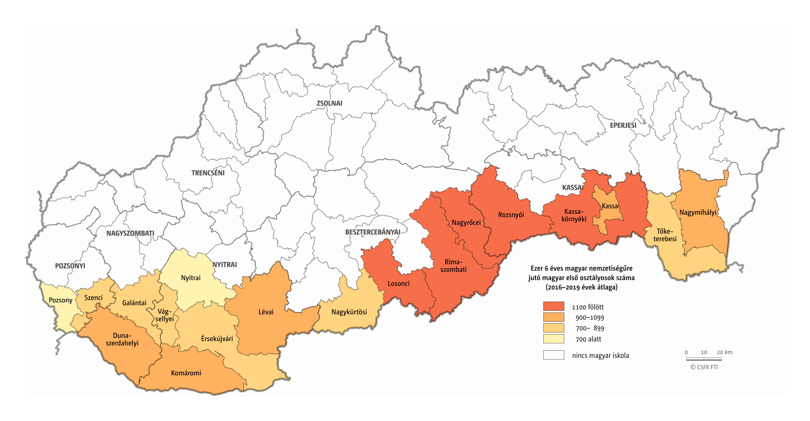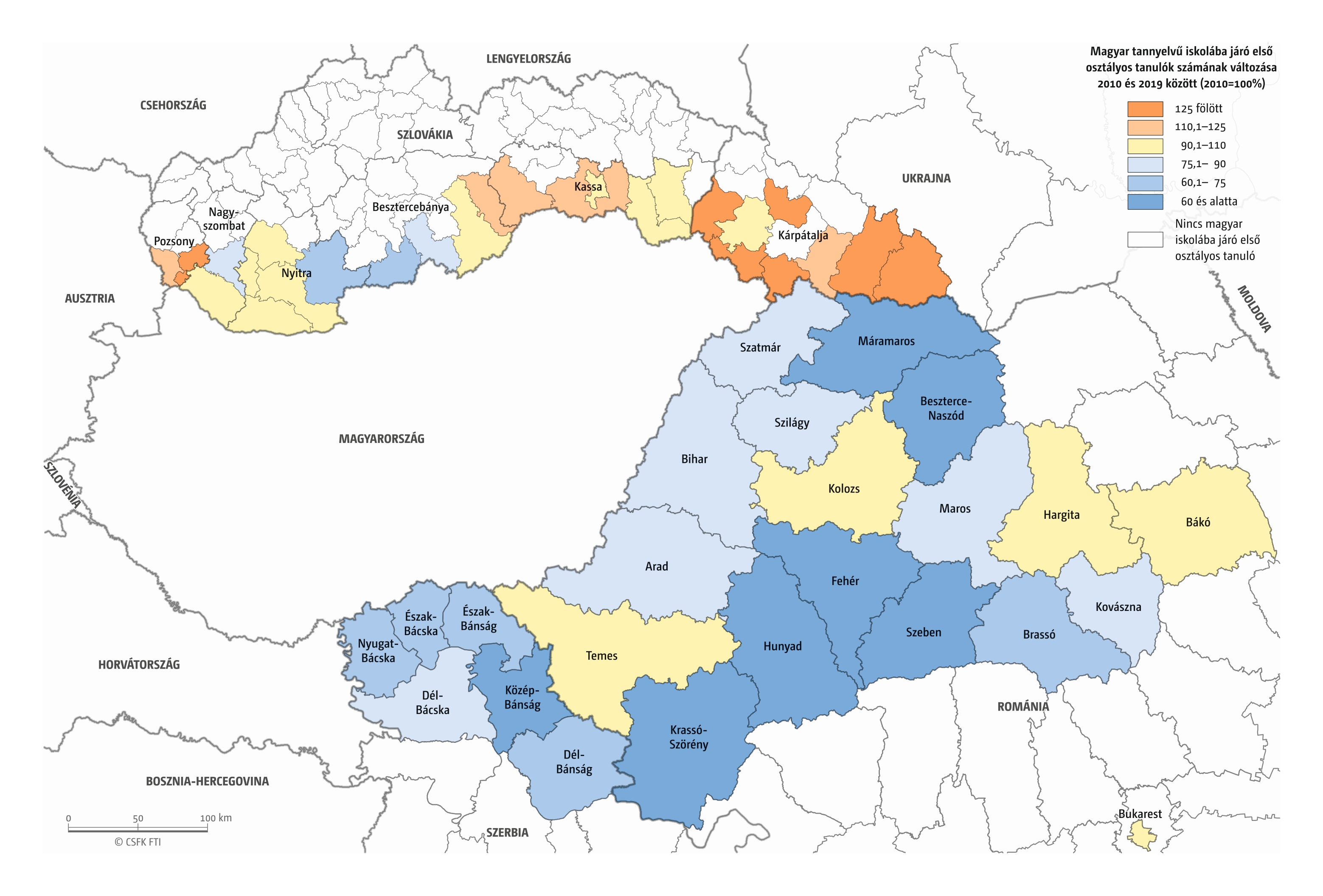 Hasonlóan jártunk el, amikor összevetettük a magyar iskolák elsőseinek számát és a hat évvel korábban született magyar nemzetiségűnek regisztráltak számát. Mivel itt sem esnek egybe az iskolaévek szerint rendelkezésre álló oktatási statisztikák és a naptári évek szerint gyűjtött népmozgalmi adatok, továbbá sok gyerek kezdi 7 éves korban az iskolát, valamint a születések számának éves ingadozása jelentős lehet, ezért a 2016–2019 közötti tanévek átlagos adatait vetettük össze a 2010–2013 közötti születések átlagával. Ez tehát szintén csak egy közelítő érték, de a főbb trendekről, az adott országon belüli regionális eltérésekről megfelelő képet ad.