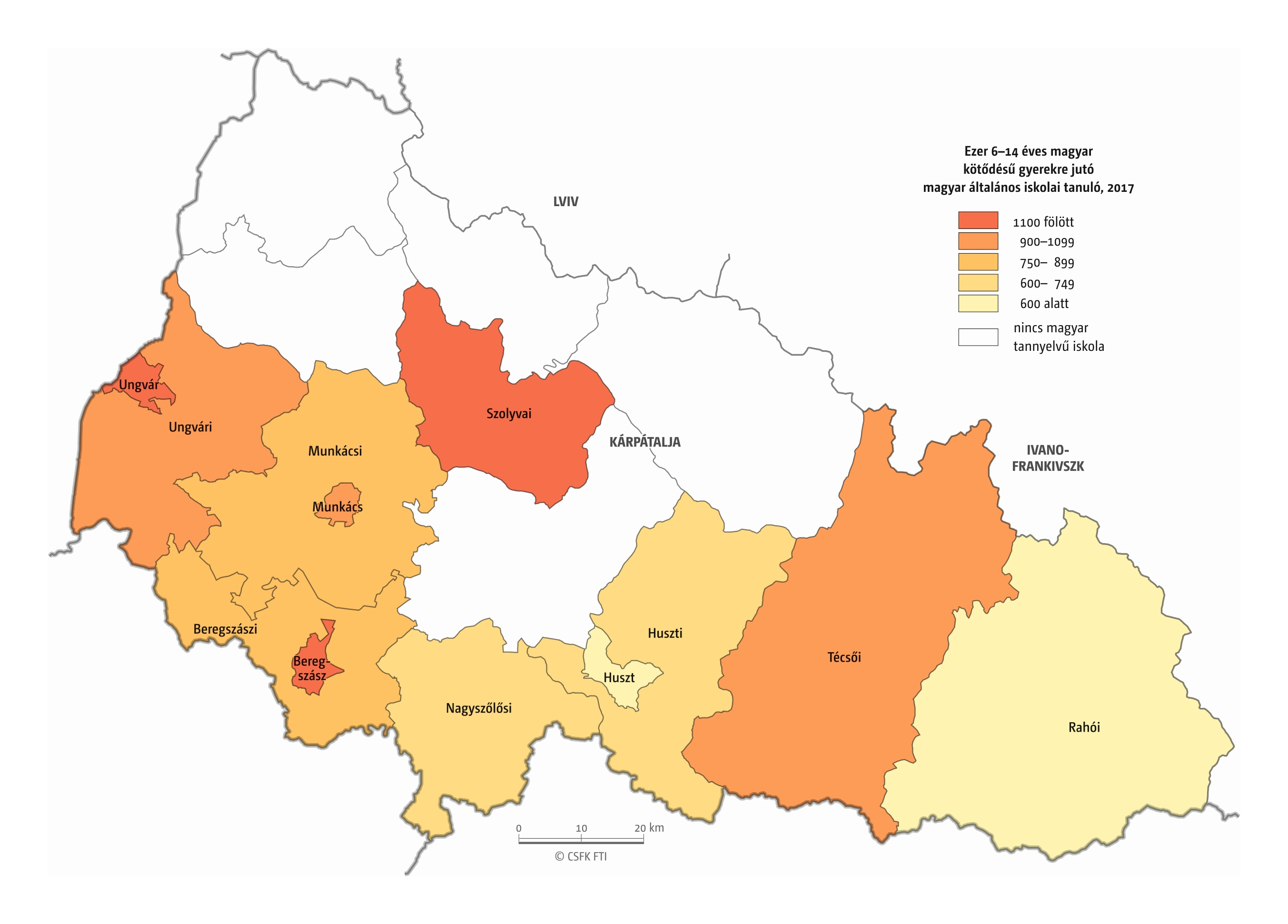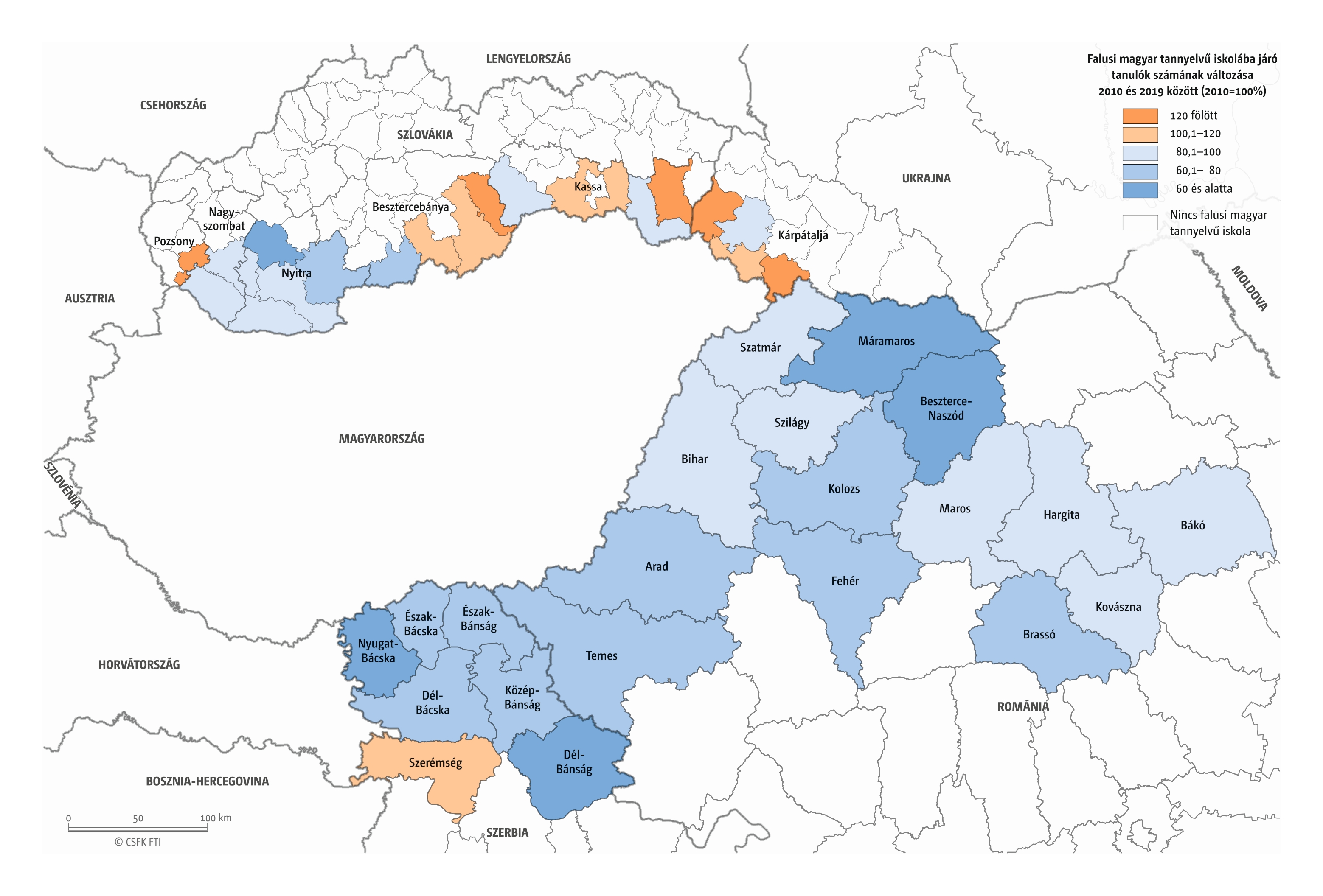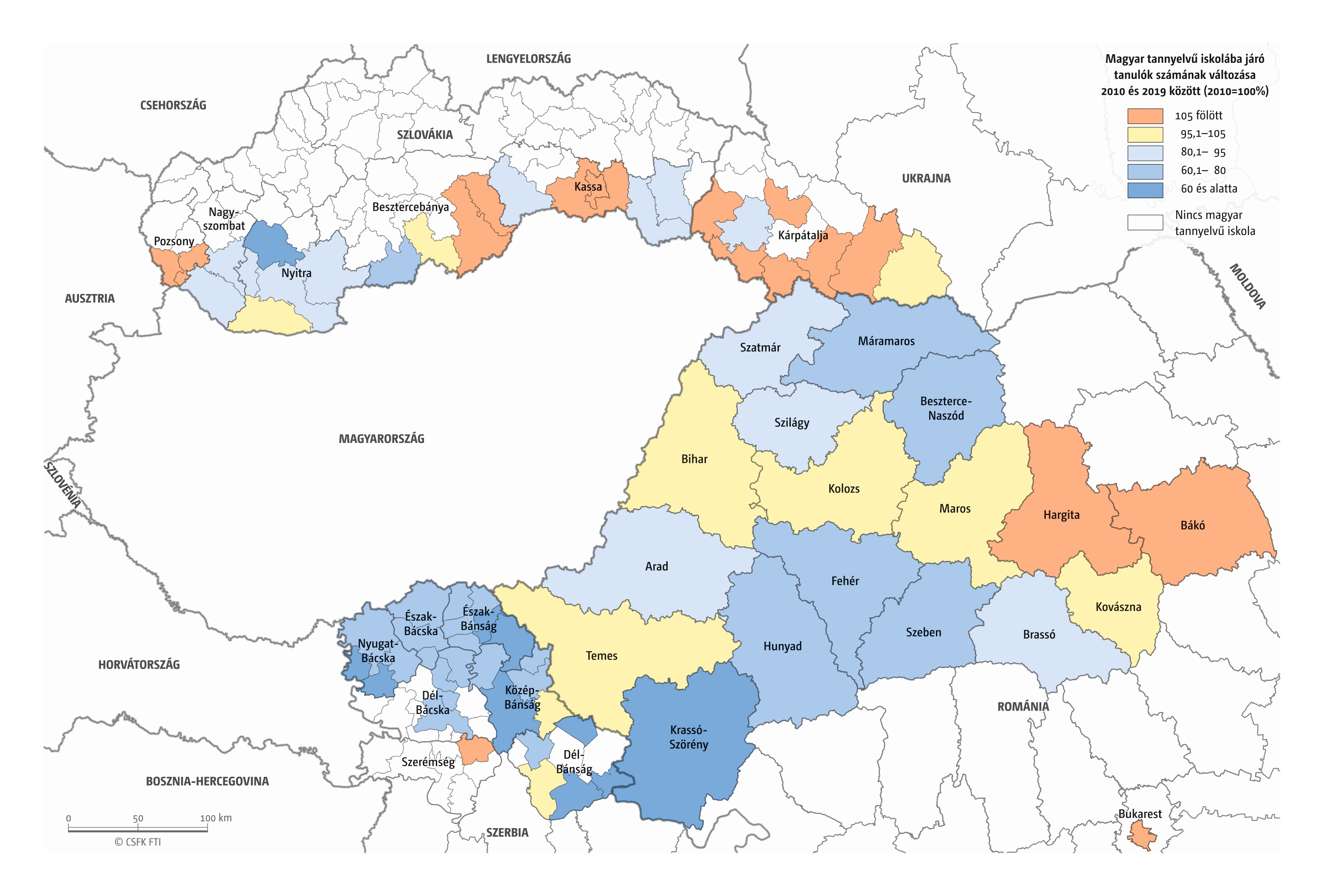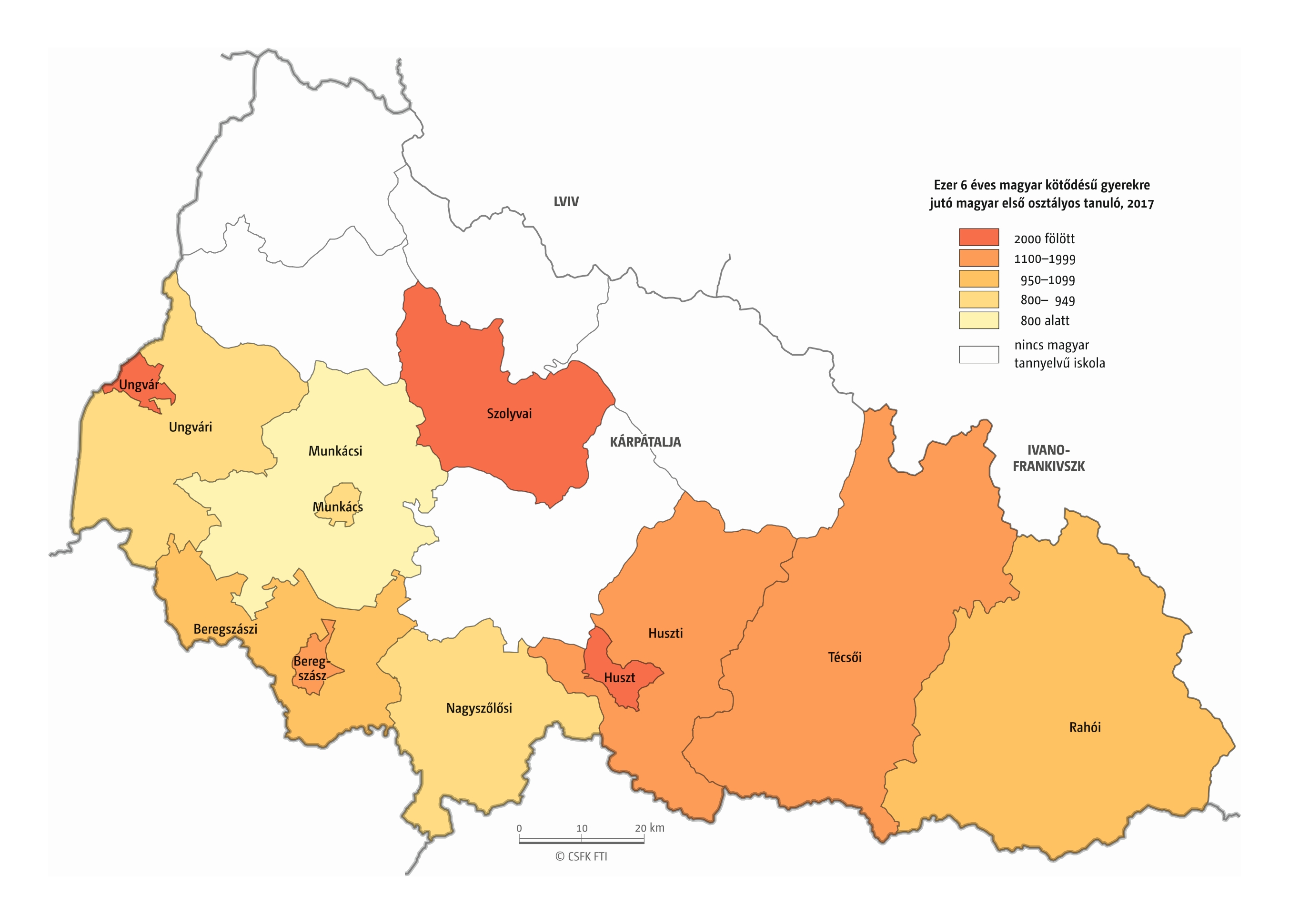 Hasonlóan jártunk el, amikor összevetettük a magyar iskolák elsőseinek számát és a hat évvel korábban született magyar nemzetiségűnek regisztráltak számát. Mivel itt sem esnek egybe az iskolaévek szerint rendelkezésre álló oktatási statisztikák és a naptári évek szerint gyűjtött népmozgalmi adatok, továbbá sok gyerek kezdi 7 éves korban az iskolát, valamint a születések számának éves ingadozása jelentős lehet, ezért a 2016–2019 közötti tanévek átlagos adatait vetettük össze a 2010–2013 közötti születések átlagával. Ez tehát szintén csak egy közelítő érték, de a főbb trendekről, az adott országon belüli regionális eltérésekről megfelelő képet ad.