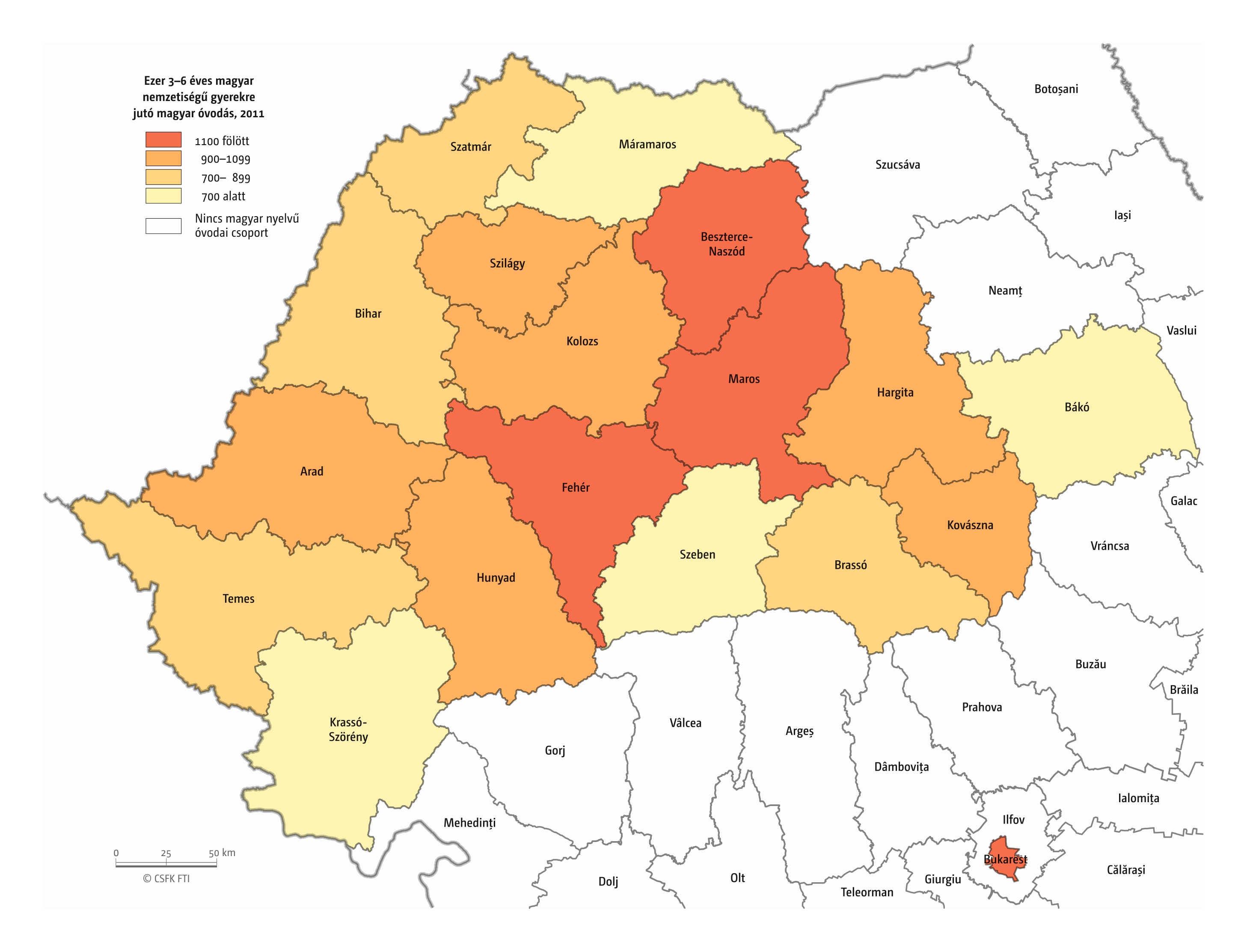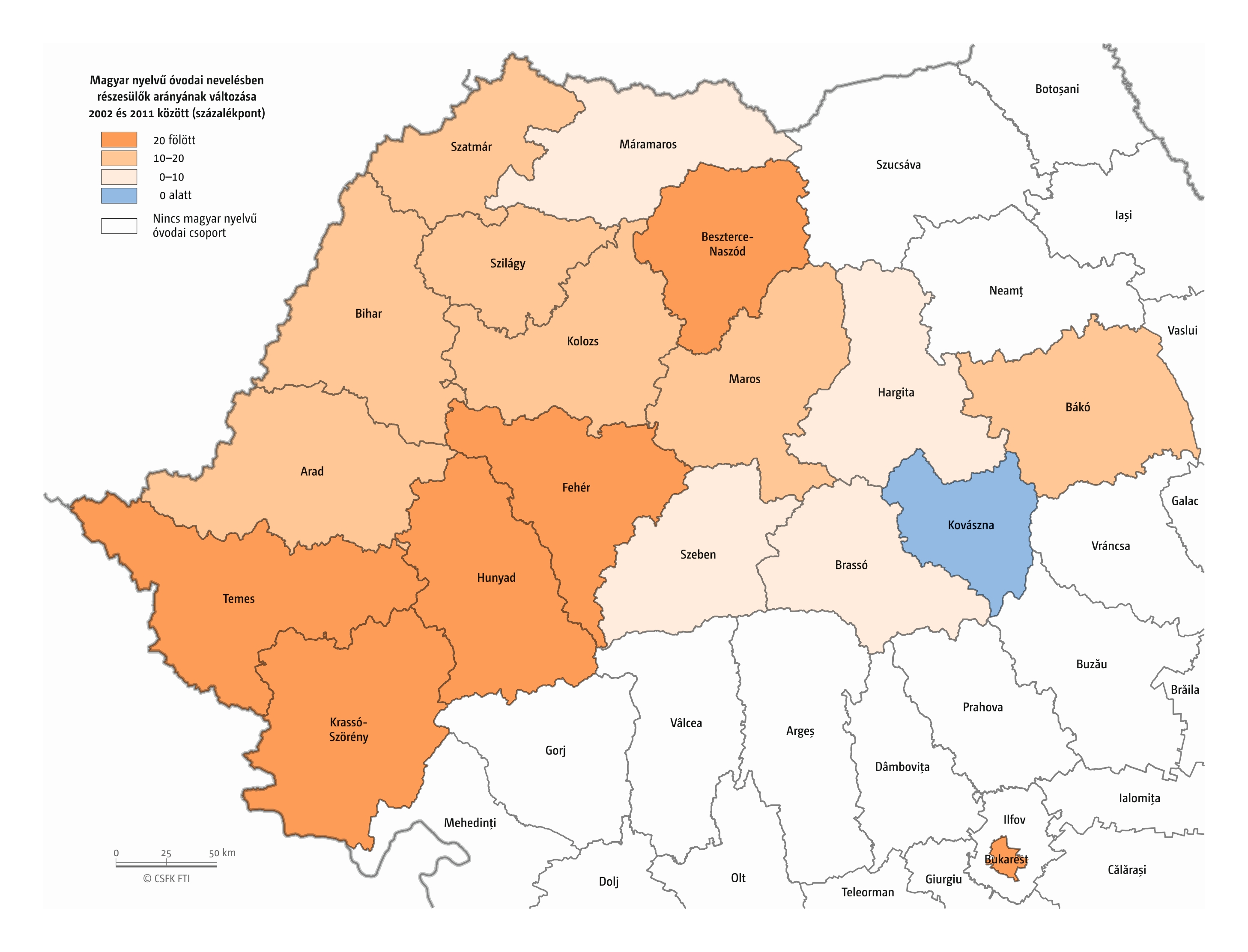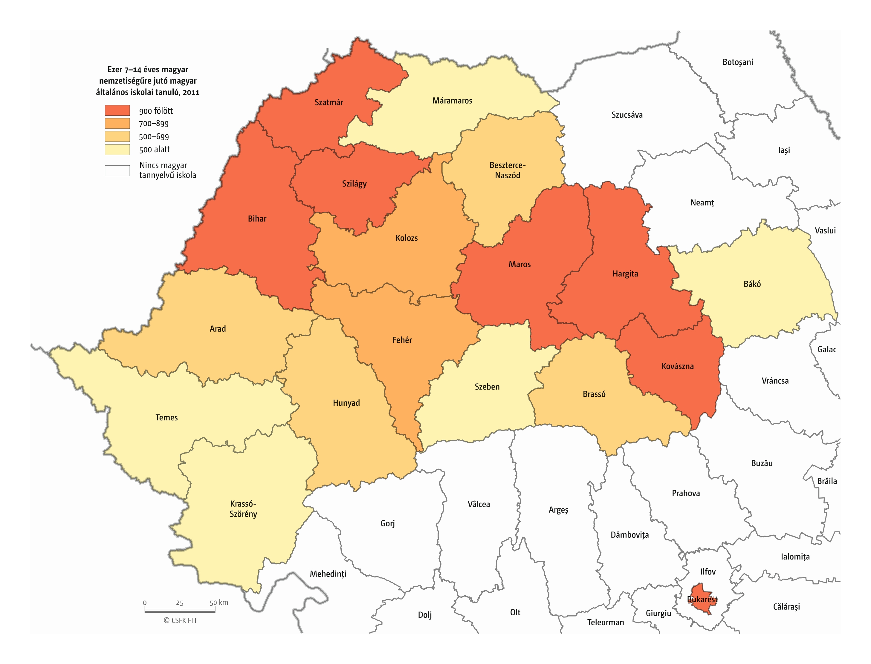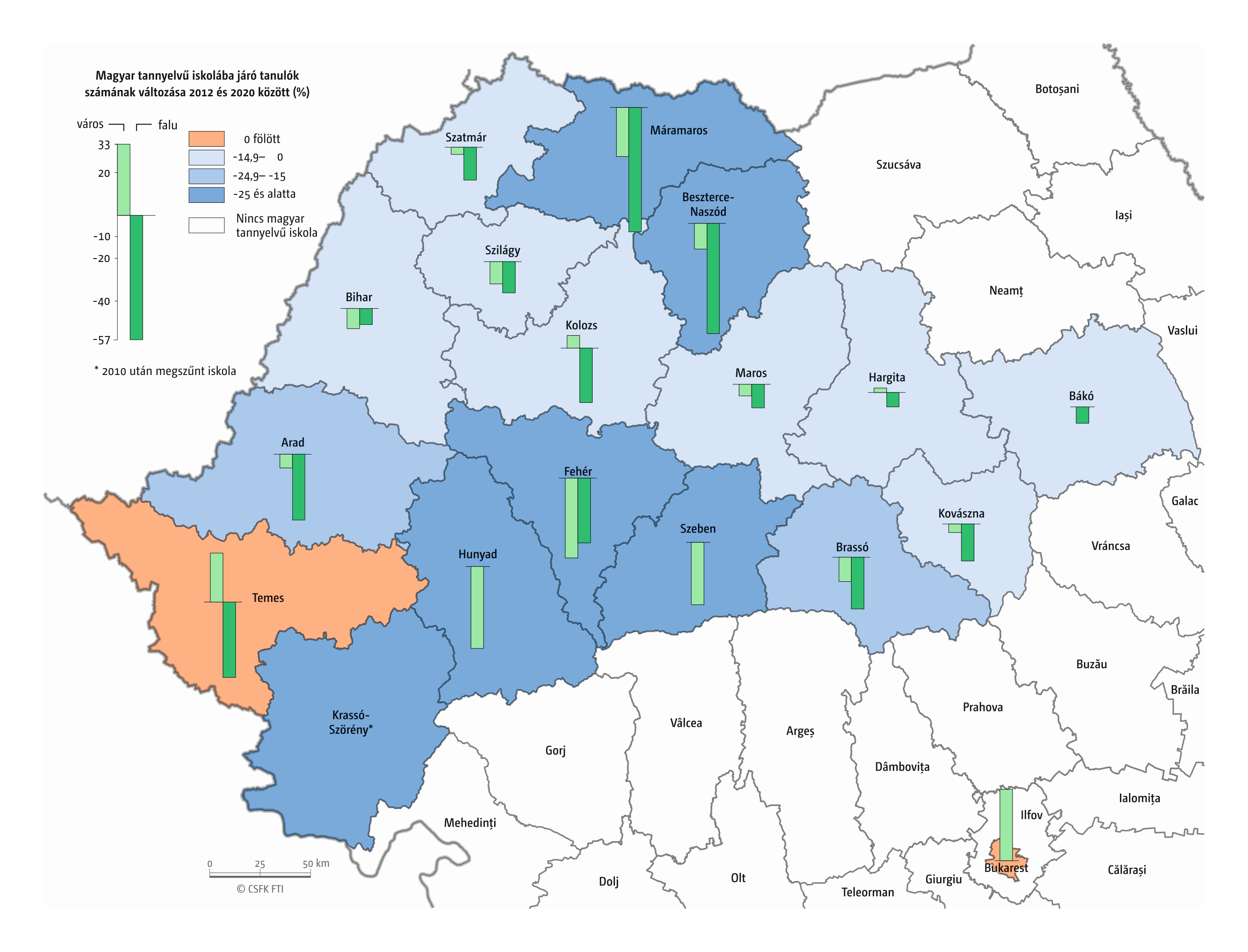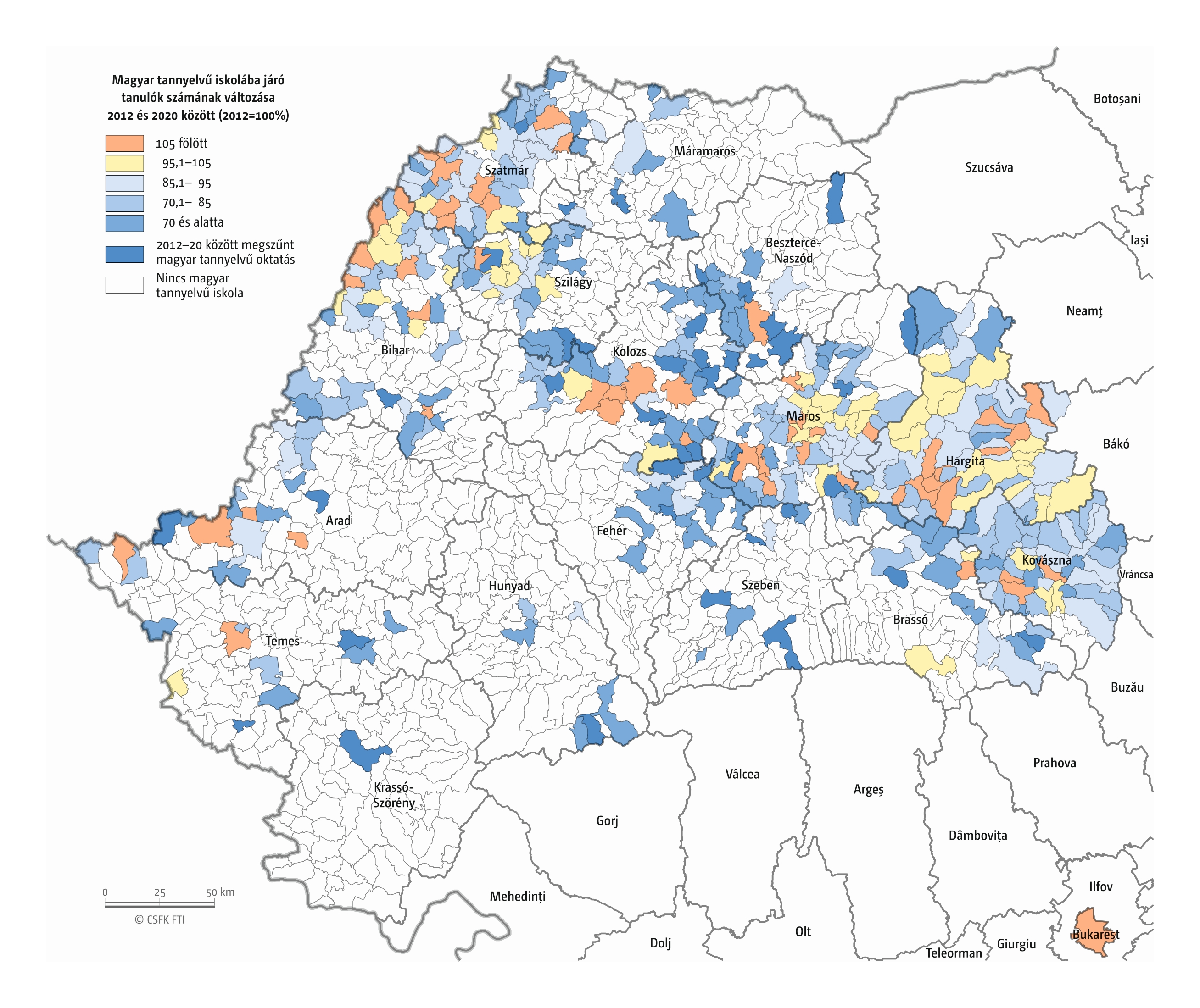 Hasonlóan jártunk el, amikor összevetettük a magyar iskolák elsőseinek számát és a hat évvel korábban született magyar nemzetiségűnek regisztráltak számát. Mivel itt sem esnek egybe az iskolaévek szerint rendelkezésre álló oktatási statisztikák és a naptári évek szerint gyűjtött népmozgalmi adatok, továbbá sok gyerek kezdi 7 éves korban az iskolát, valamint a születések számának éves ingadozása jelentős lehet, ezért a 2016–2019 közötti tanévek átlagos adatait vetettük össze a 2010–2013 közötti születések átlagával. Ez tehát szintén csak egy közelítő érték, de a főbb trendekről, az adott országon belüli regionális eltérésekről megfelelő képet ad.