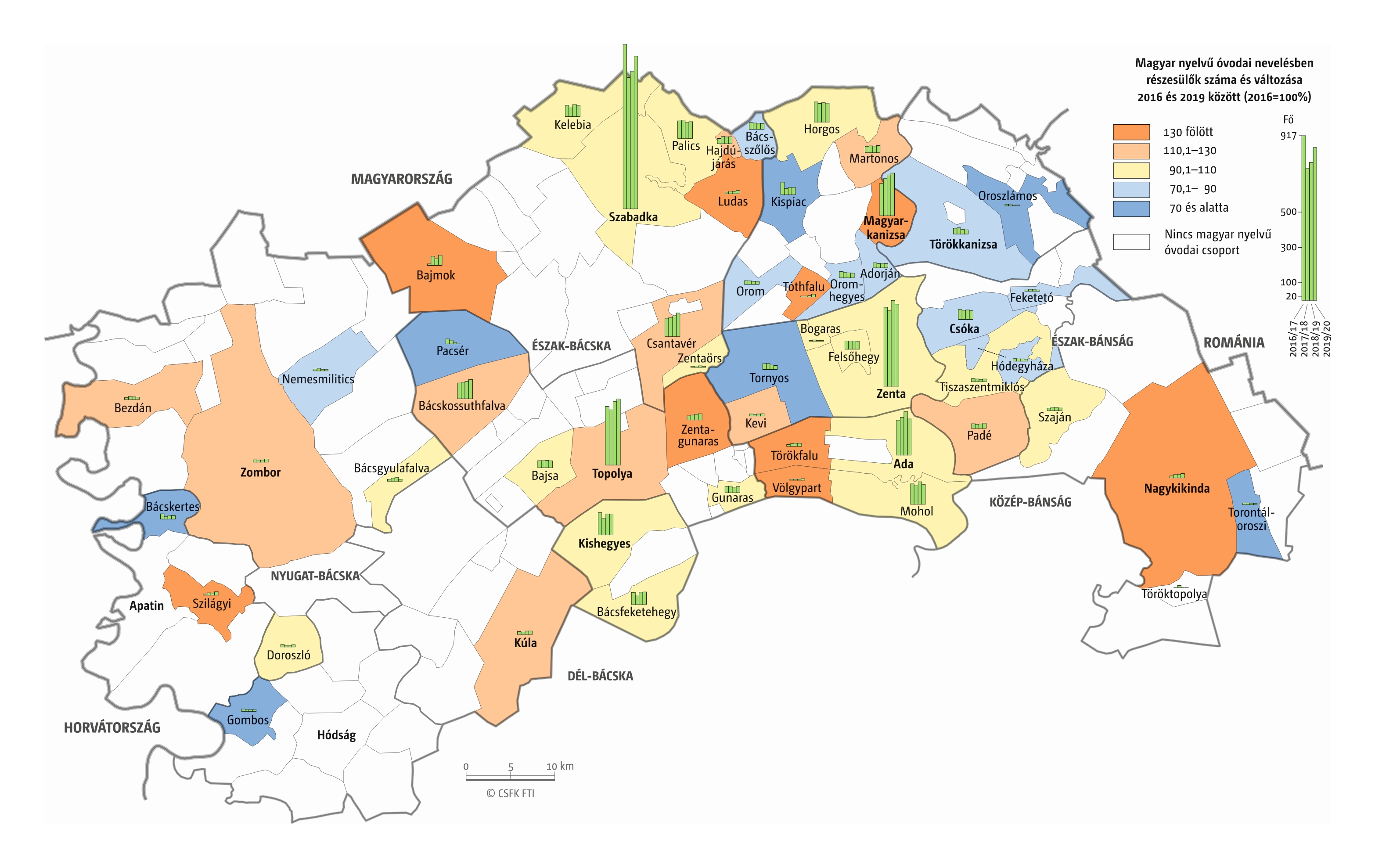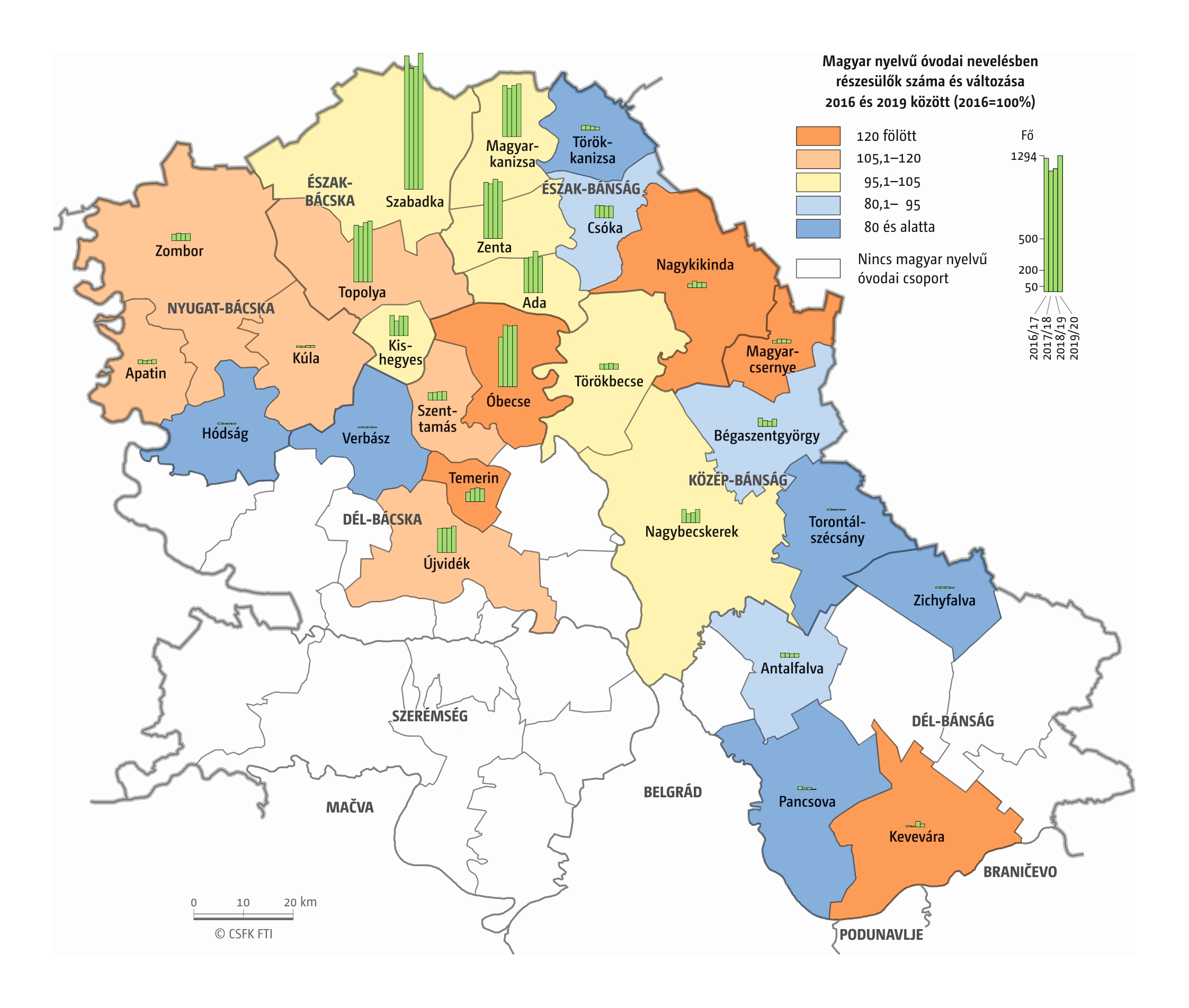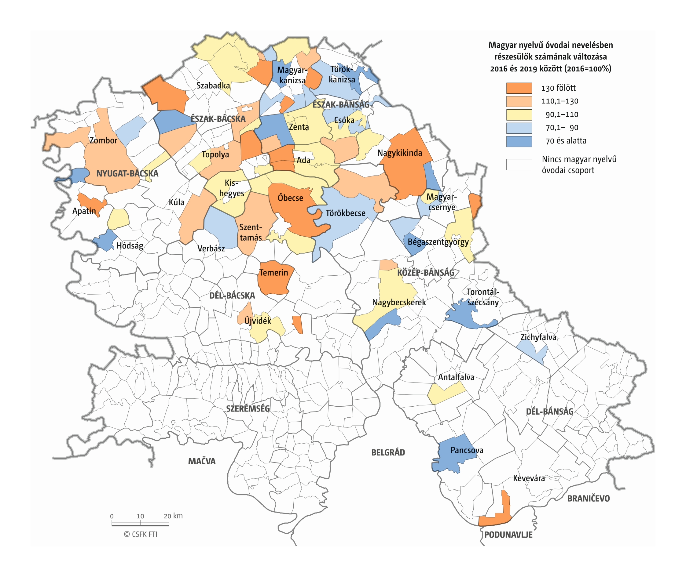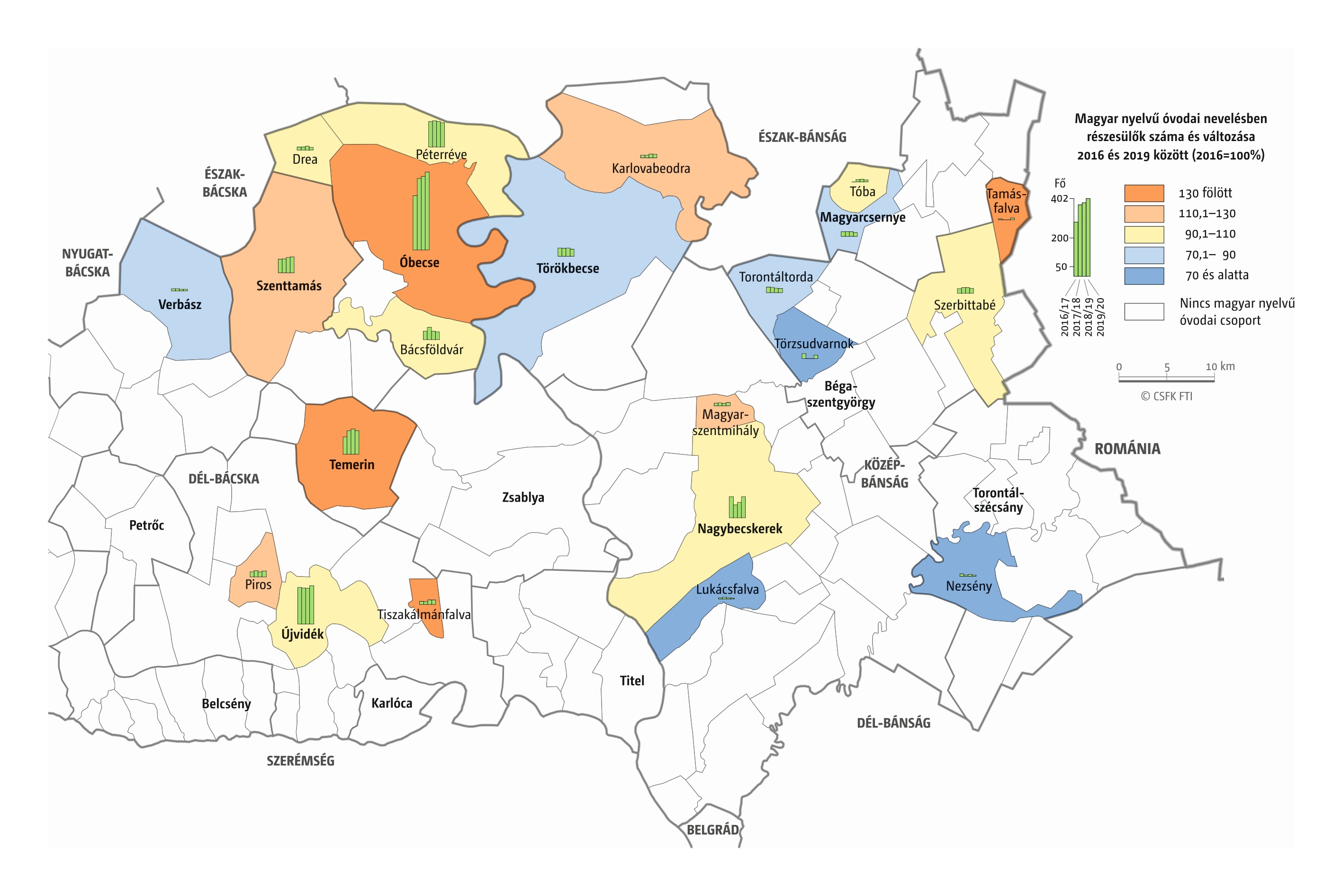 A Vajdaság esetében részletes óvodai adatok csak a 2016–2019 közötti négy tanévre álltak rendelkezésünkre települési szinten. Az iskola-előkészítő csoportokba járók száma pedig csak községi szinten volt elérhető a 2010–19-es időszakra. (A vizsgált országok közül az ukrajnai, romániai és szerbiai területi adminisztrációban az alapfokú közigazgatási egységek az egy vagy több településből álló községek. Ezek mérete változatos, Romániában és – a 2020-as közigazgatási reform óta – Ukrajnában általában pár település, míg Szerbiában a magyarországi járásnak megfelelő méretű.)