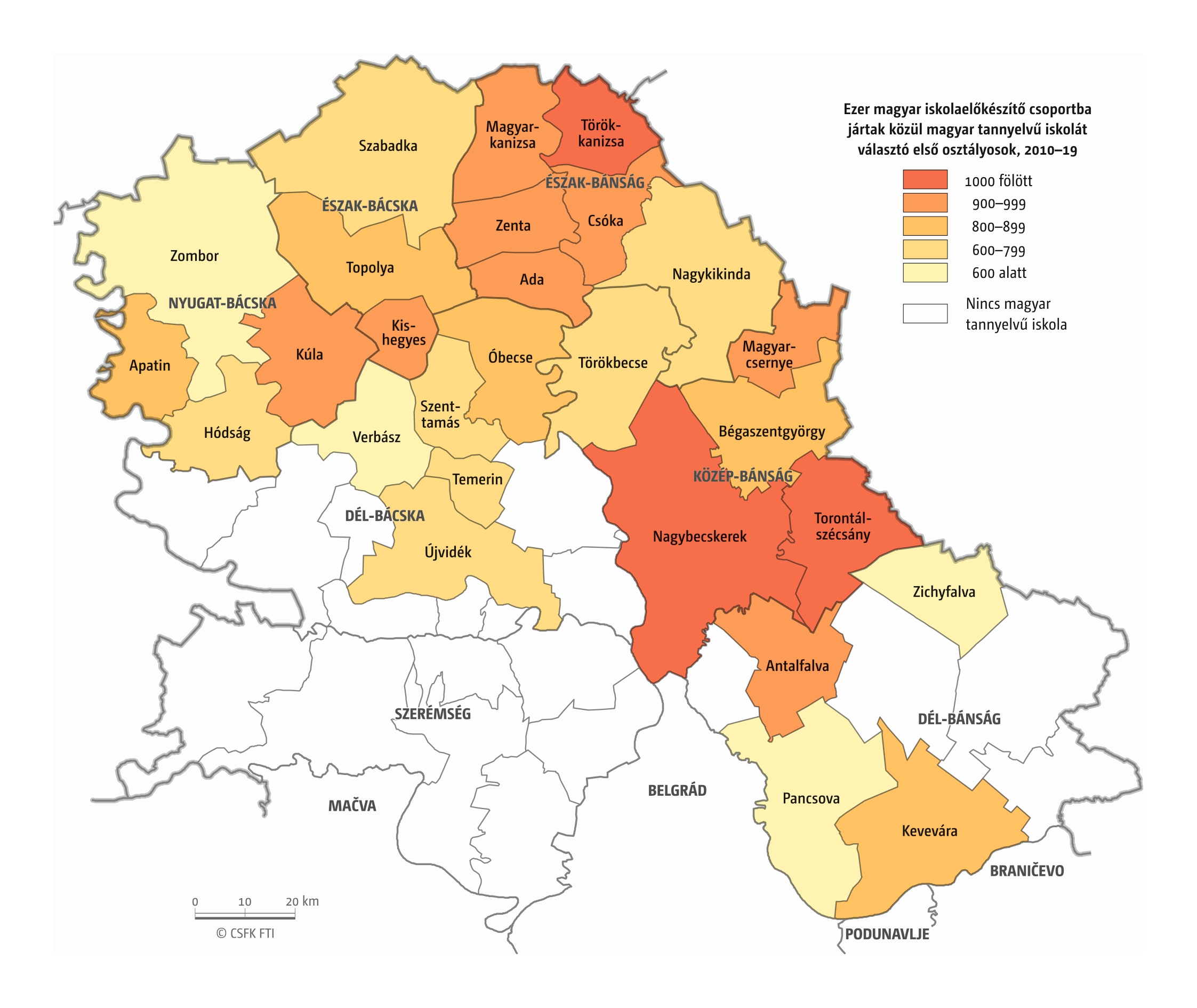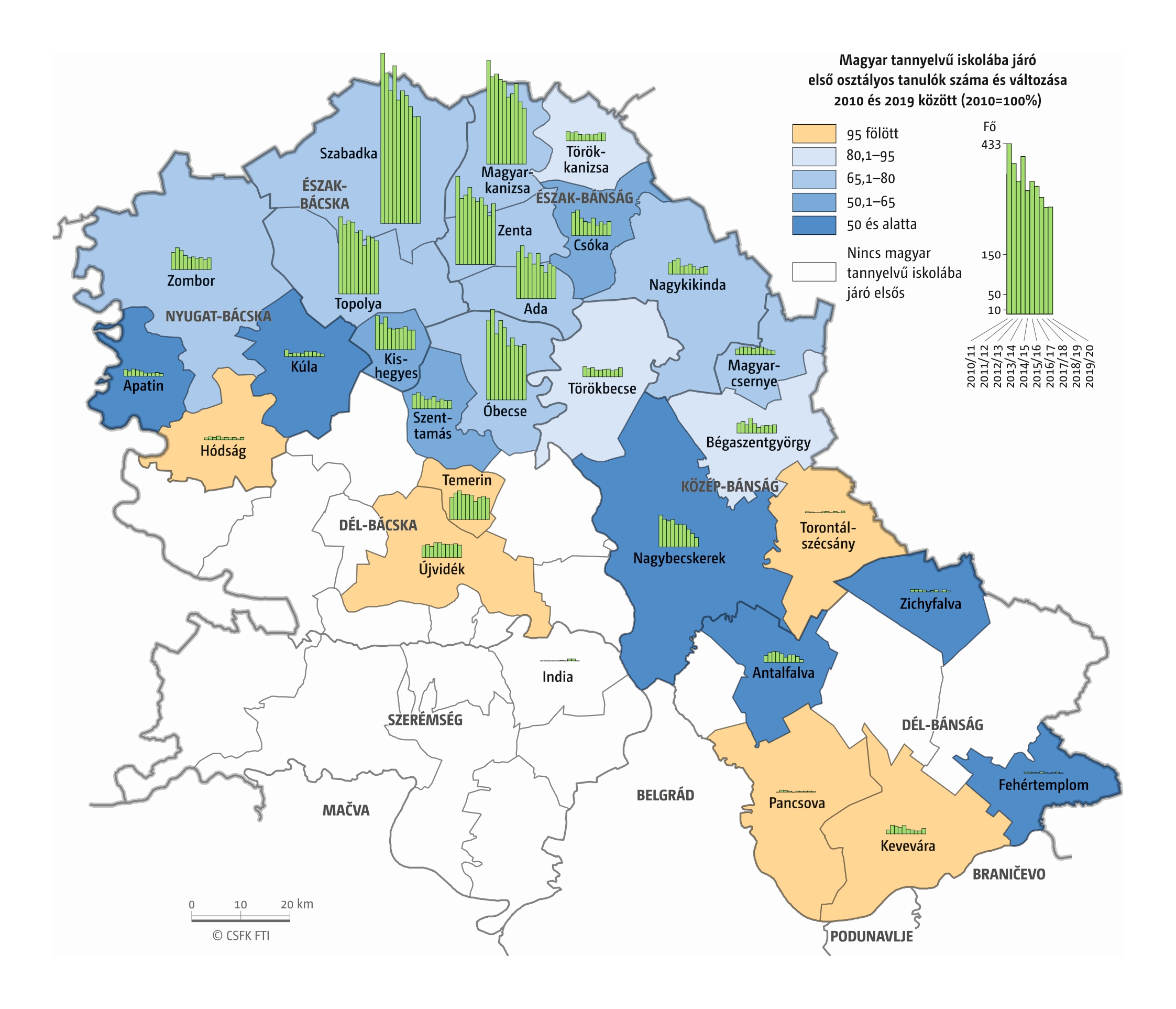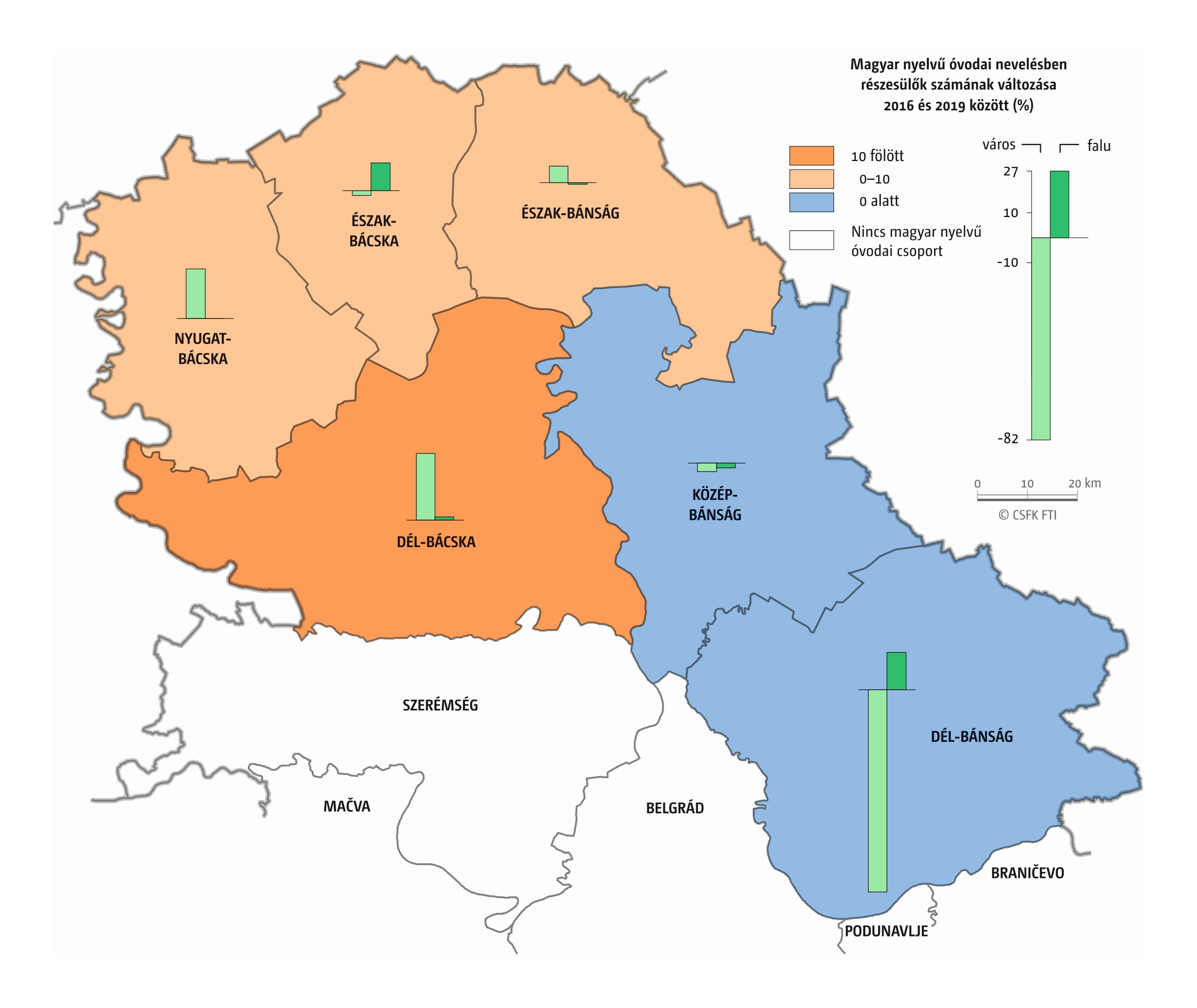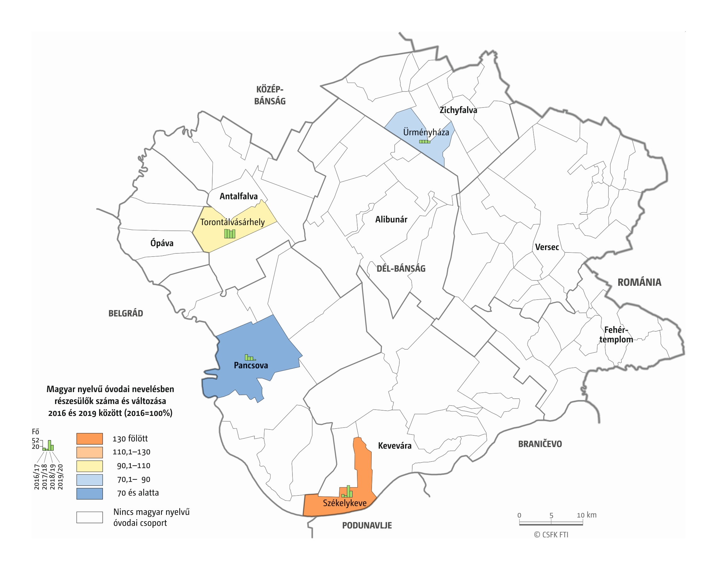 A Vajdaság esetében részletes óvodai adatok csak a 2016–2019 közötti négy tanévre álltak rendelkezésünkre települési szinten. Az iskola-előkészítő csoportokba járók száma pedig csak községi szinten volt elérhető a 2010–19-es időszakra. (A vizsgált országok közül az ukrajnai, romániai és szerbiai területi adminisztrációban az alapfokú közigazgatási egységek az egy vagy több településből álló községek. Ezek mérete változatos, Romániában és – a 2020-as közigazgatási reform óta – Ukrajnában általában pár település, míg Szerbiában a magyarországi járásnak megfelelő méretű.)