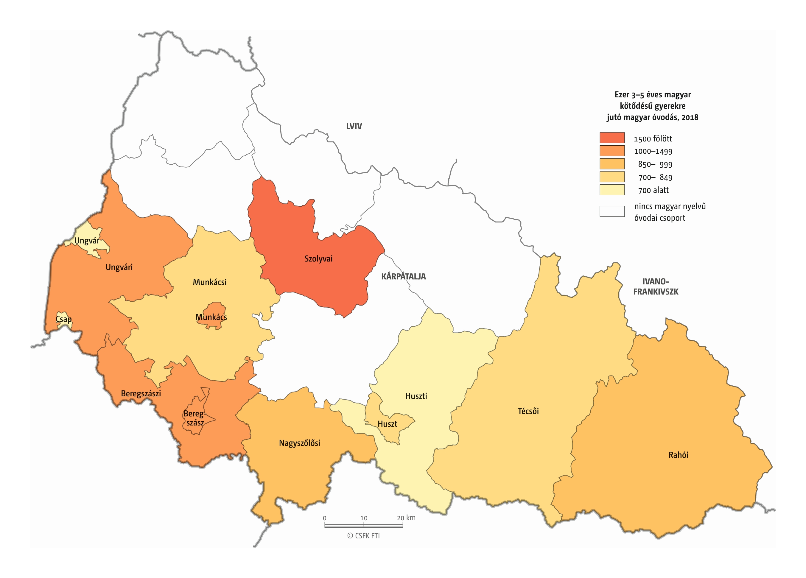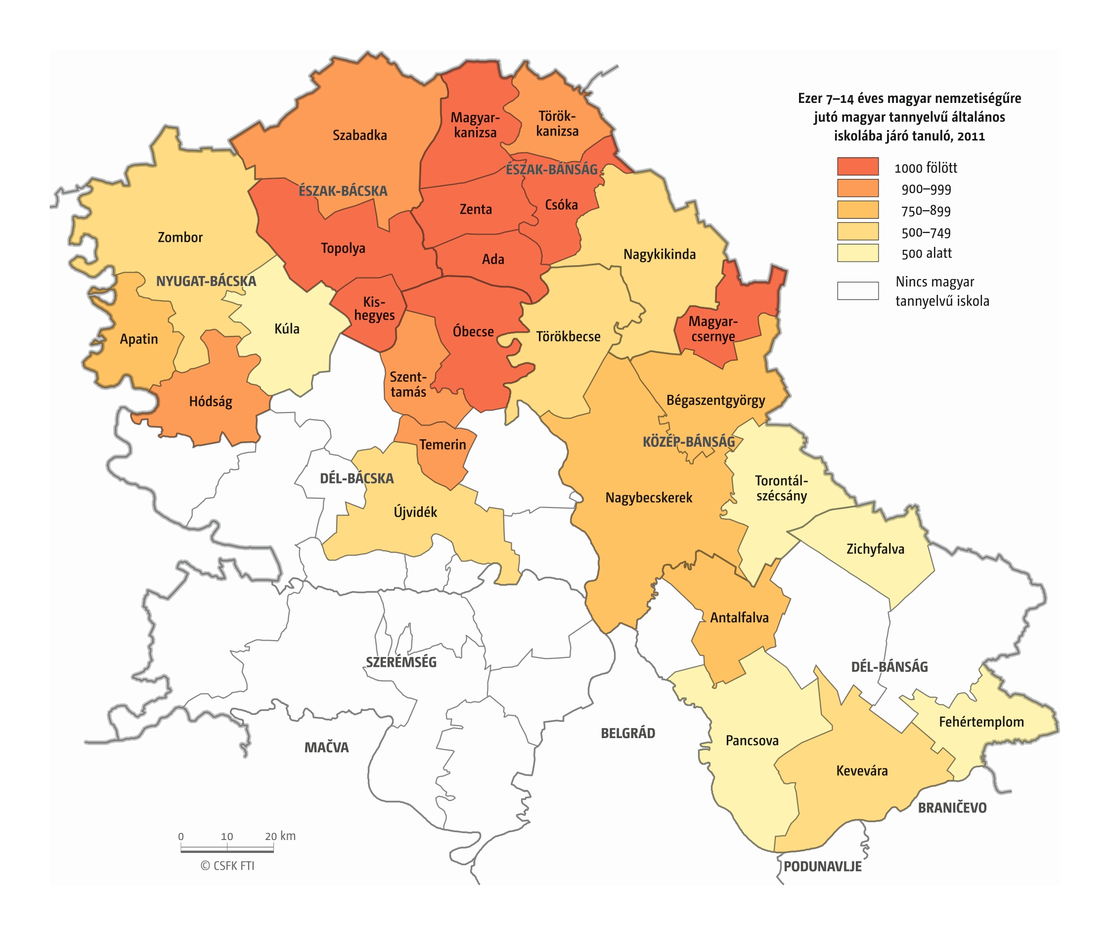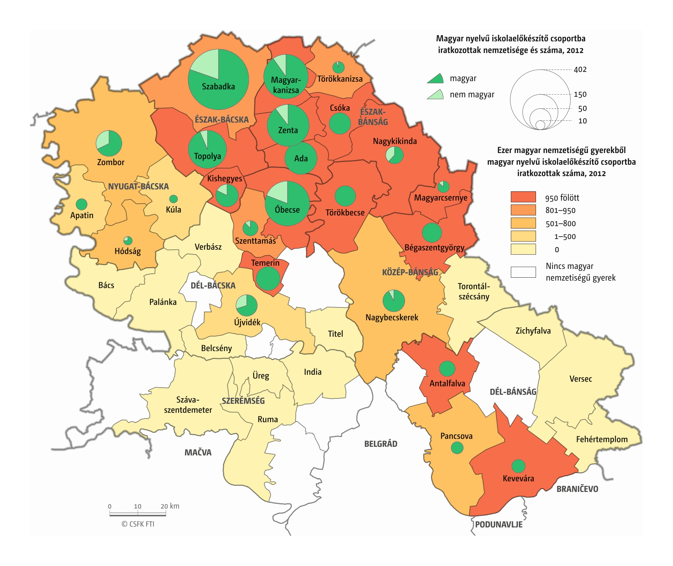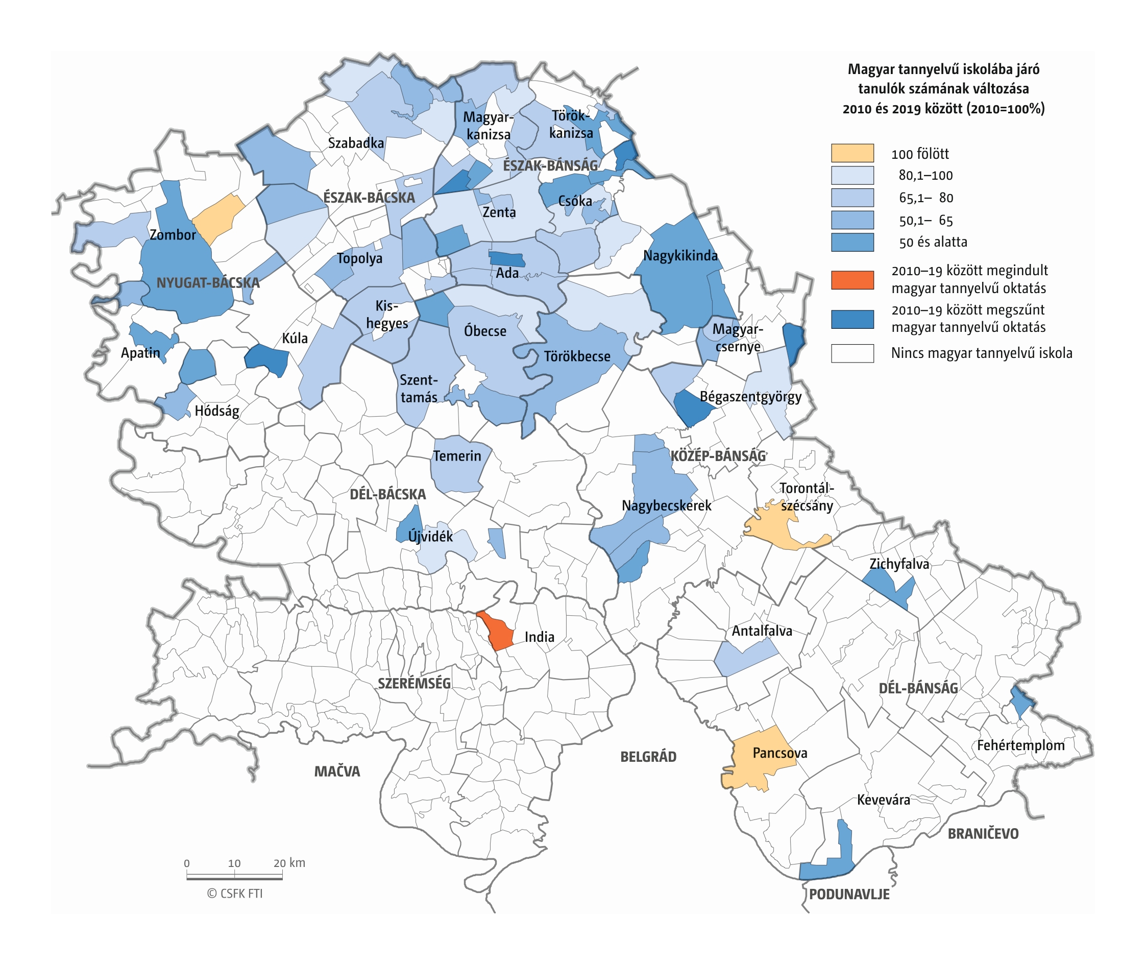 A Vajdaság esetében részletes óvodai adatok csak a 2016–2019 közötti négy tanévre álltak rendelkezésünkre települési szinten. Az iskola-előkészítő csoportokba járók száma pedig csak községi szinten volt elérhető a 2010–19-es időszakra. (A vizsgált országok közül az ukrajnai, romániai és szerbiai területi adminisztrációban az alapfokú közigazgatási egységek az egy vagy több településből álló községek. Ezek mérete változatos, Romániában és – a 2020-as közigazgatási reform óta – Ukrajnában általában pár település, míg Szerbiában a magyarországi járásnak megfelelő méretű.)