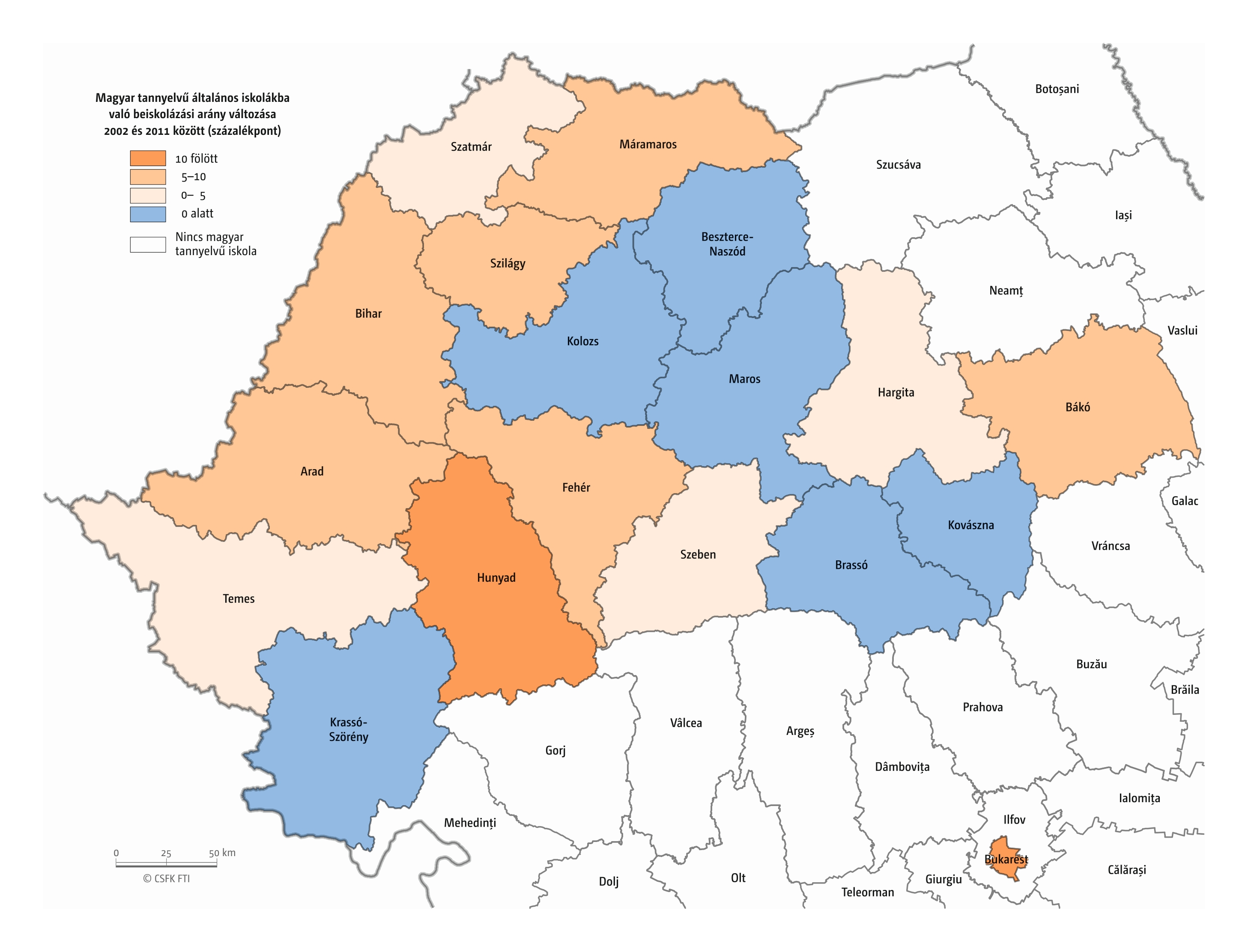 Az általános és a középiskolai tanulókat összesítve egy még általánosabb képet kaphatunk a Kárpát-medencei kisebbségi magyar iskoláztatás helyzetéről. A magyar iskoláztatásban résztvevők száma összességében 8%-kal csökkent 10 év alatt (206 ezerről 190 ezerre). A változások területi mintázata Szlovákiában elsősorban a magyar anyanyelvű cigányság területi elhelyezkedését rajzolja ki, de megjelenik a tömb–szórvány különbség, és a belső migrációs folyamatok hatása is; Kárpátalján a többi régióhoz viszonyított rendkívül kedvező helyzet látható, Erdélyben és kisebb mértékben a Vajdaságban a tömb–szórvány kettősség tűnik a legfőbb magyarázó tényezőnek a vizsgálat ezen területi szintjén (82. térkép).