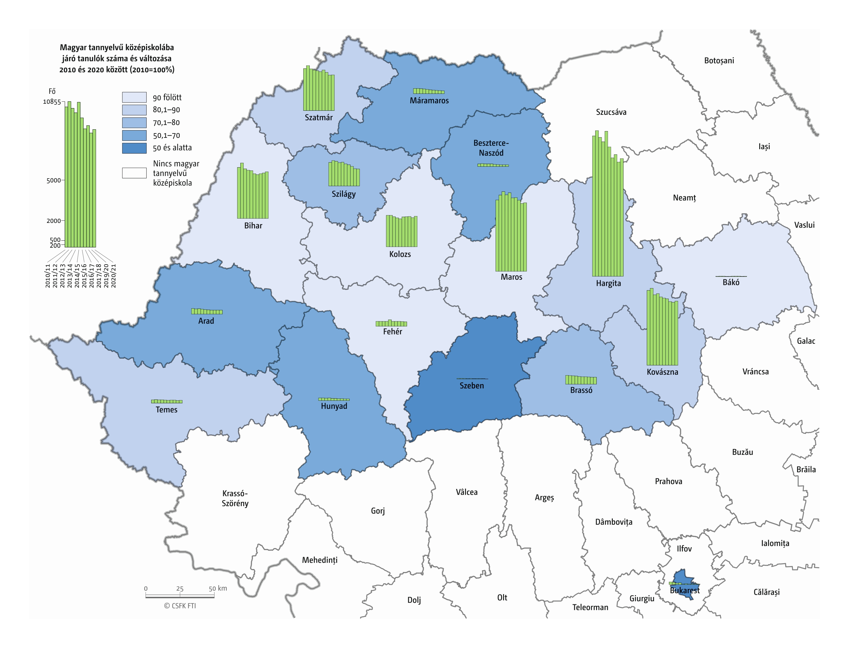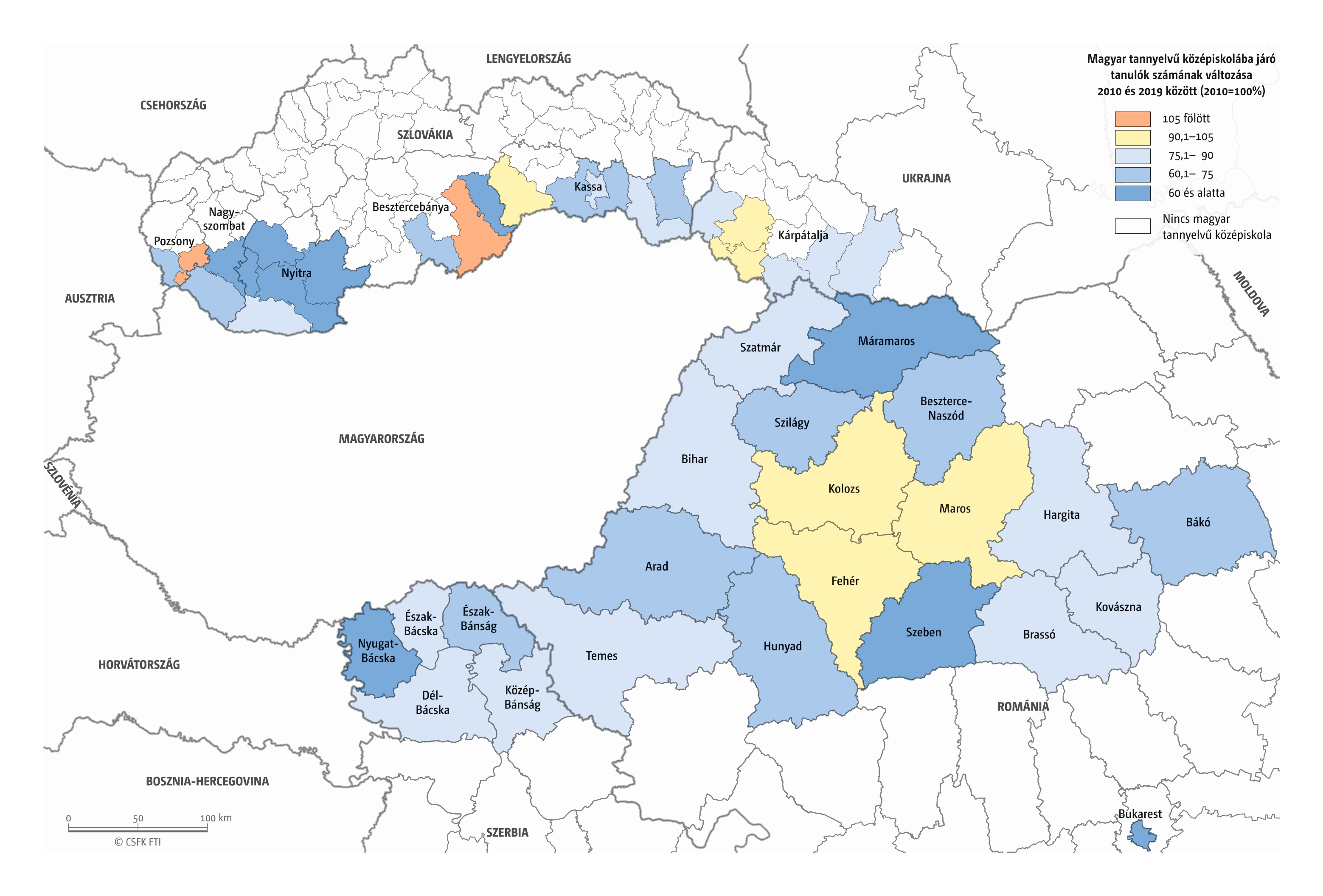 A határon túli magyar középiskolai tanulók száma 2010 és 2019 között jelentős mértékben, közel ötödével, 56 ezerről 45,3 ezerre csökkent. A csökkenés mértéke Szlovákiában és a Vajdaságban jelentősebb, Erdélyben és Kárpátalján mérsékeltebb volt. Szlovákiát leszámítva a középiskolai tanulók számának csökkenése volt jellemző lényegében az összes közigazgatási egységre (81. térkép). Dél-Szlovákiában ugyanakkor egyaránt megtalálhatók a növekedést mutató járások, és kiterjedt, drasztikus fogyással jellemezhető járáscsoportok is. A középiskolai tanulók esetében a magyarországi tanulmányok folytatása arányaiban jelentősebb, mint az általános iskolai tanulók esetében – a négy vizsgált országból származó tanulók összesített létszáma 2200–2800 fő között alakult a 2010-es években –, de mindez nem volt érdemi hatással a határon túli középiskolás tanulói kontingens csökkenésére, mivel a vizsgált időszakban a Magyarországon tanuló külhoni magyar középiskolás diákok száma is csökkent.