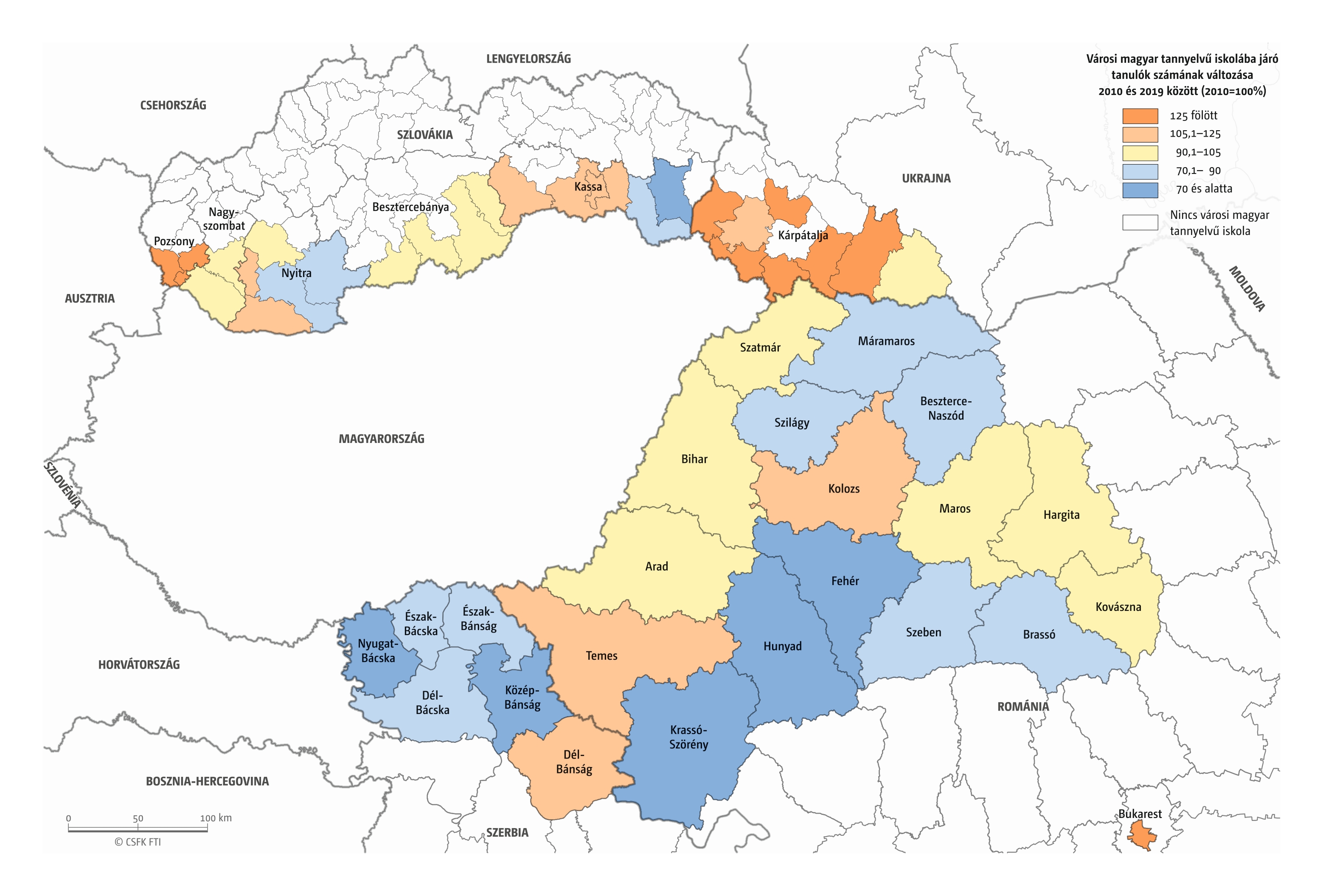 82. térkép: A külhoni magyar tannyelvű iskoláztatásban részesülő tanulók számának változása a Kárpát-medencében, 2010–2019