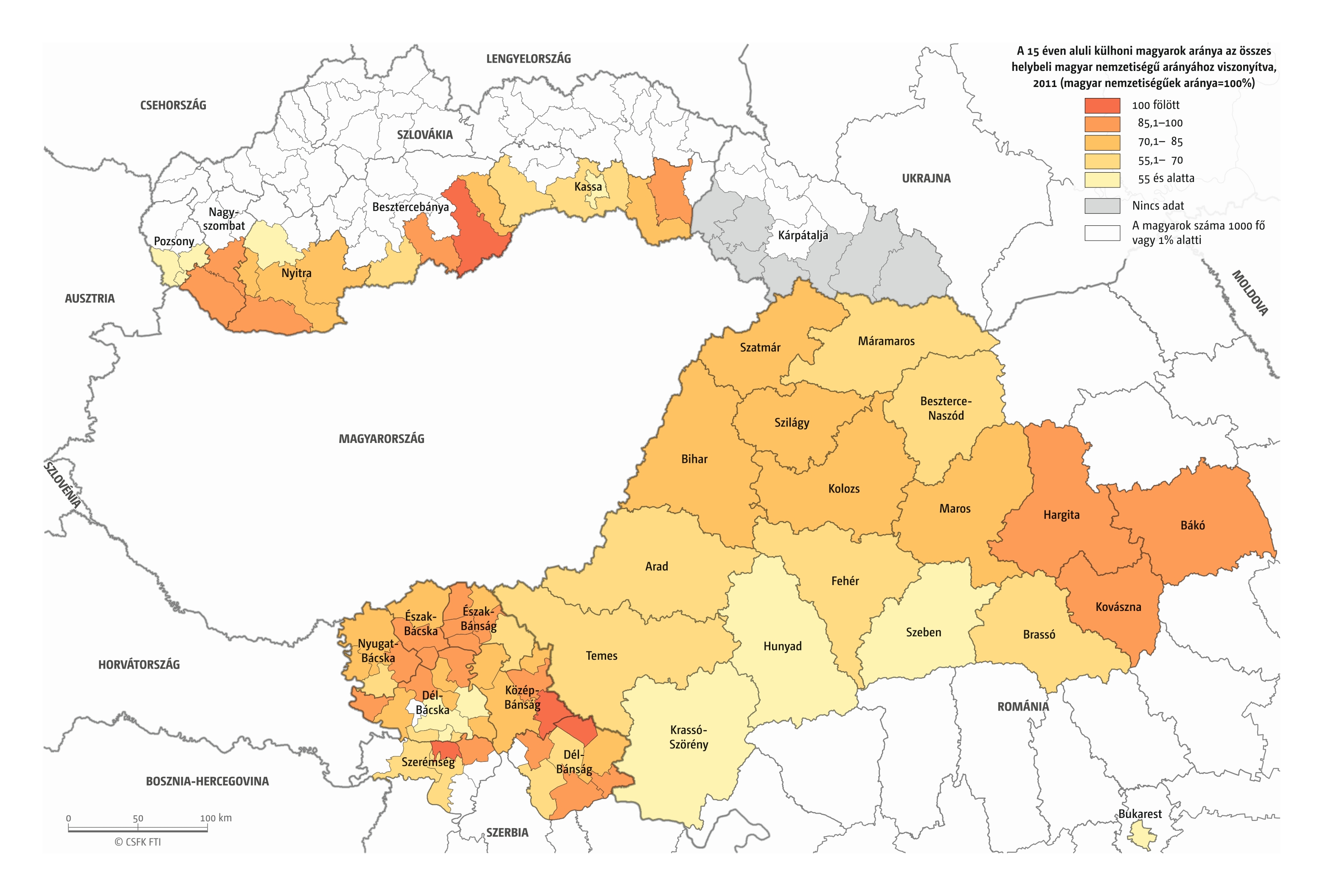 A fentiekben ismertetett beiskolázási adatok természetesen nem választhatók el a demográfiai folyamatoktól, még ha rövid távon esetenként a beiskolázási és demográfiai trendek el is térnek egymástól. A magyar kisebbségi közösségek demográfiai helyzetét egyaránt befolyásolják a közösségük demográfiai jellemzői (pl. korcsoportos megoszlás), valamint az adott országon belüli, a teljes népességhez viszonyított pozíciójuk. Az iskoláztatás kapcsán kiemelten érdekes a 15 év alatti korosztály helyzete. E korcsoport relatív pozícióit egyrészt a 15 év alatti magyarok saját korcsoportjukhoz viszonyított, valamint az összes magyar nemzetiségűnek a teljes lakossághoz viszonyított arányának a különbségével igyekszünk mérni. Mindez azt mutatja meg, hogy a magyar nemzetiségű lakosság népszámlálási arányához képest (90. térkép) a 15 éven aluliak milyen arányban élnek az adott területen, amiből a jövőbeli etnikai arányokra is következtethetünk. 100 feletti érték esetén a 15 éven aluli magyarok aránya meghaladja az összes magyar nemzetiségű helyi arányát, ez tehát a jövőre nézve kedvező forgatókönyvet jelez. Jól látszik, hogy a 15 éven aluliak relatív helyzete markánsan összefügg adott közigazgatási egység etnikai arányaival: minél magasabb a magyarok aránya, annál közelebb van 100-hoz a vonatkozó érték (83. térkép). A másik fontos befolyásoló tényező a magyar nyelvű cigányság jelenléte (pl. Gömörben). Ugyanakkor meglepő módon a vajdasági szórvány egyes községeiben (pl. Zichyfalva, Torontálszécsány, Ürög) is kedvező ez az érték.