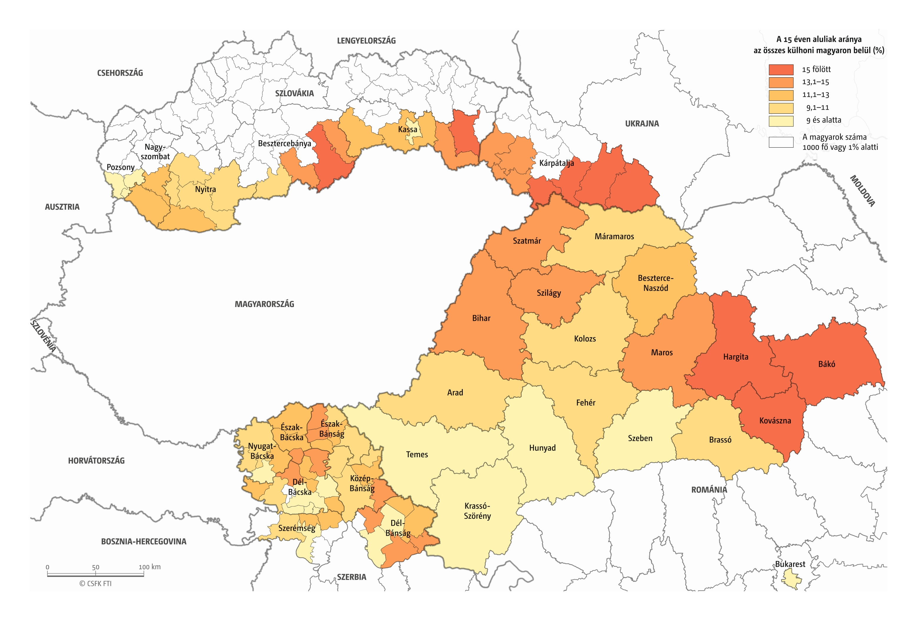 A 15 év alattiak aránya az összes magyar nemzetiségű lakoson belül a magyarok korcsoportos szerkezetéről, demográfiai helyzetéről informál. Minél magasabb a mutató értéke, annál nagyobb a fiatal korosztályok részesedése, annál nagyobb a magyar közoktatásban potenciálisan részt vevők száma. Jól látható, hogy e mutató esetében is elsősorban a tömb–szórvány különbség a meghatározó, habár Szlovákiában kirajzolódik a magasabb fertilitású magyar cigány népesség elhelyezkedése is, míg Kárpátalján a természetes szaporodás tradicionális nyugat–keleti különbségei mutatkoznak meg (84. térkép). A Vajdaság ebben az esetben is valamelyest eltér a többi régiótól, amennyiben kisebb különbség látható a magyarok által magasabb és alacsonyabb arányban lakott községek, azaz tömb és szórvány között.