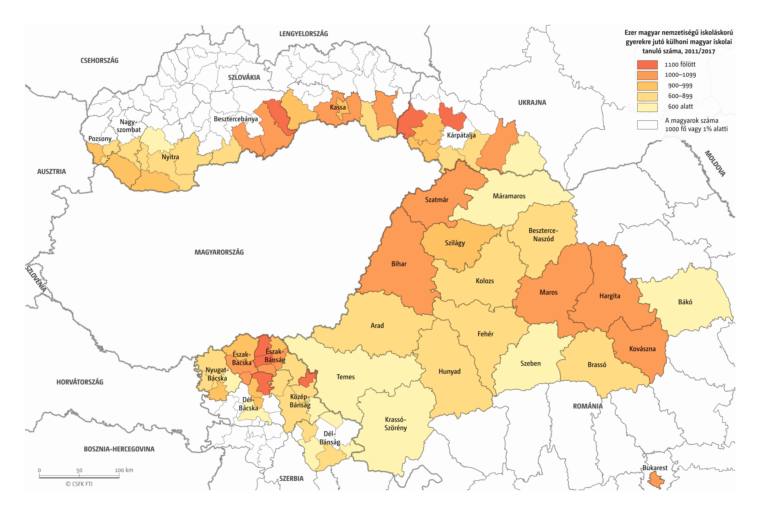 85. térkép: Ezer magyar nemzetiségű iskoláskorú gyerekre jutó külhoni magyar iskolai tanuló száma a Kárpát-medencében, 2011/2017