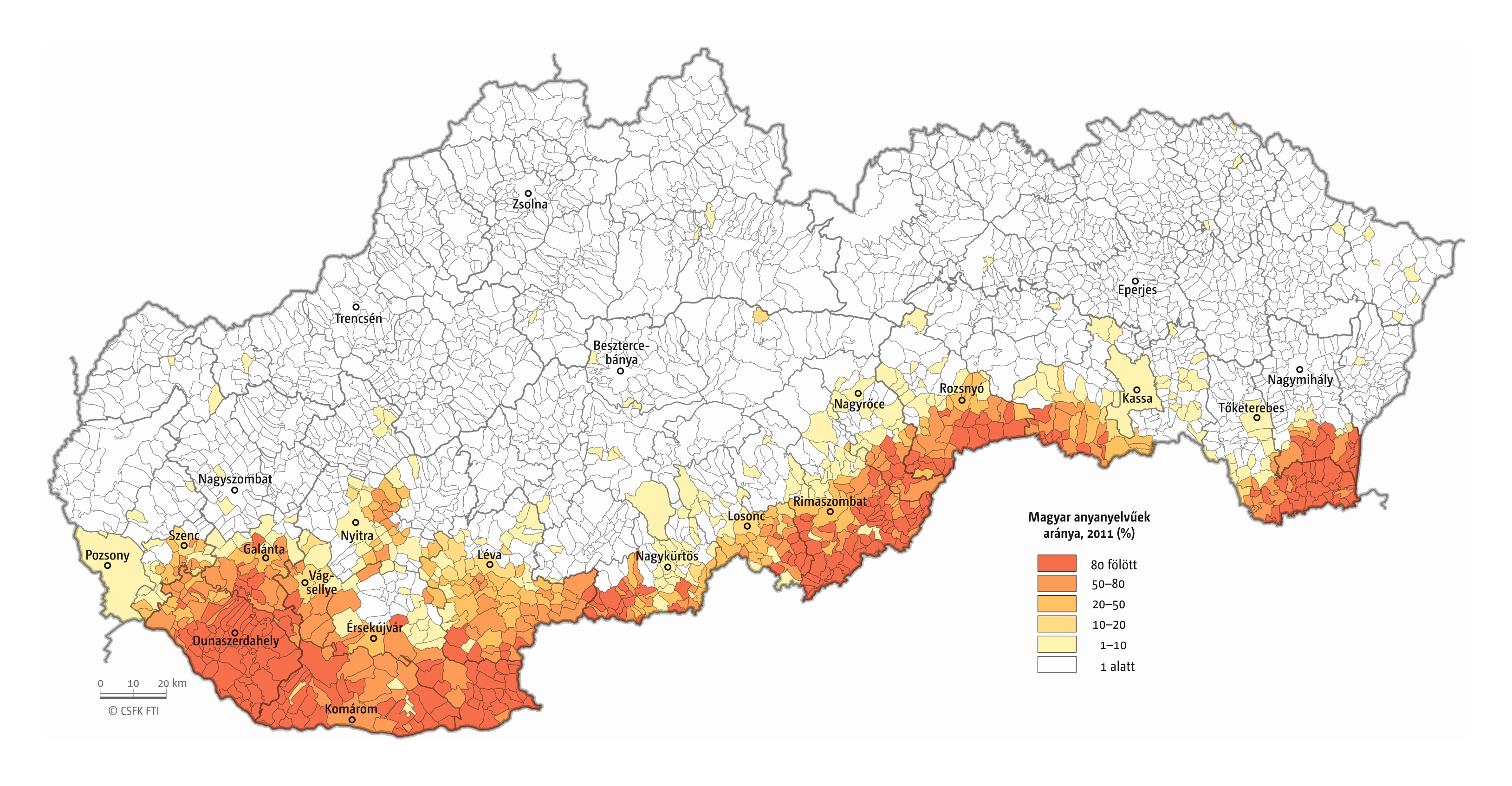 86. térkép: A magyar anyanyelvűek aránya Szlovákia településein, 2011