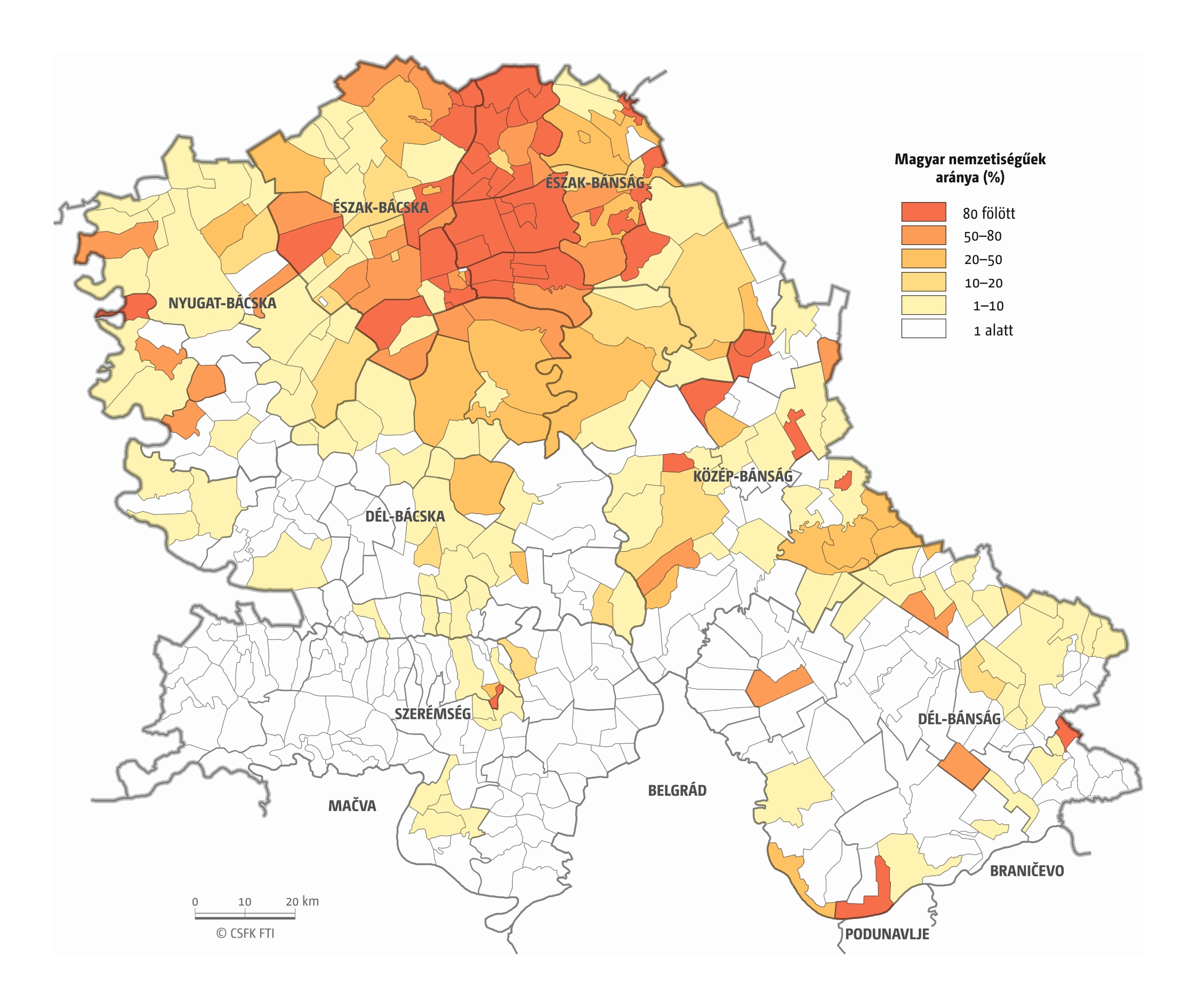 89. térkép: A magyar anyanyelvűek aránya a Vajdaság településein, 2011
