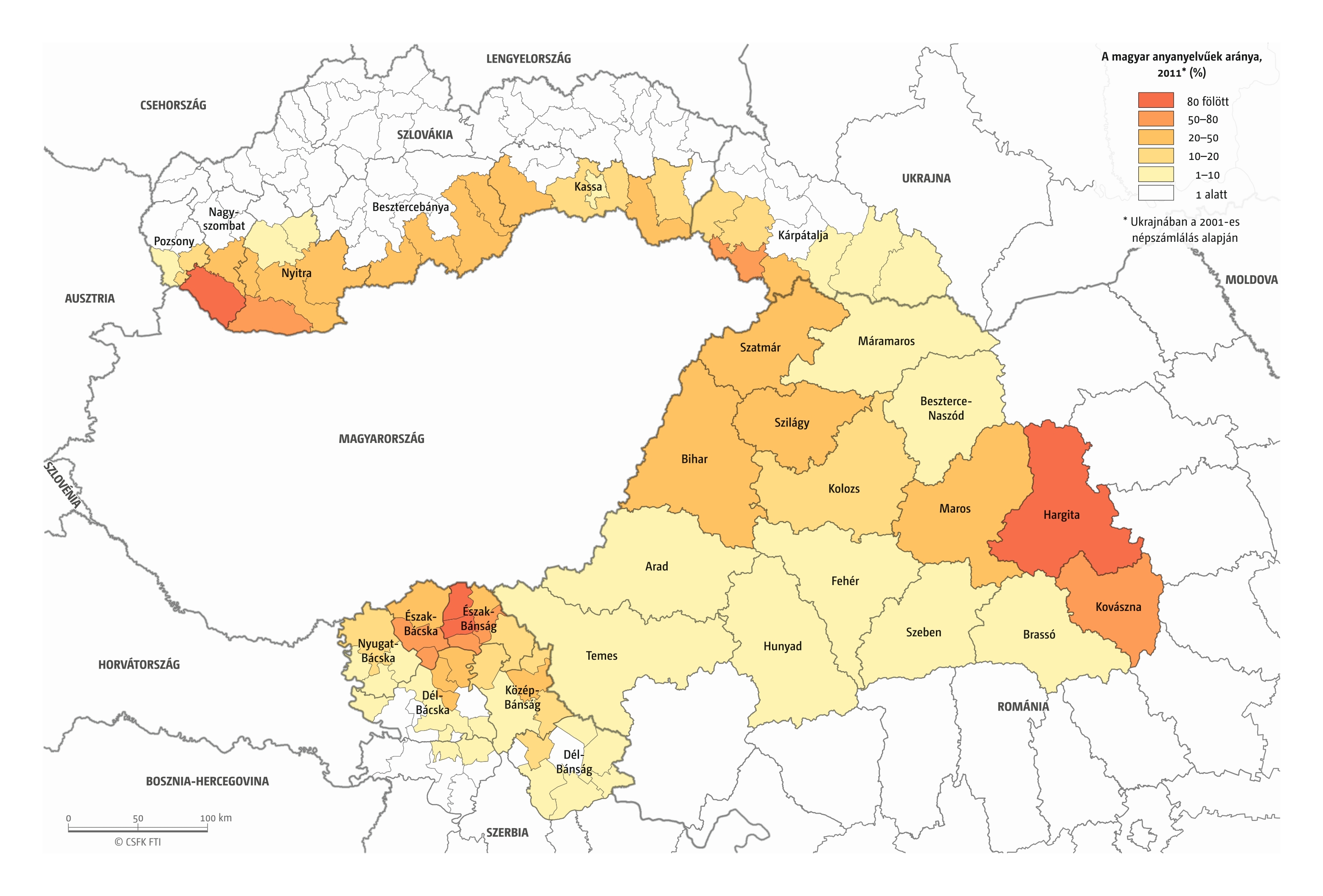 90. térkép: A magyar anyanyelvűek aránya a Kárpát-medence vizsgált területein, 2011
