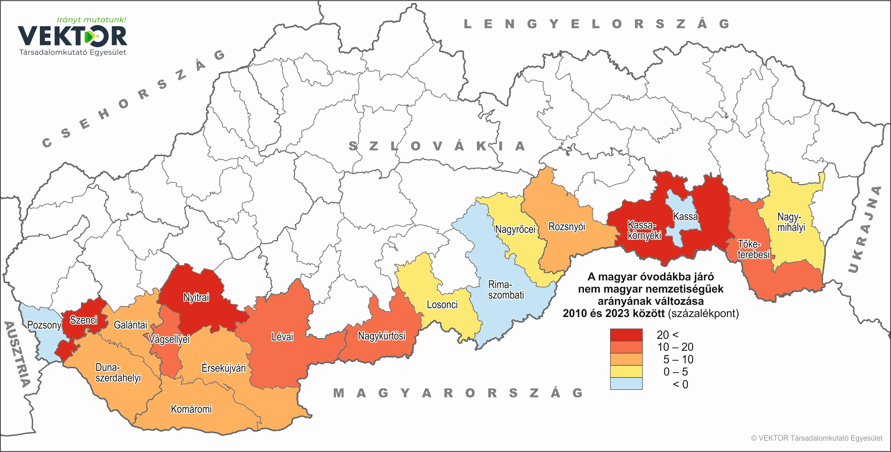 A magyar nevelési nyelvű óvodai intézményeket látogató gyerekek száma nőtt tehát, de ez nem jelenti azt, hogy a magyar nemzetiségű óvodások száma is hasonló mértékben nőtt. Sőt, az adatok alapján 2010 és 2023 között 3%-kal, 9952-ről 9672-re csökkent a számuk, ami tehát azt mutatja, hogy a kedvező beóvodázási adatok mögött nem állnak szükségszerűen kedvező demográfiai folyamatok. A magyar nemzetiségű óvodások számának változása területileg egyenlőtlenül zajlott le. A nyugati járások közül (Pozsonytól a Lévai járásig) csak Pozsonyban és a Dunaszerdahelyi járásban pozitív előjelű a magyar nemzetiségű óvodások számának a változása, ezekben a közigazgatási egységekben elsősorban az országon belüli migráció, illetve ennek egy speciális válfaja, a szuburbanizáció járult hozzá a gyerekszám növekedéséhez. Szintén a belső migráció eredménye a kassai magyar nemzetiségű óvodások számának kiugró, másfélszeres növekedése. A Nagykürtösi járástól az ukrán határig található járások közül viszont csak a Losonci és a Tőketerebesi járásban csökkent a magyar nemzetiségű óvodások száma, ellenben a Rimaszombati és a Rozsnyói járásokban a növekedés üteme a 10%-ot is meghaladta. A keleti járásokban a kedvezőbb adatok hátterében elsősorban a magyar nemzetiségű roma gyerekek számának növekedése áll.