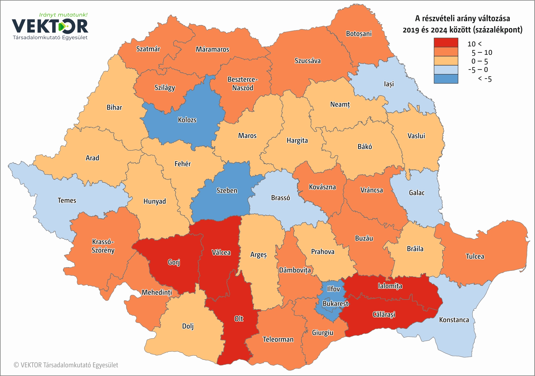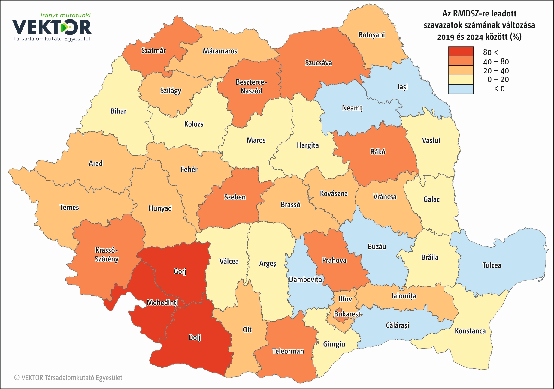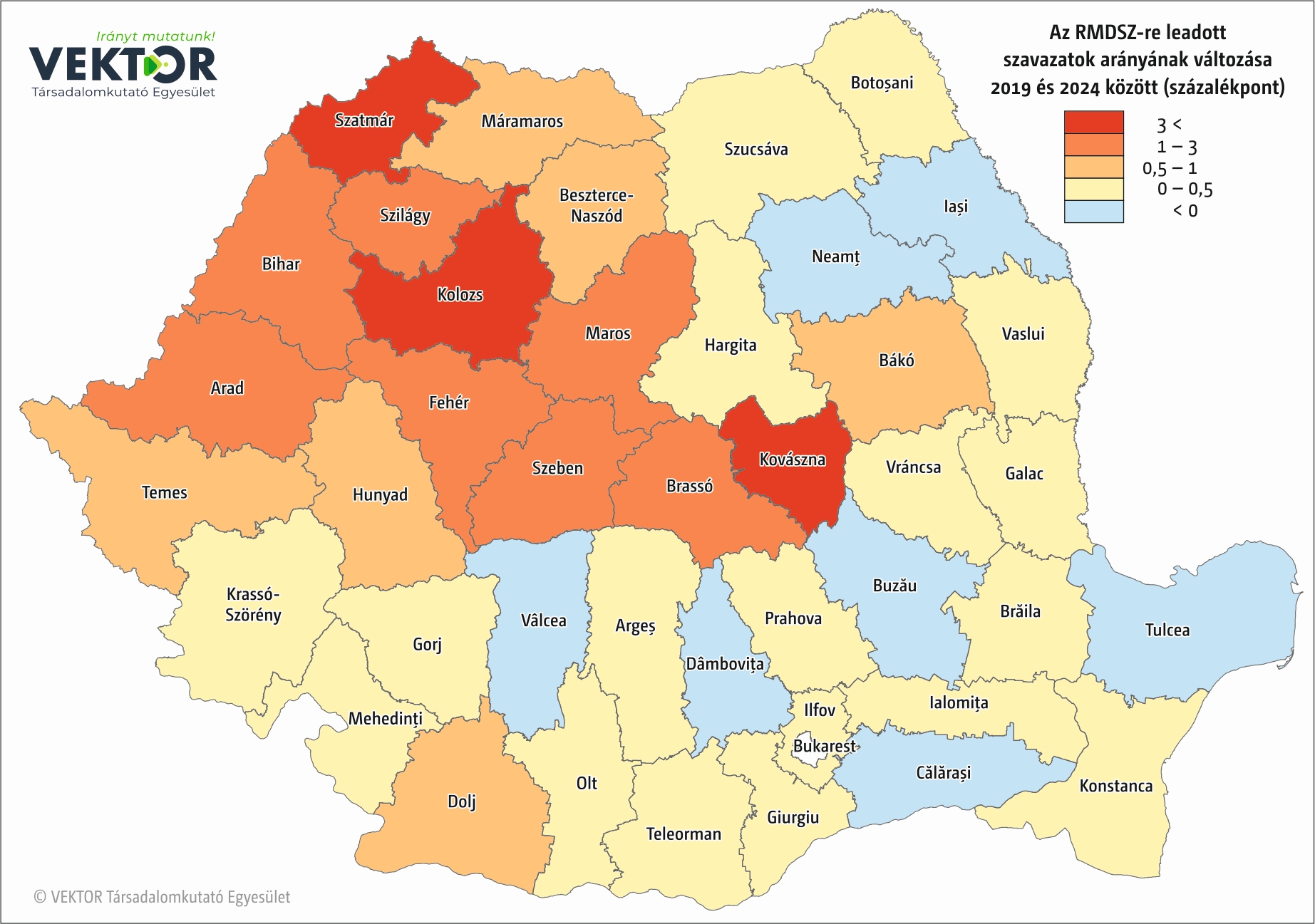 Nincs meglepetés abban, hogy mely megyékből kapta az RMDSZ a legtöbb voksot, meghatározza ezt a magyarok lélekszáma az adott megyében. Hargita megyében közel 112 ezer, Maros megyében 89 ezer, Kovászna megyében bő 64 ezer szavazatot szerzett. 2019-hez képest másfélszer több szavazatot szerzett Szatmár megyében, a 18 ezres voksszám növekedés a legnagyobb mértékű bővülést jelenti a megyék rangsorában. Maros és Kovászna megyékben nagyjából azonos számban, 12–13 ezerrel nőtt a szavazatok száma, Hargita megye ettől némiképp elmarad, ott 8500-zal voksoltak többen az RMDSZ-re, mint 2019-ben. Ennél több, 9500 új szavazatot kaptak Bihar megyében.