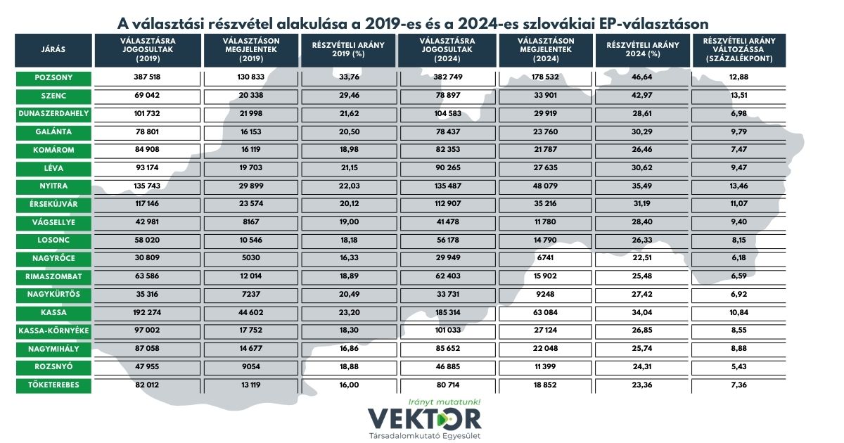 A 2024-es részvételi arányt mutató térképen jól látható, hogy a hagyományosan az átlag felett teljesítő nyugati, északnyugati járásokban ezúttal is nagyobb volt a szavazókedv, mint az ország többi részén. Országosan a pozsonyi választók voltak a legaktívabbak (46,7%), majd a Szenci járás lakosai következnek (43%). A magyarok által lakott járások szinte kivétel nélkül az országos részvételi átlag alatt teljesítettek. A Galántai, az Érsekújvári és a Lévai járások 30–31% körüli, a szlovákiai átlaghoz közelítő eredménye sem azt jelenti, hogy itt a magyar szavazók némileg aktívabbak lennének. Ugyanis a települési adatokból kirajzolódik, hogy a legtöbb esetben igaz az az állítás, hogy minél több magyar él egy településen, annál kisebb arányban járultak az urnákhoz a választók. A magyar többséggel rendelkező Dunaszerdahelyi járásban 28,6%, a Komáromiban 26,5% volt a részvétel. Sokatmondó tény, hogy az országos szinten a 10 legkisebb választói aktivitást mutató járásból 8 a déli járások közül került ki.