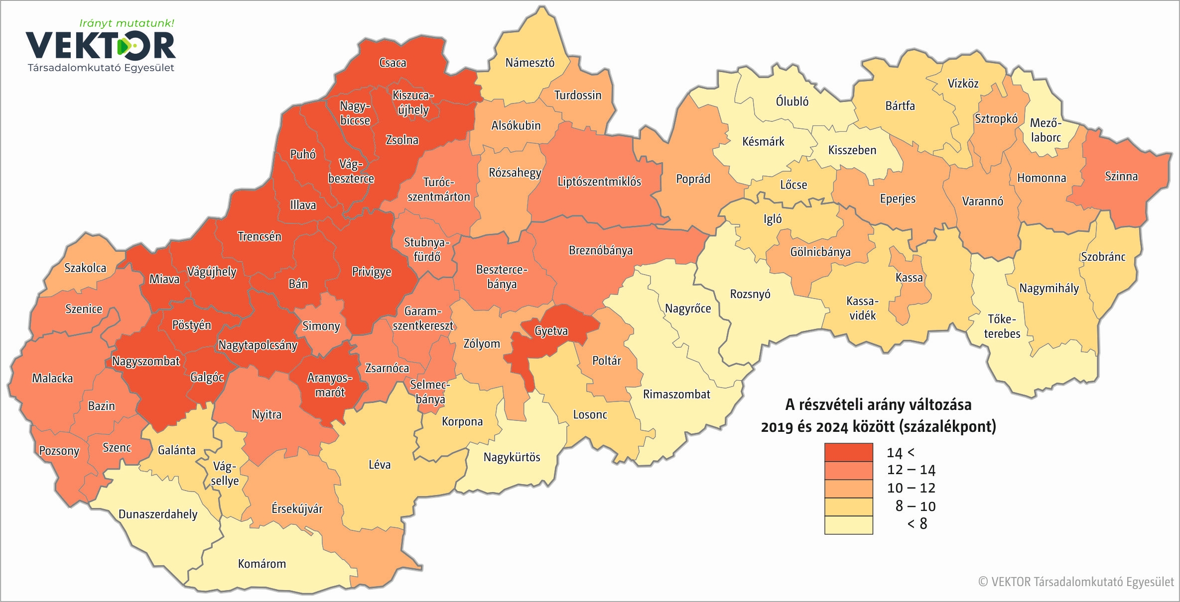 Országos szinten tehát jelentősen, közel 12 százalékponttal volt magasabb a részvétel a szlovákiai EP-választáson, mint 2019-ben. Ez a növekedés azonban jelentős területi különbségeket mutat.